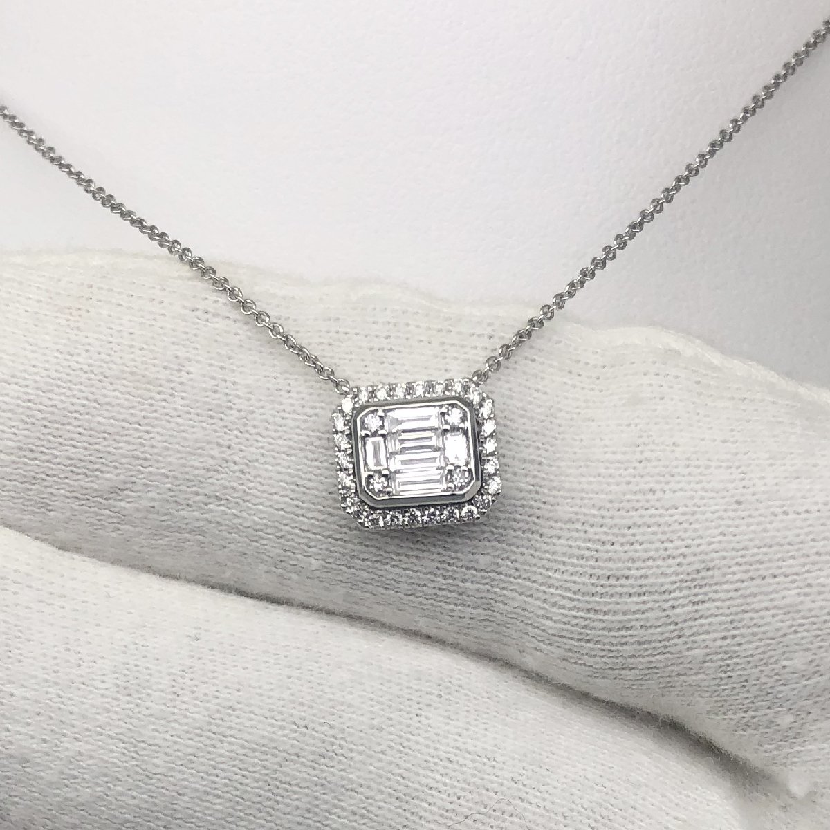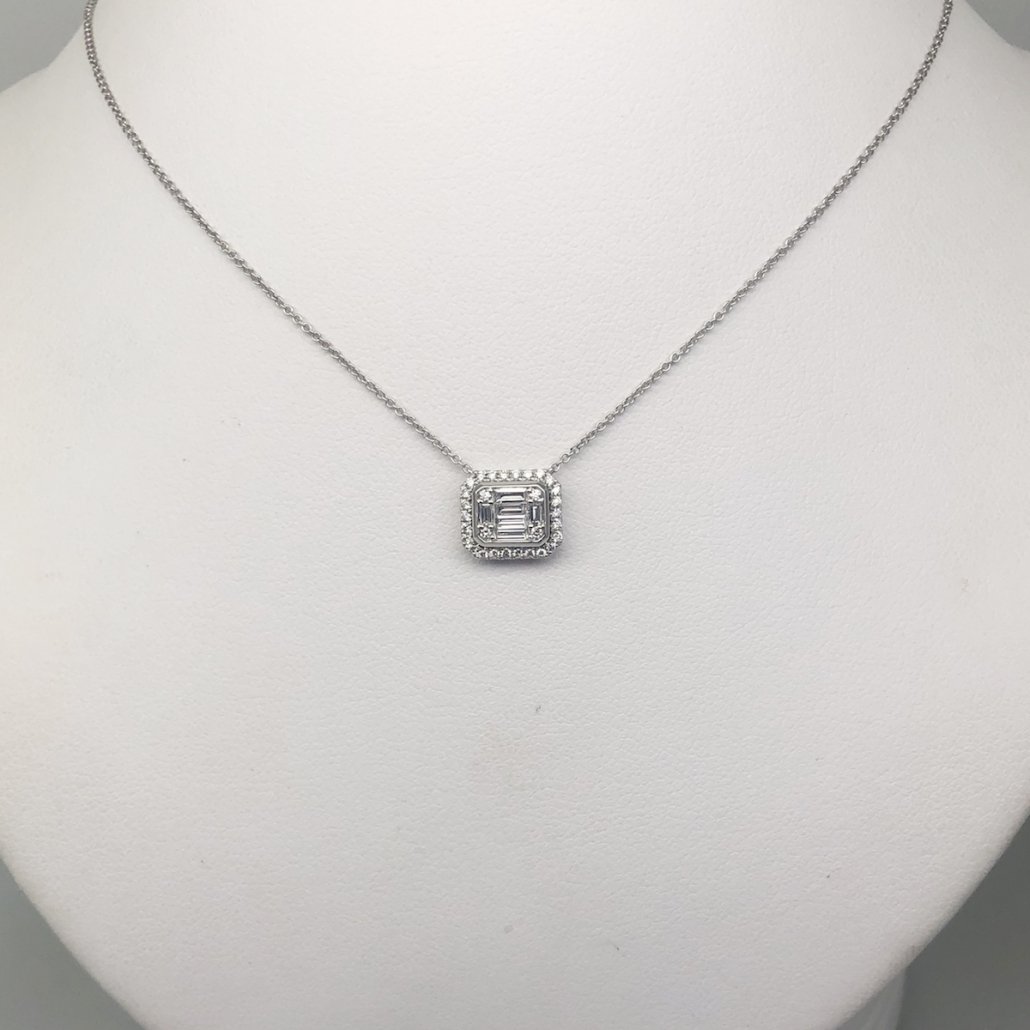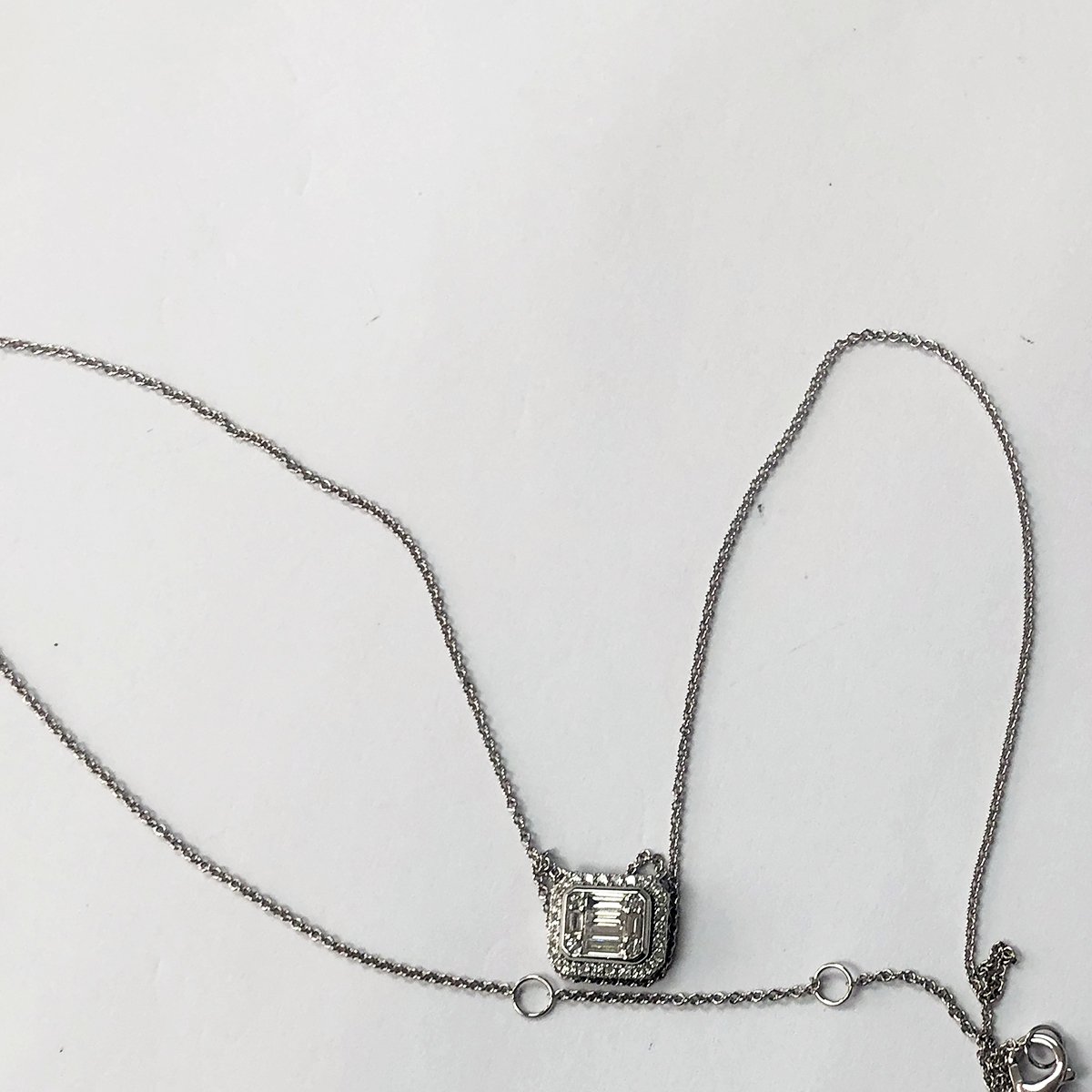 36 Diamonds Set In A Rectangular Halo Adorn this 14 K White Gold Necklace bringing a unique sparkle to her neckline.