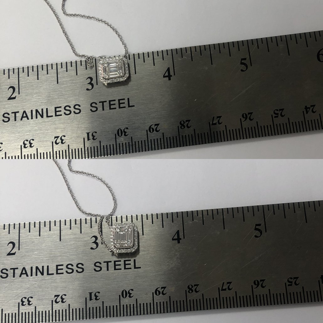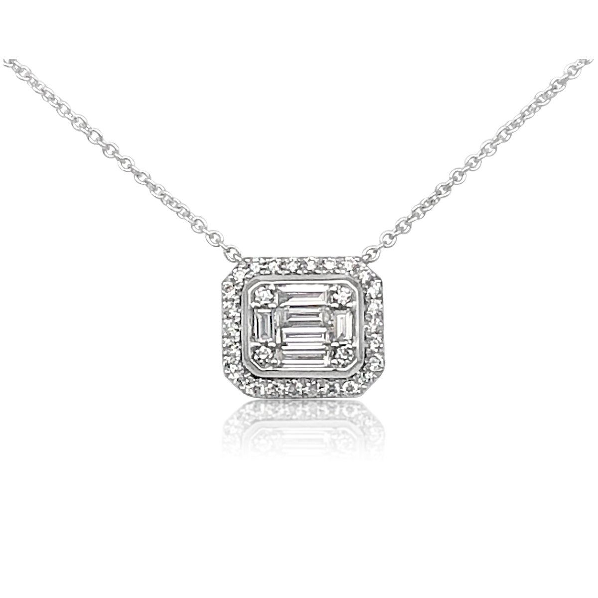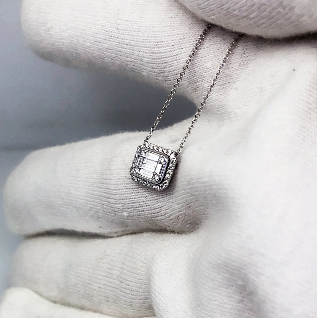36 Diamonds Set In A Rectangular Halo Adorn this 14 K White Gold Necklace bringing a unique sparkle to her neckline.