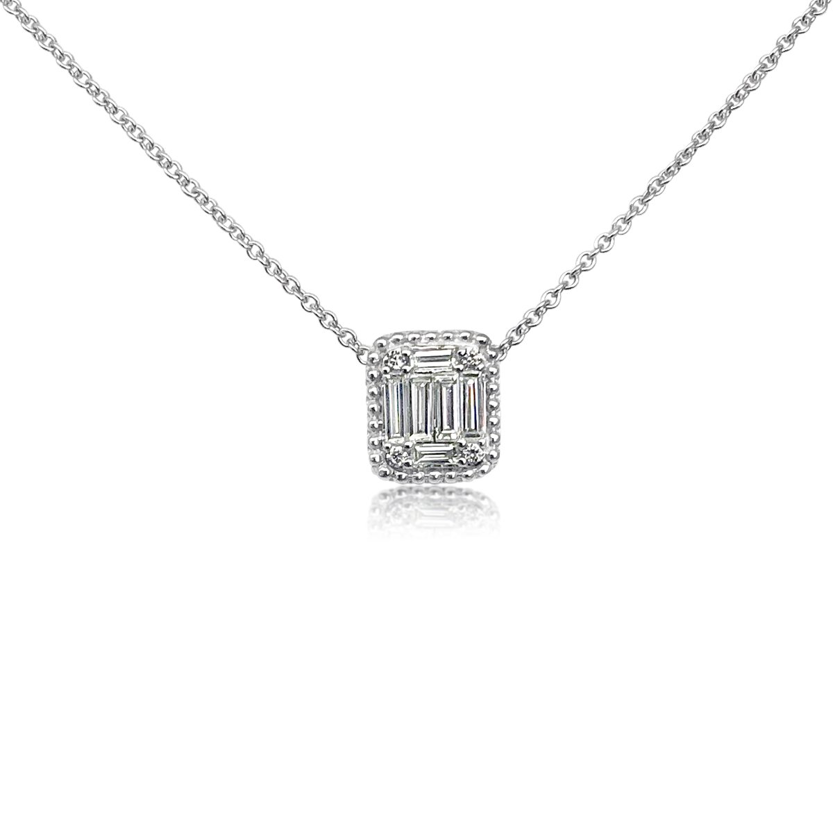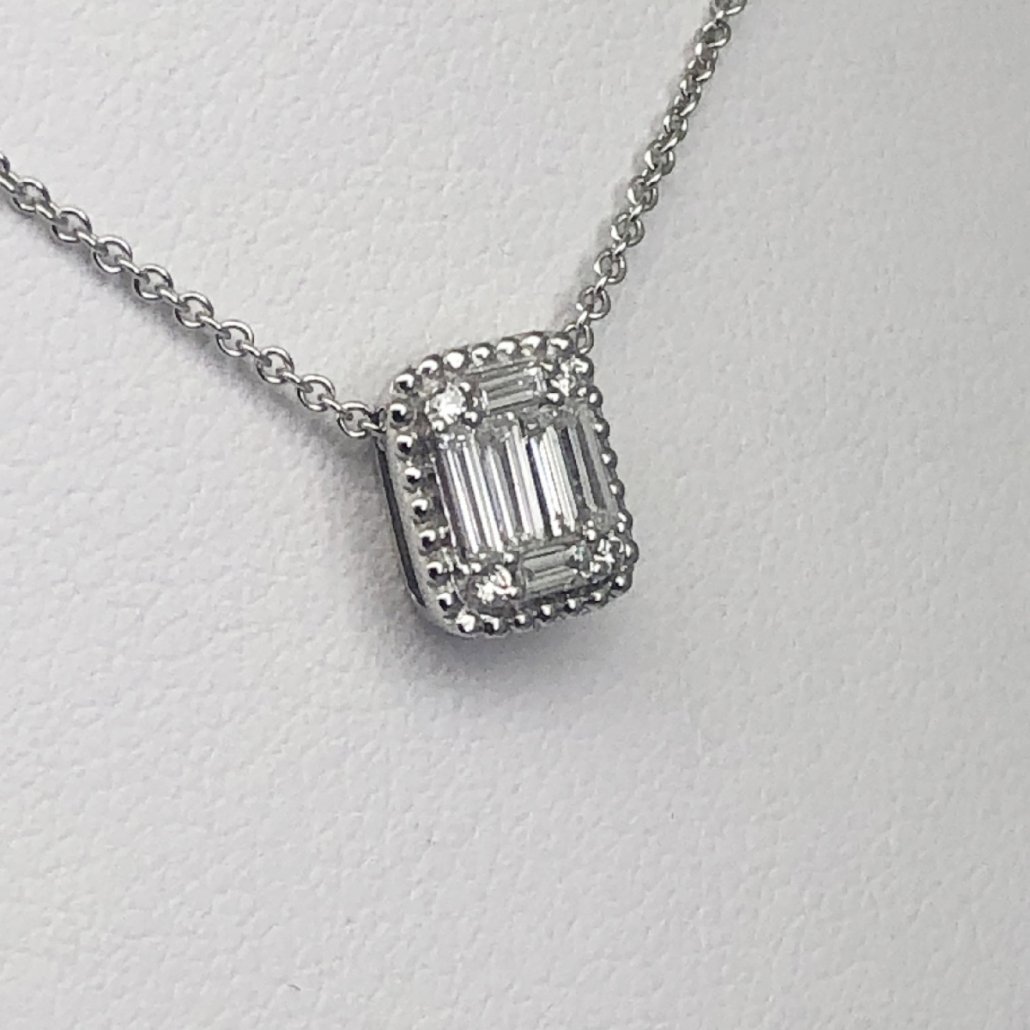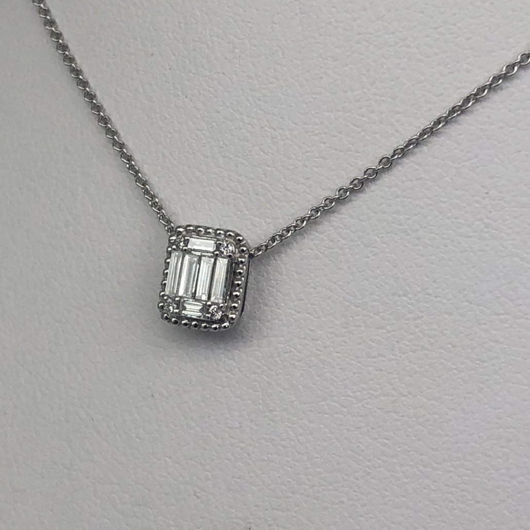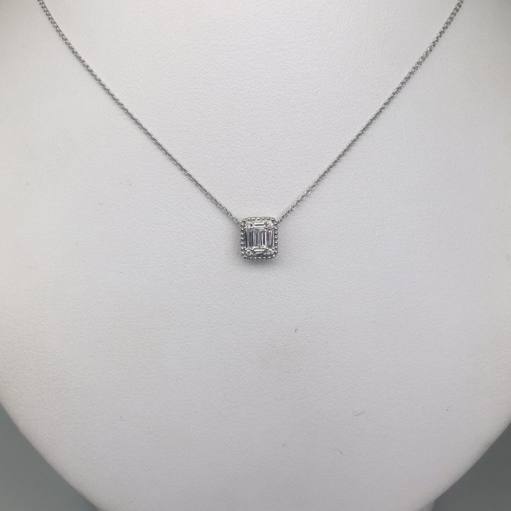 10 Diamonds Set In A Rectangular Halo Adorn this 14 K White Gold Necklace bringing a unique sparkle to her neckline.
