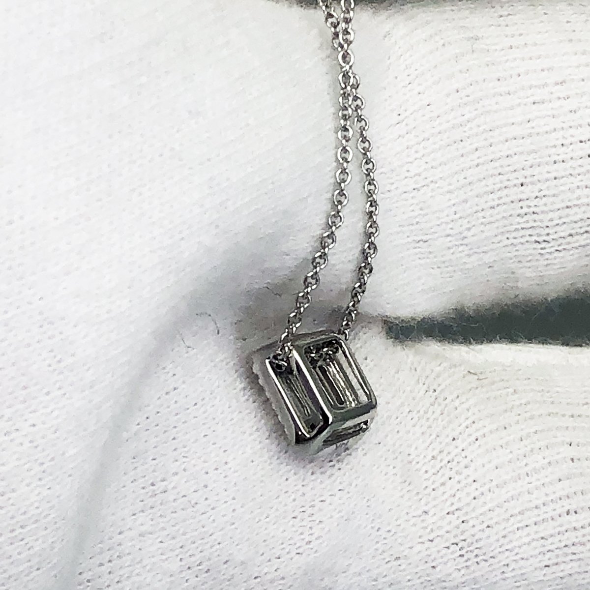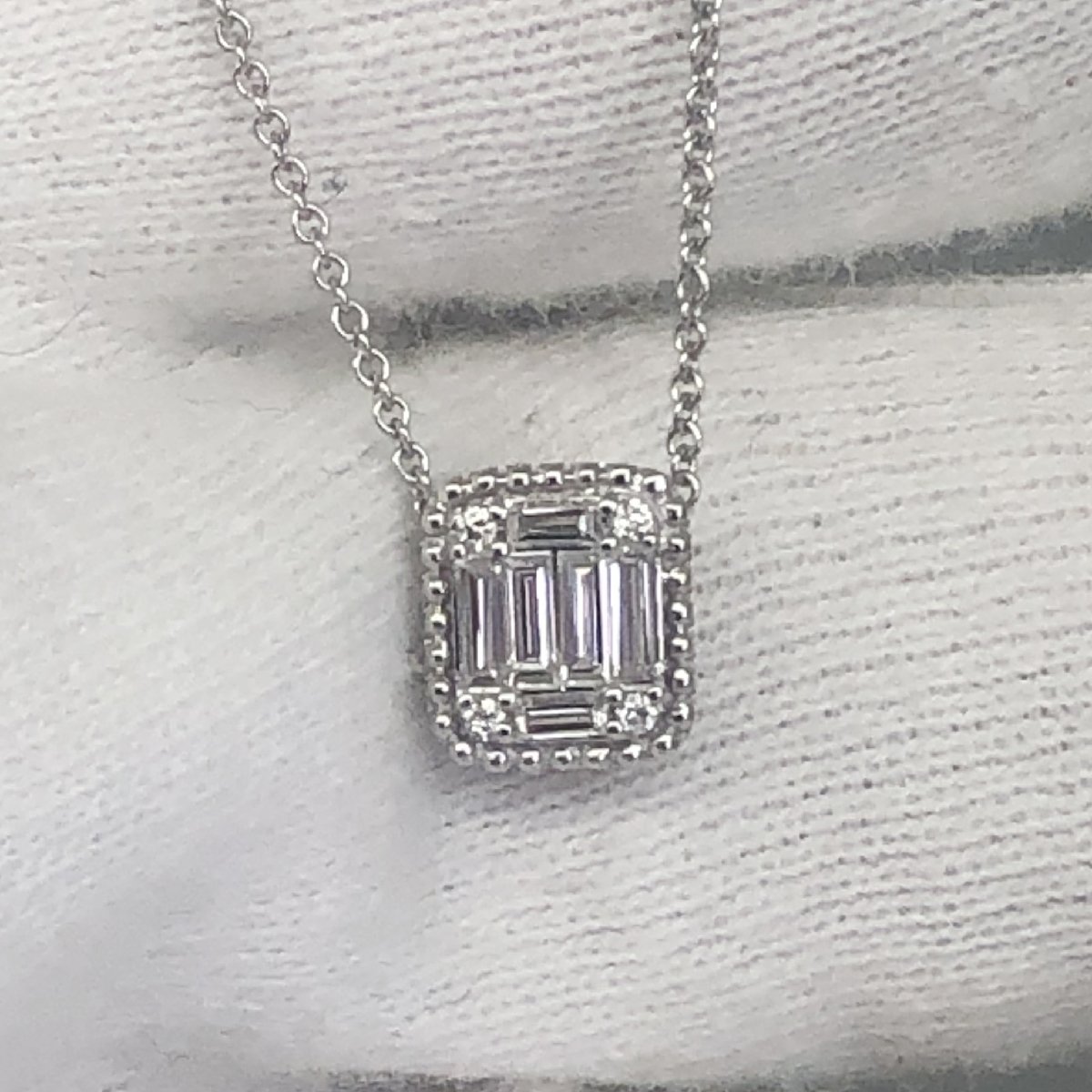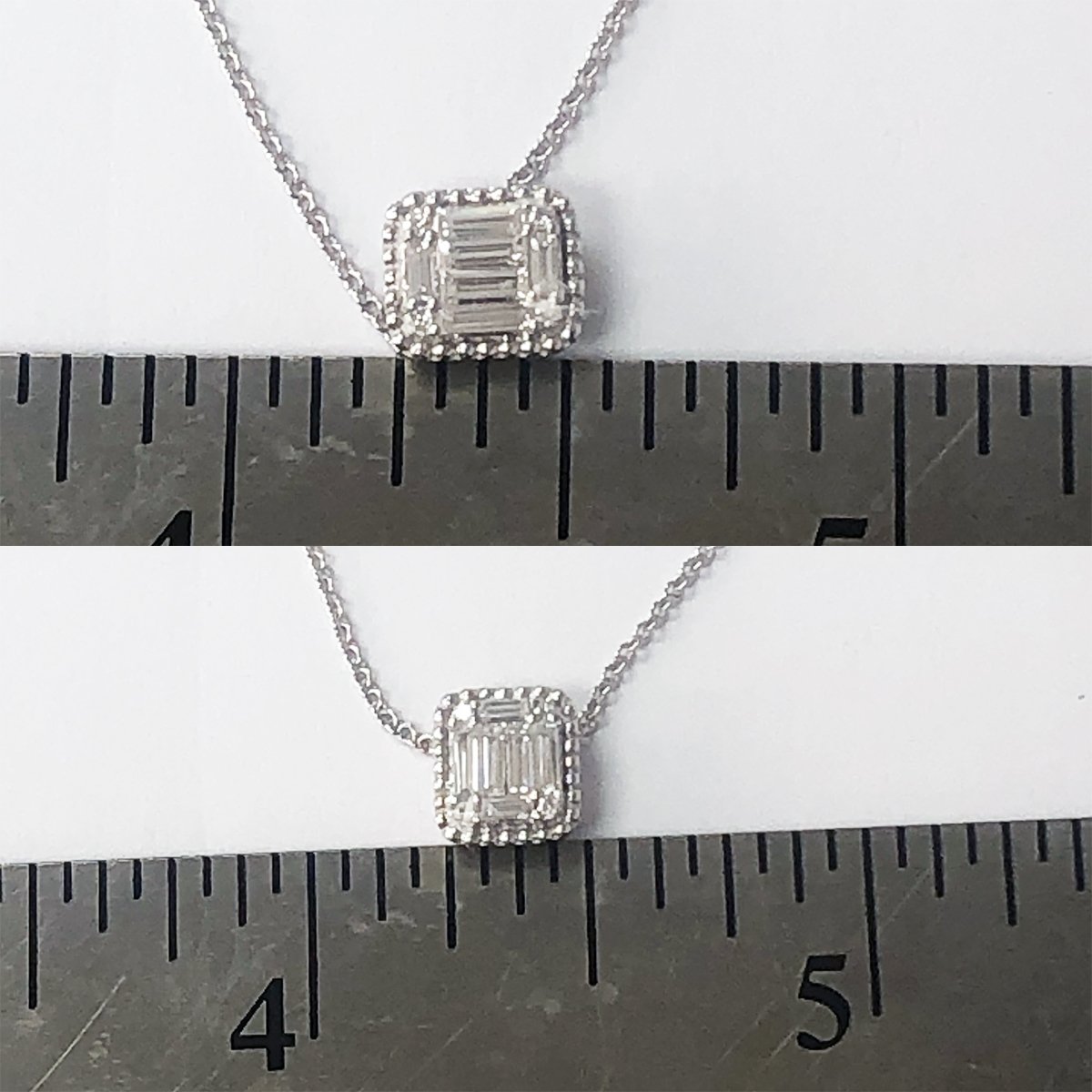 10 Diamonds Set In A Rectangular Halo Adorn this 14 K White Gold Necklace bringing a unique sparkle to her neckline.