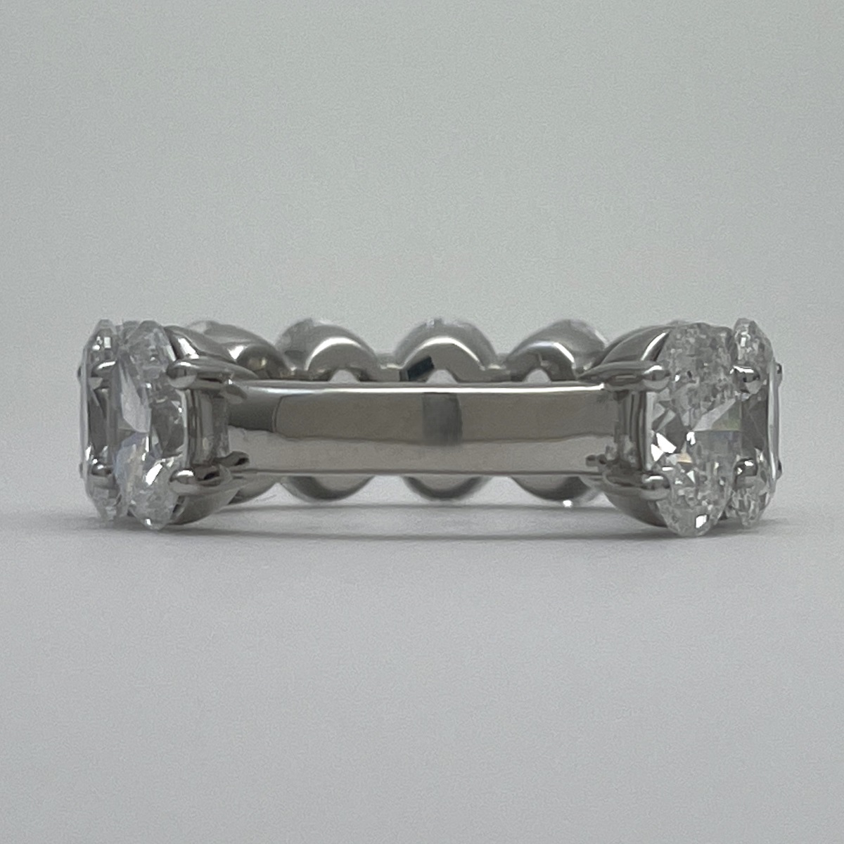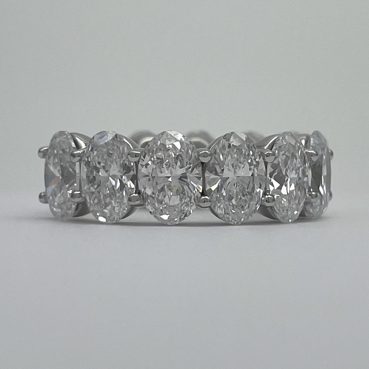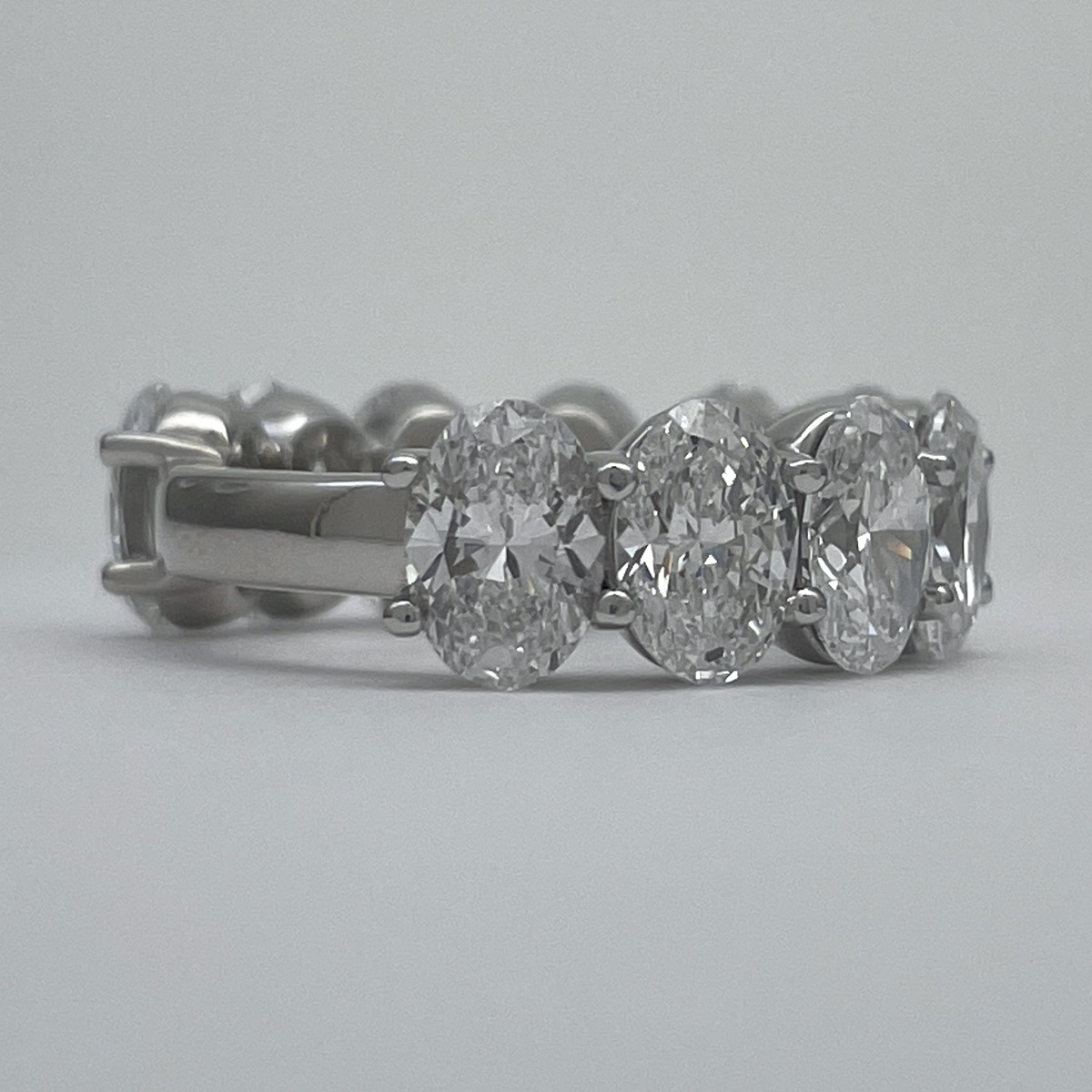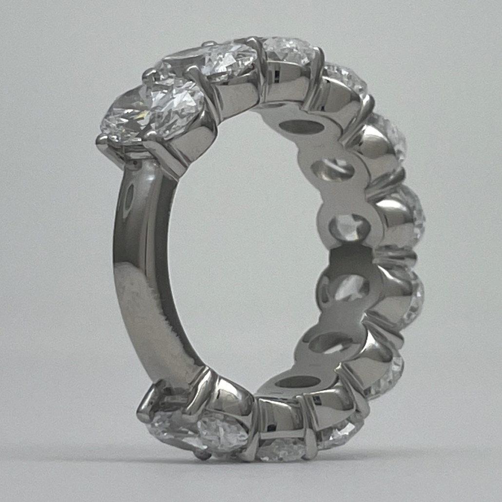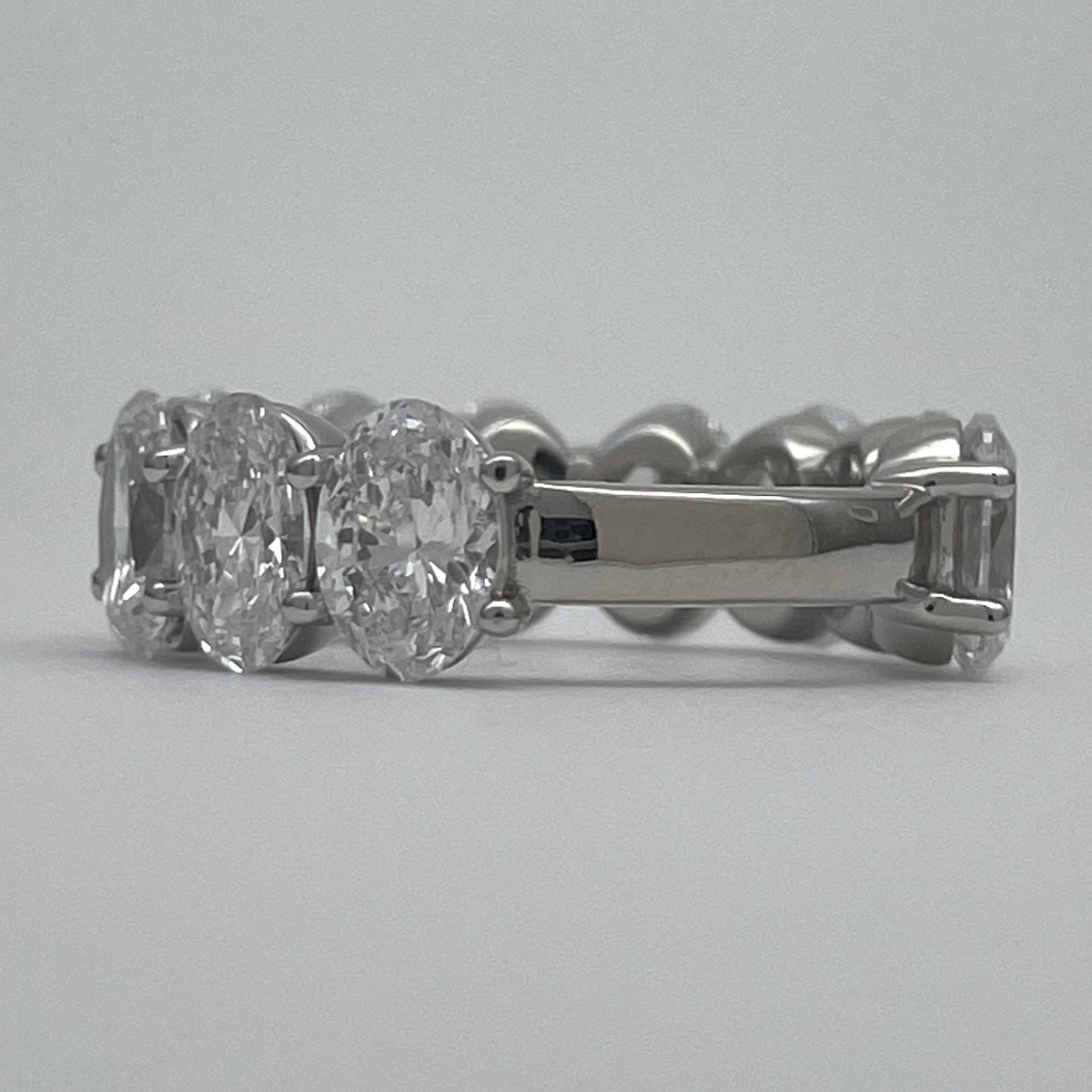 Oval-cut diamonds sparkle endlessly in this handcrafted platinum eternity band.