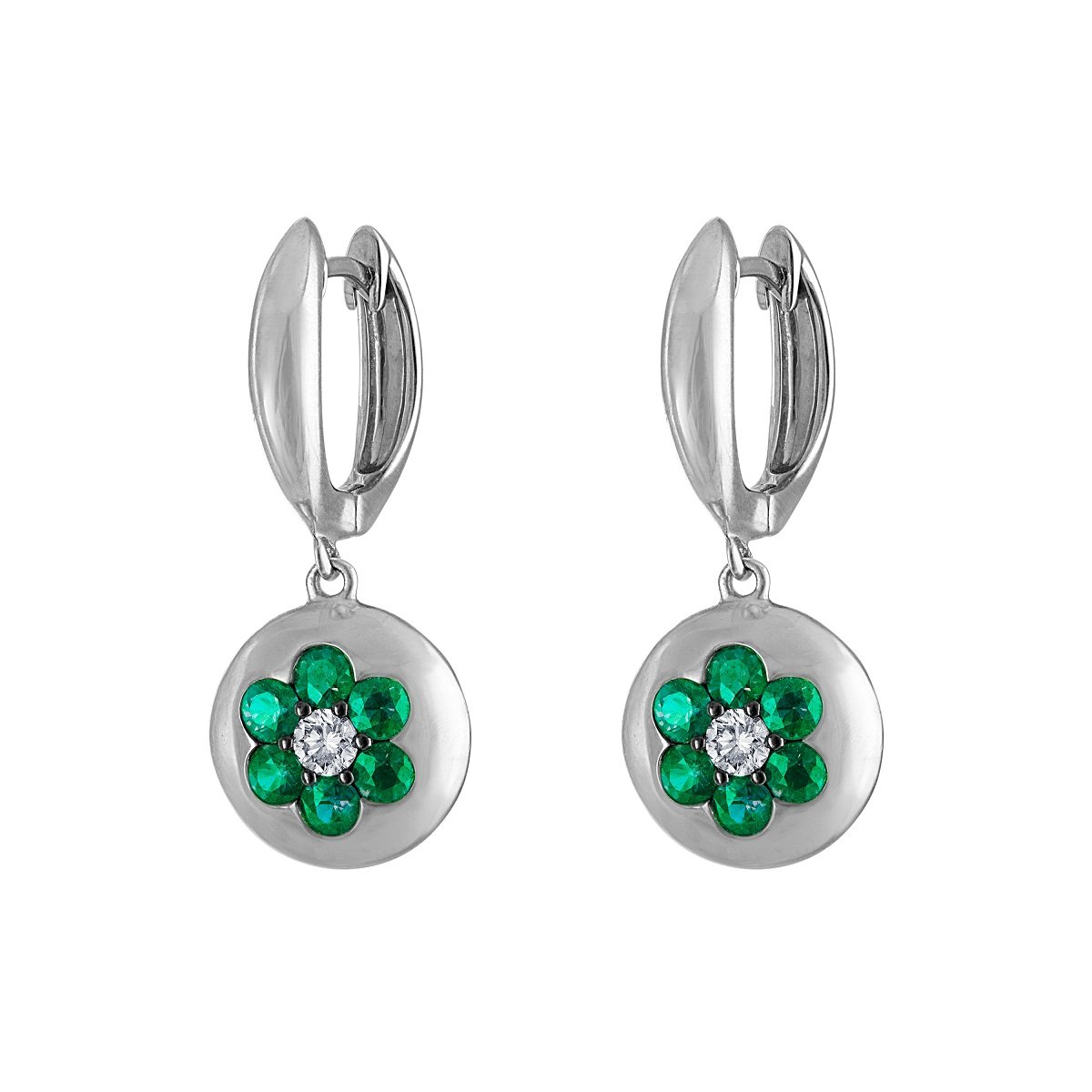 Tags Custom Made, Diamond and Emerald Drop Earring, Emerald and Diamond Flower Design, emeralds, Fine Jewelry, May Birthday, May Birthstone, Puff Circles with Gemstone Flowers
