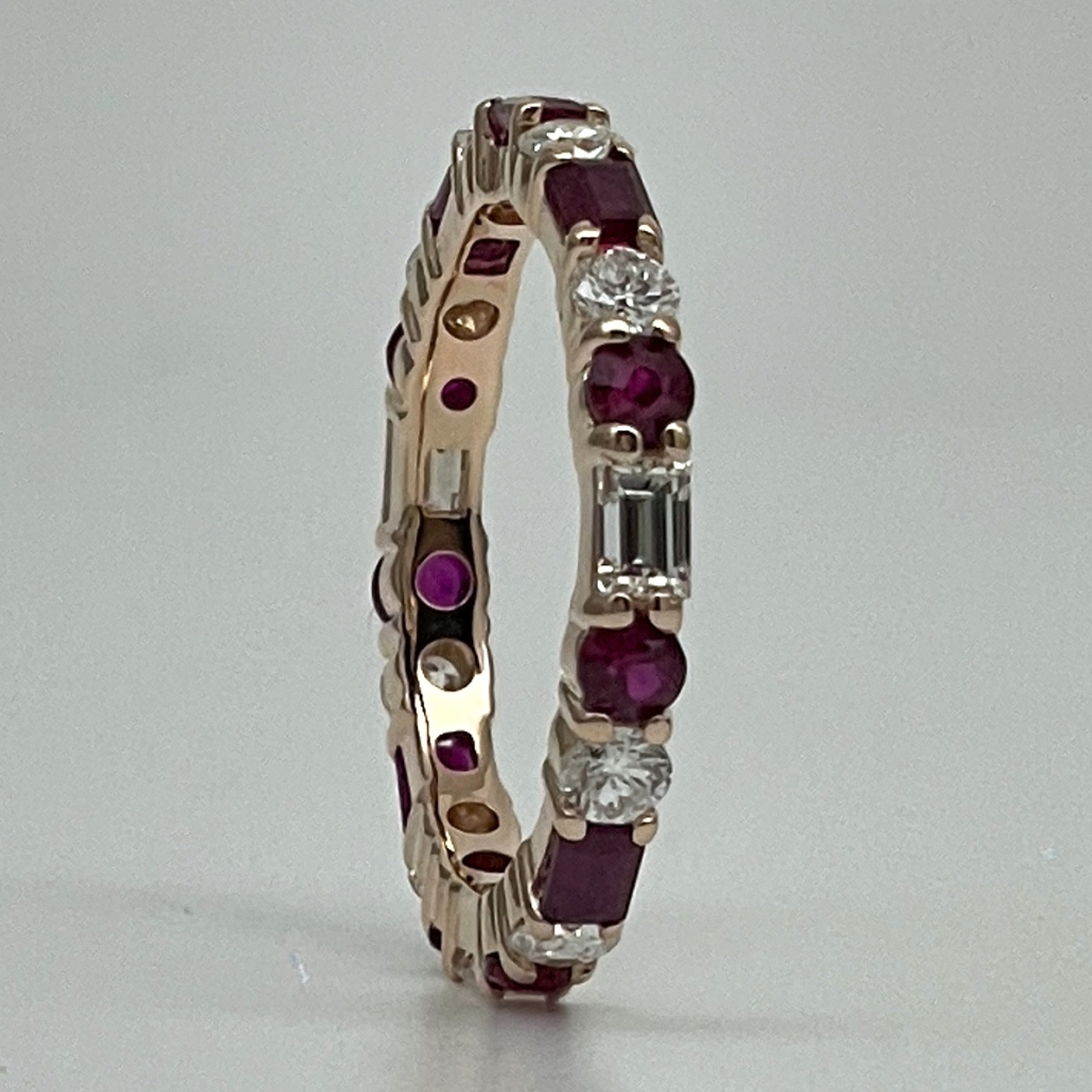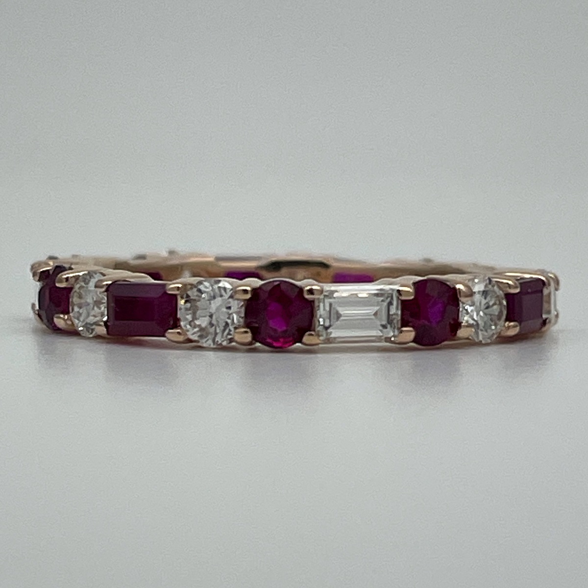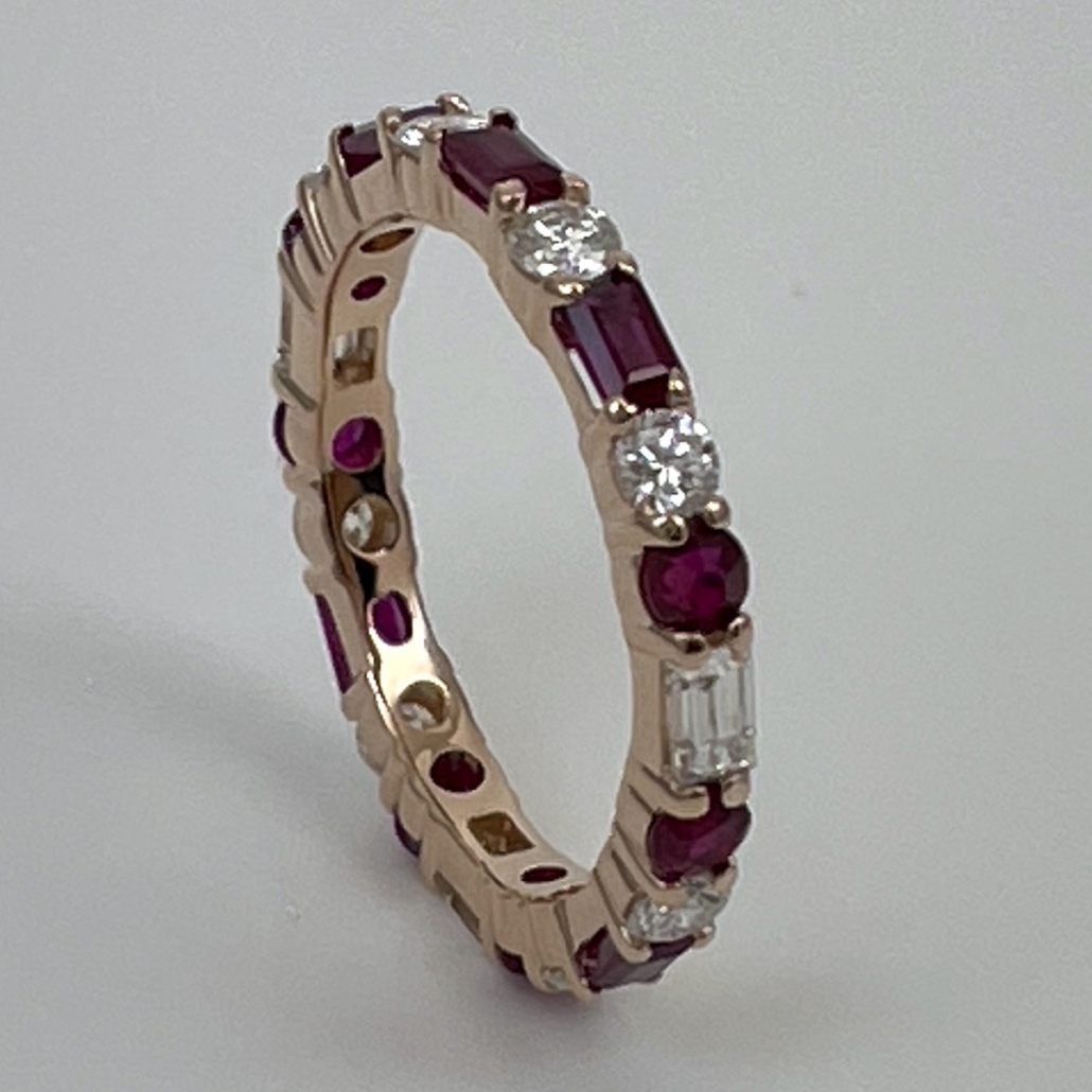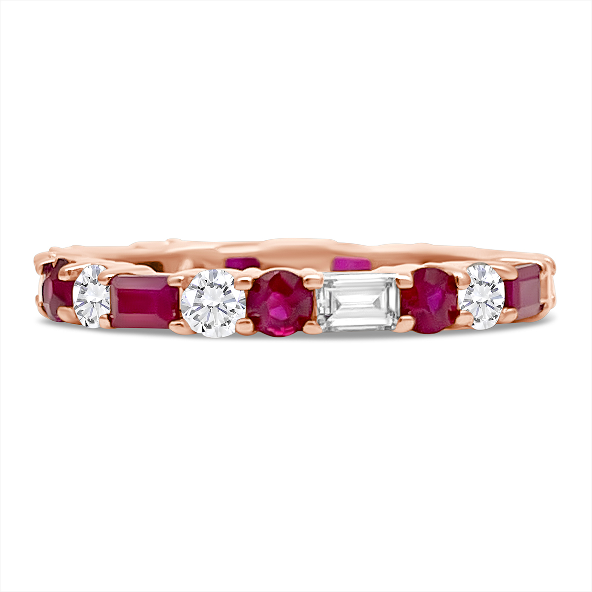 Tags 14k Pink, 14k Rose, baguette, Band, Diamond, Eternity, gemstone, Multi-Shape, Ring, Round, Ruby