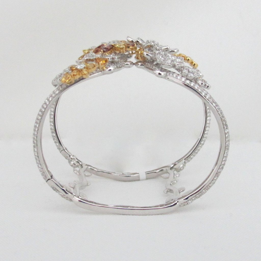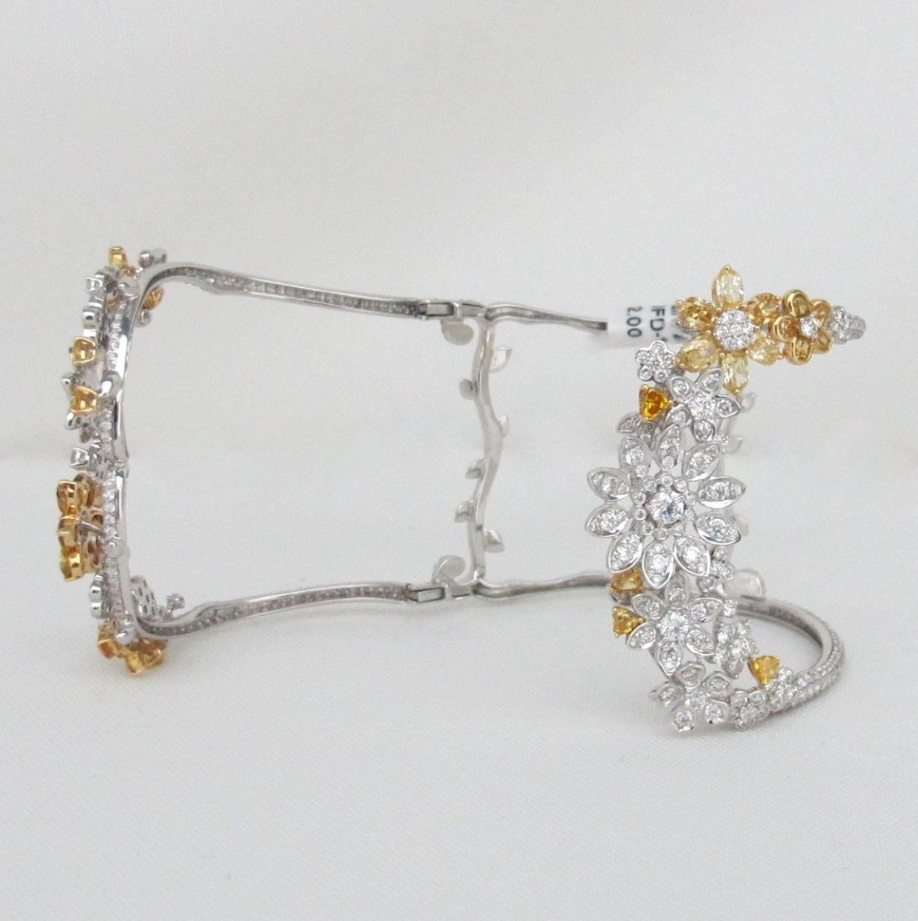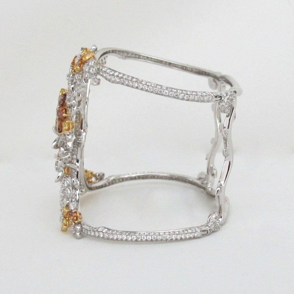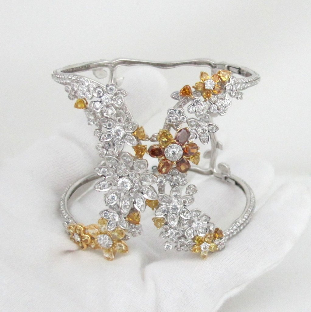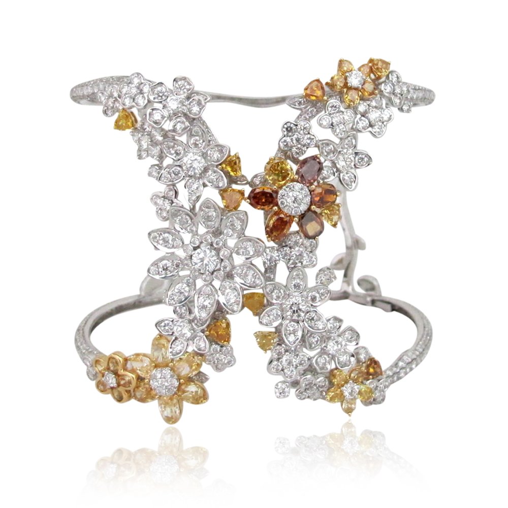 Tags Cuff Bracelet, Diamond Bangle, Diamond Bracelet, Diamond Cuff Bracelet, Diamond Flower, Diamond Flower Bracelet, Flower Bracelet, flower design, Flower Design Bracelet, Orange Diamond, Orange Diamond Jewelry, White Gold Cuff Bracelet, Yellow Diamond, Yellow Diamond Jewelry