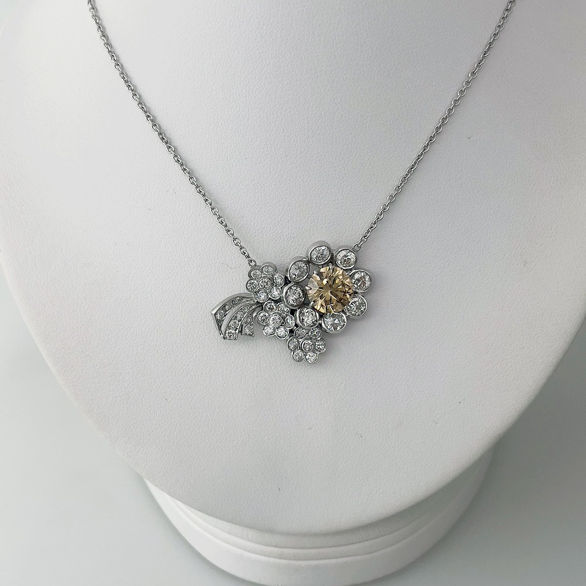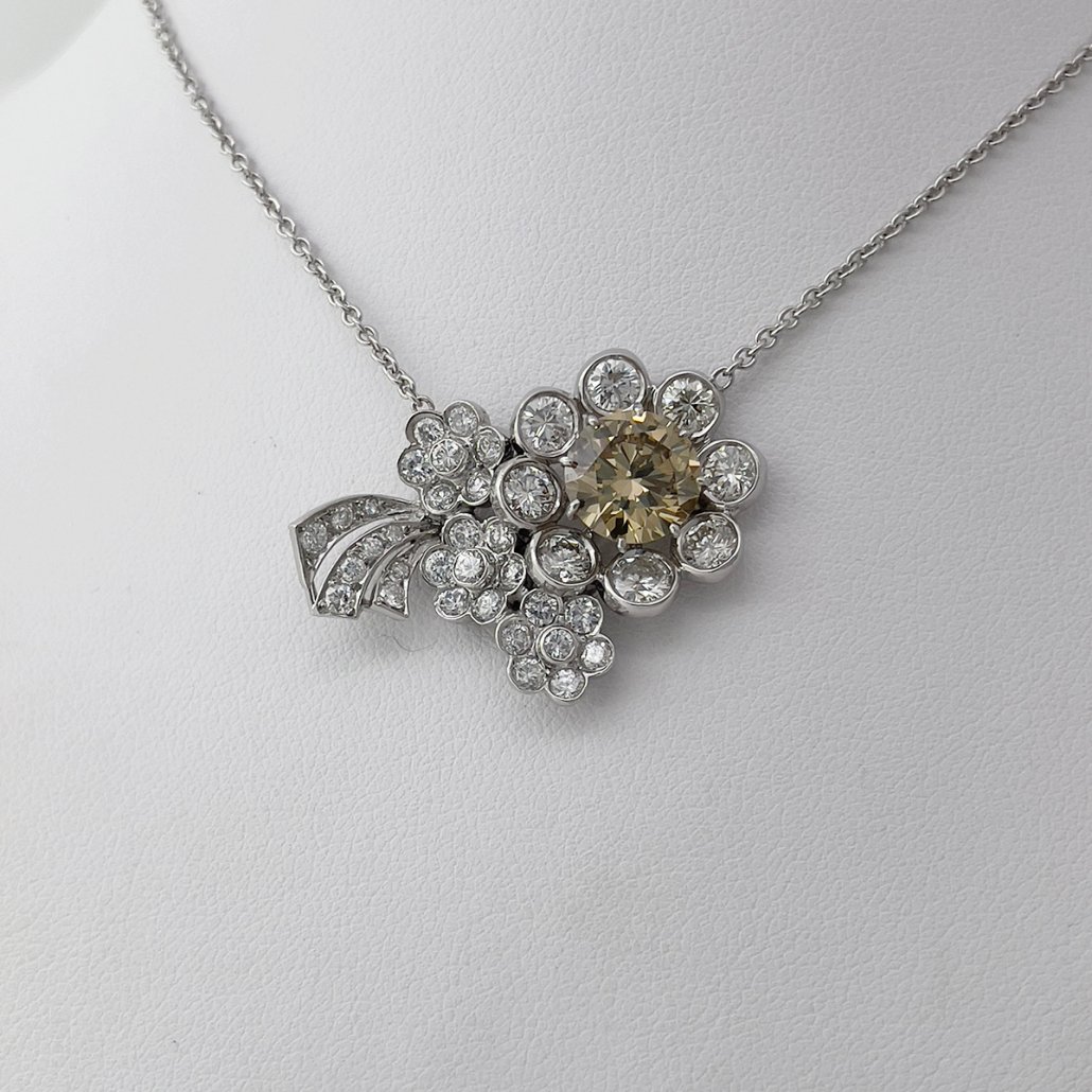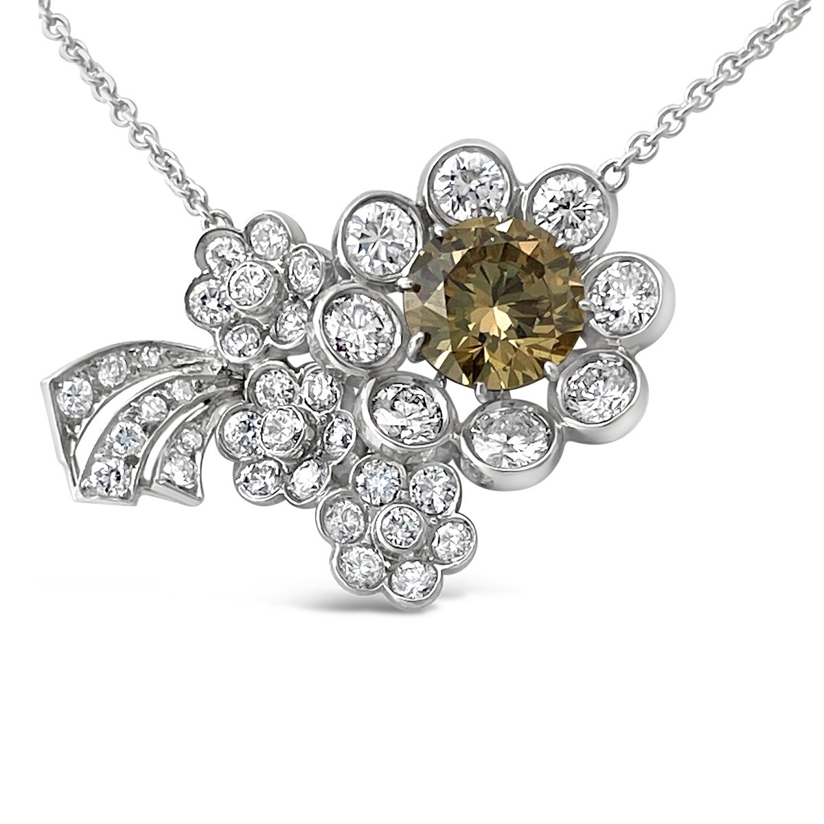 This masterpiece showcases a special, GIA Certified Fancy Colored Diamond Stone as the center of a custom flower, set in platinum and mounted on a chain.