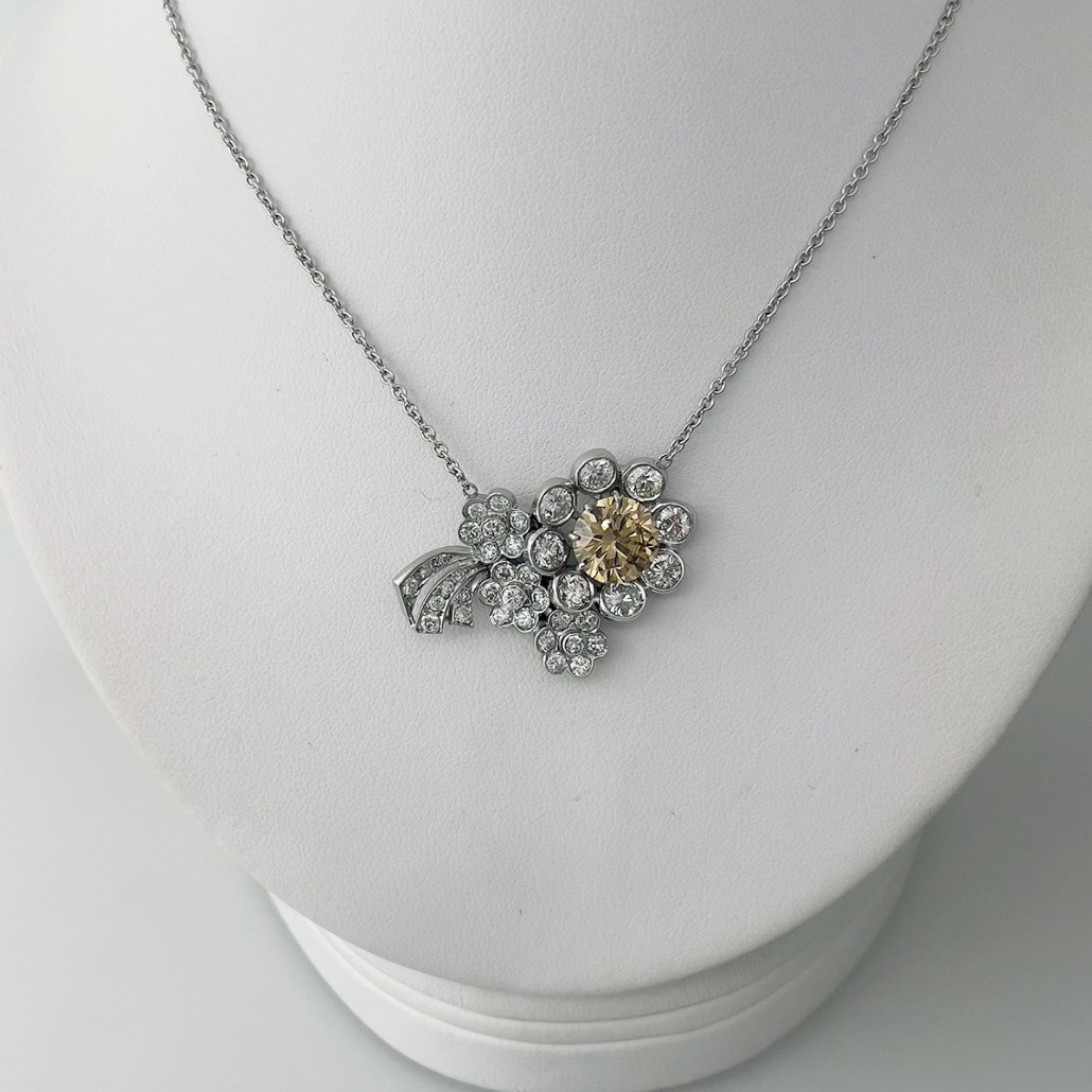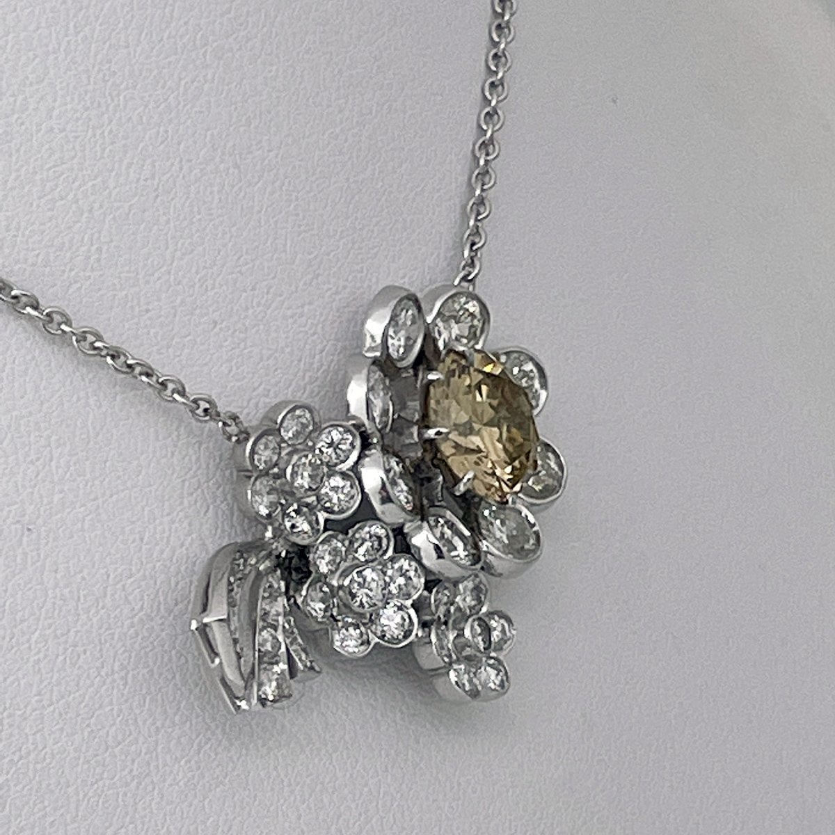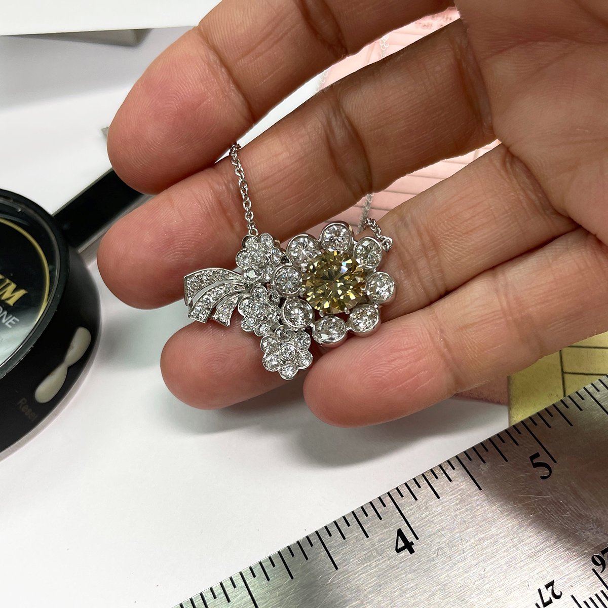 This masterpiece showcases a special, GIA Certified Fancy Colored Diamond Stone as the center of a custom flower, set in platinum and mounted on a chain.