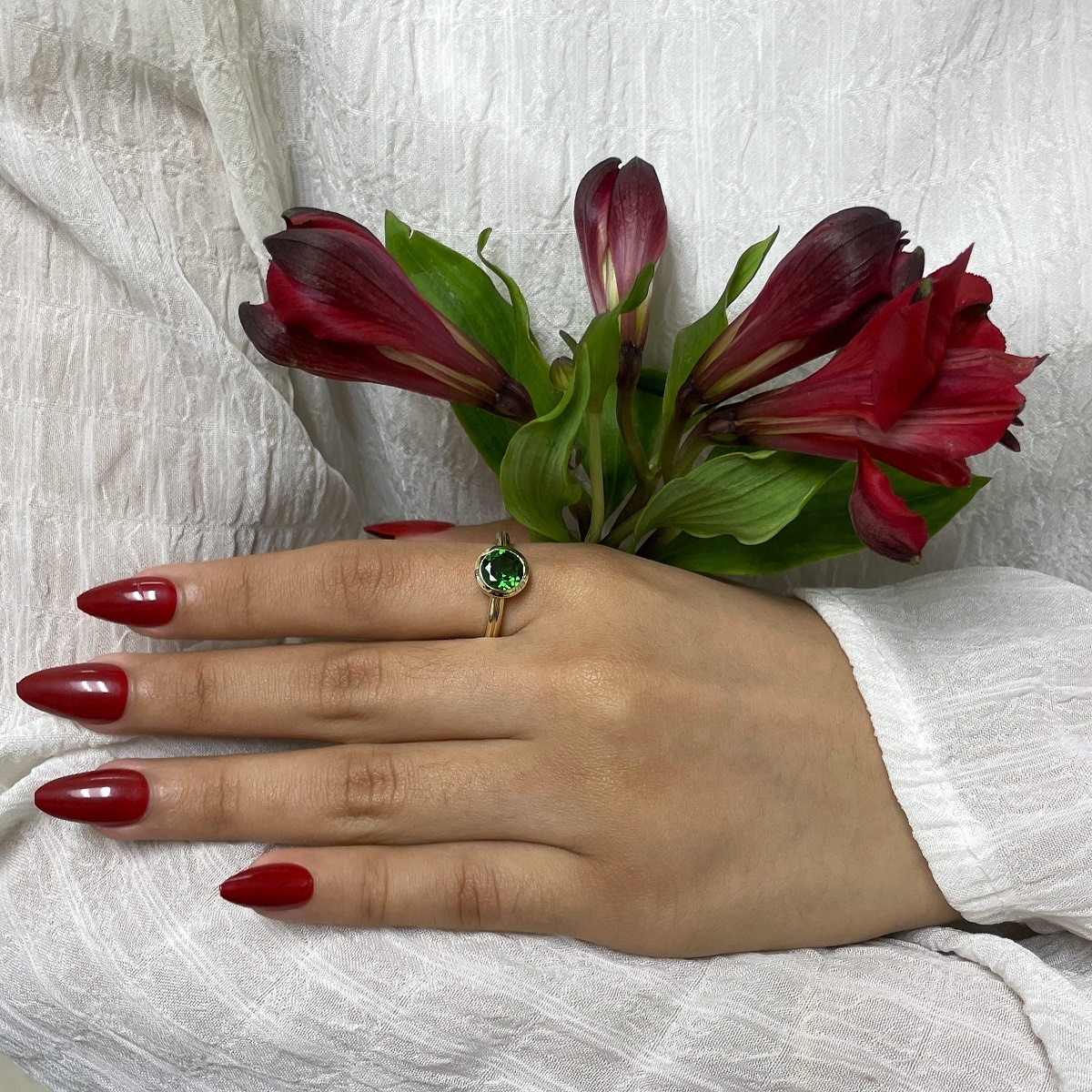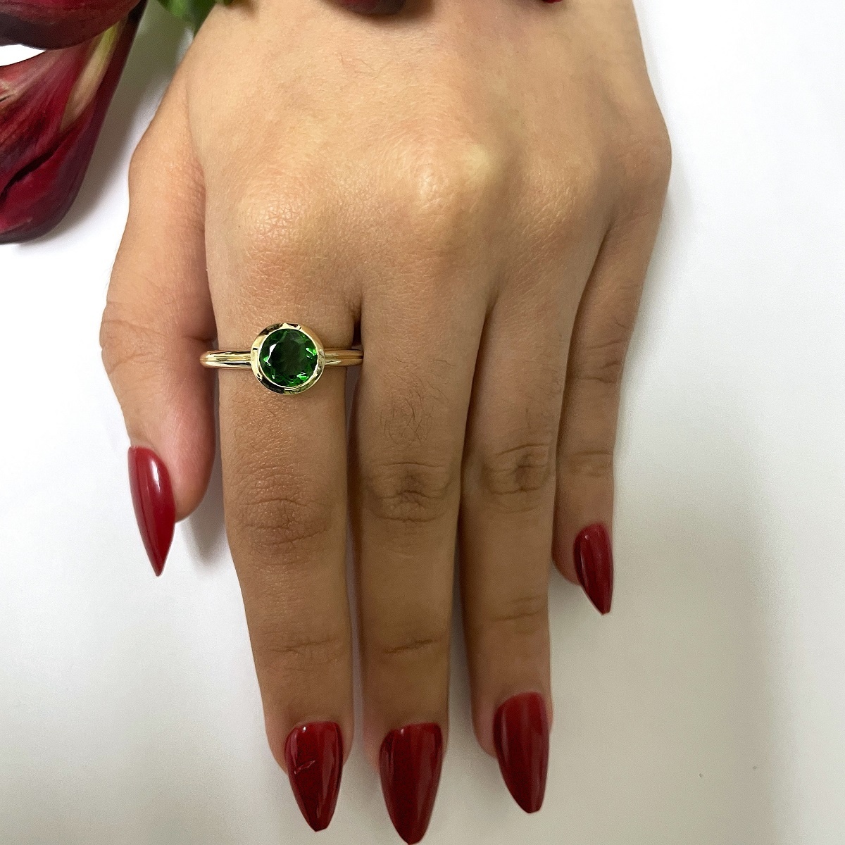 Bold yet refined, the Forest Glow Solitaire brings together the earthy beauty of green round emerald and the golden embrace of 14k yellow gold.