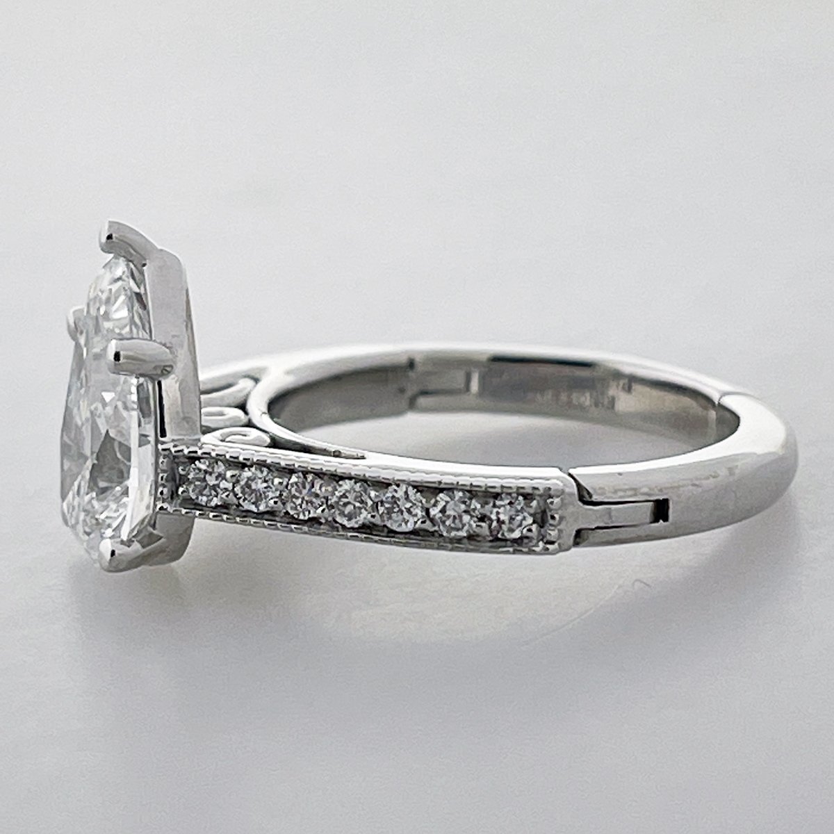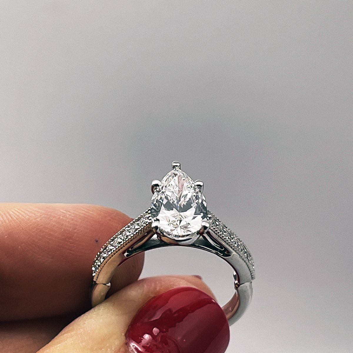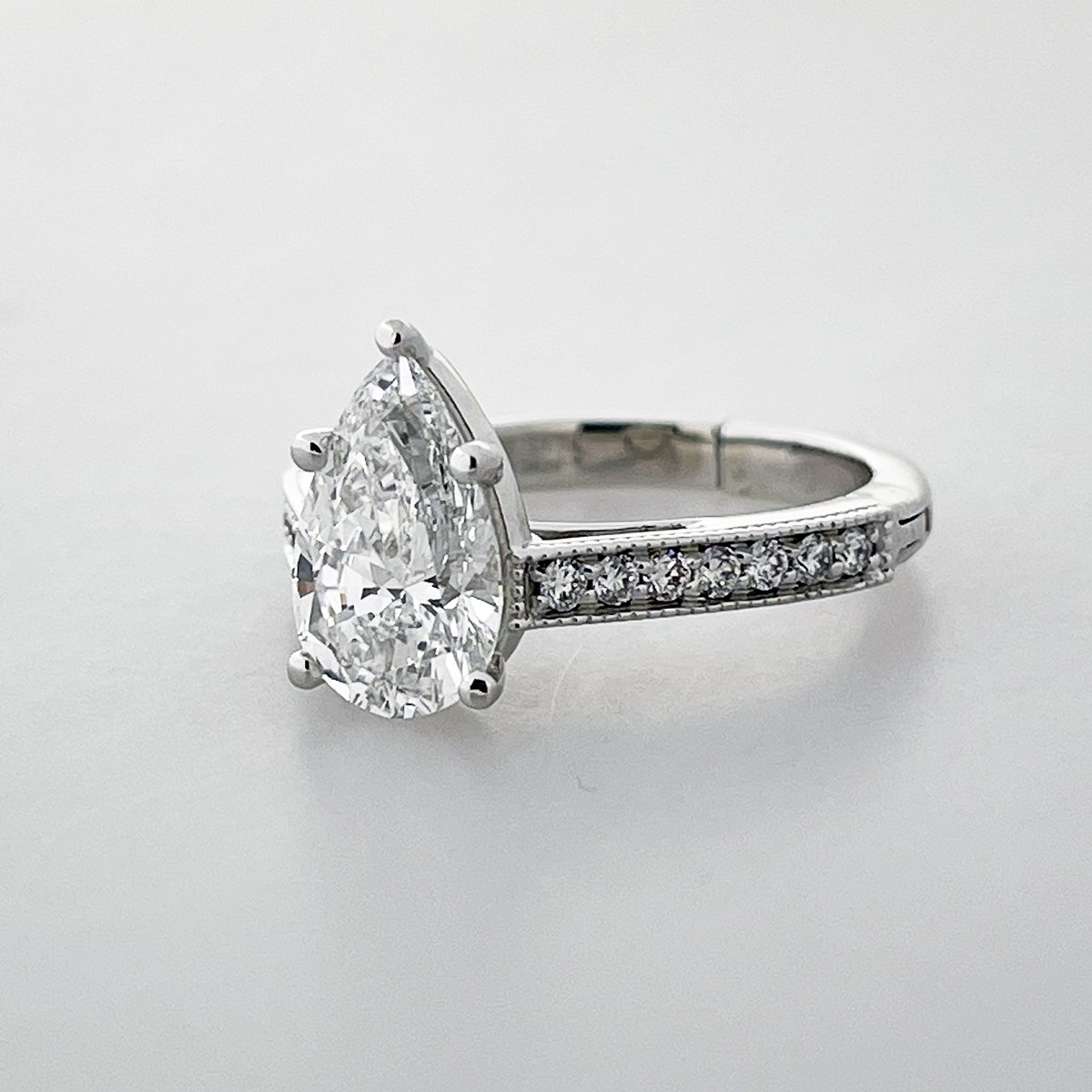 This pear shaped, diamond. The sparkle is captivating. Milgrain accents on the shank highlight the channel set diamonds.