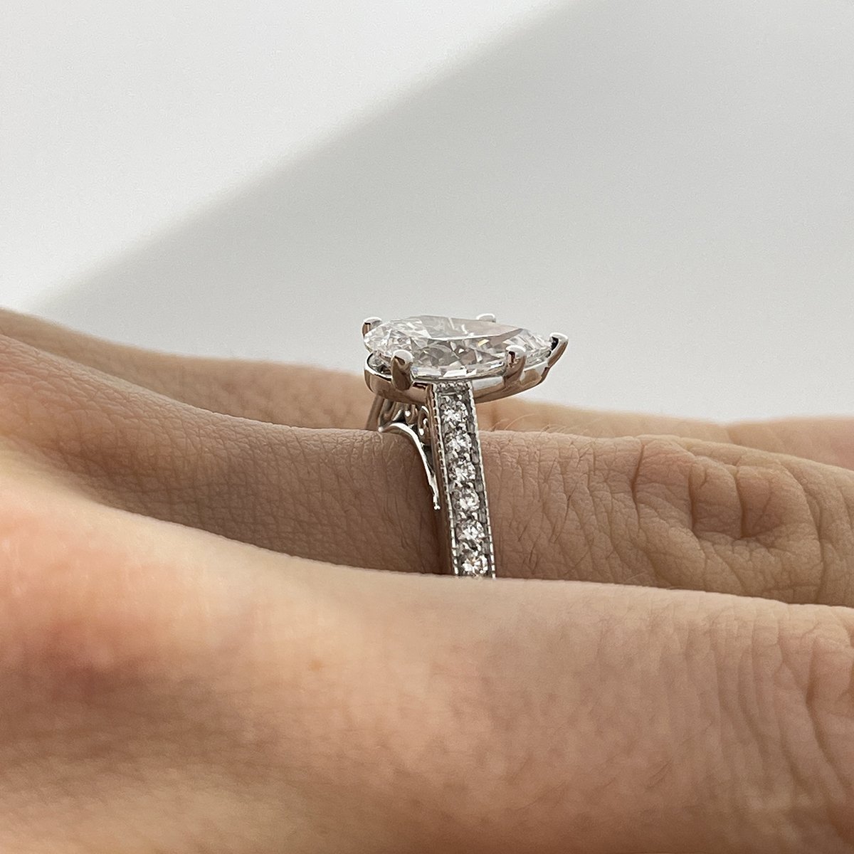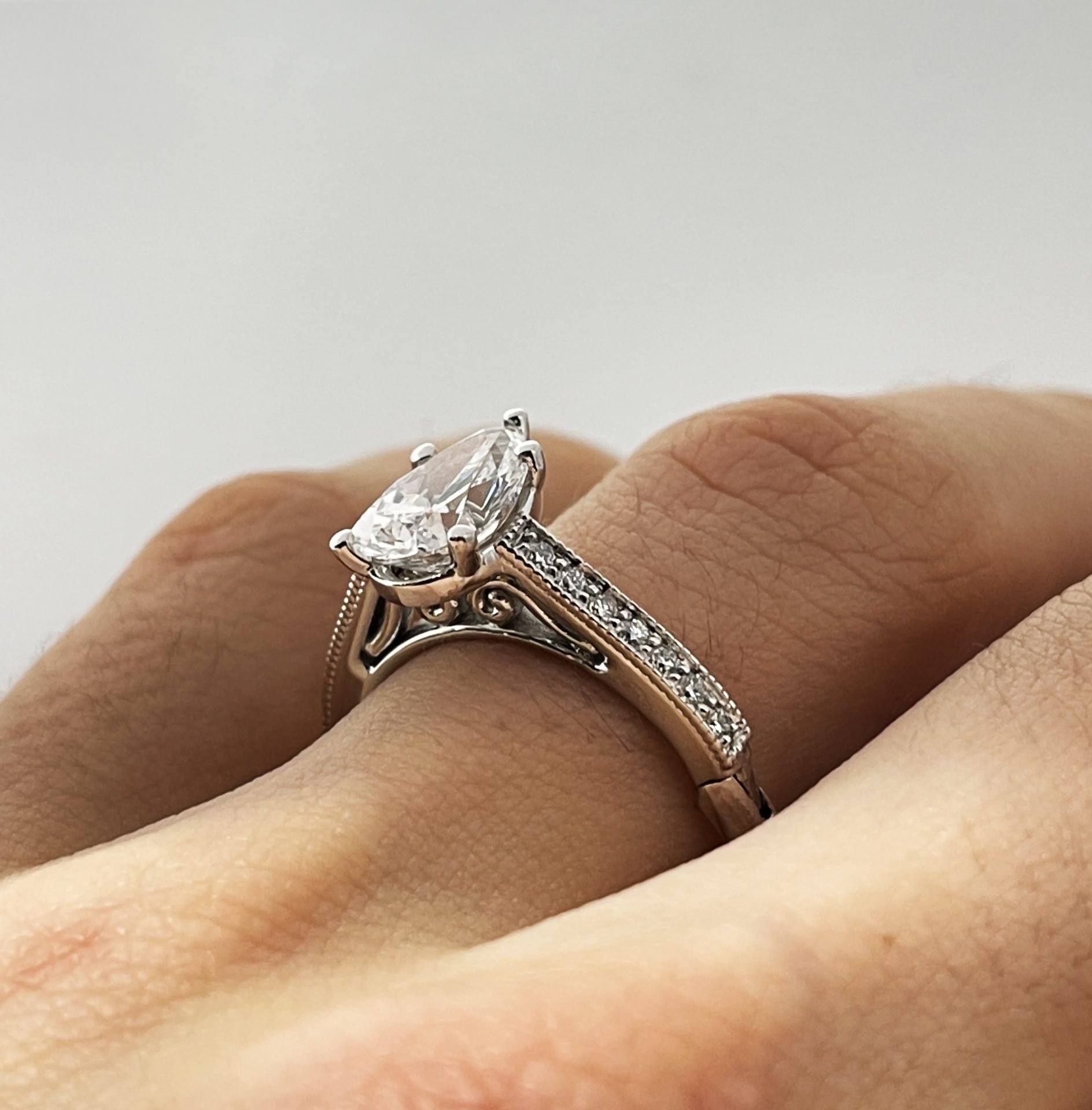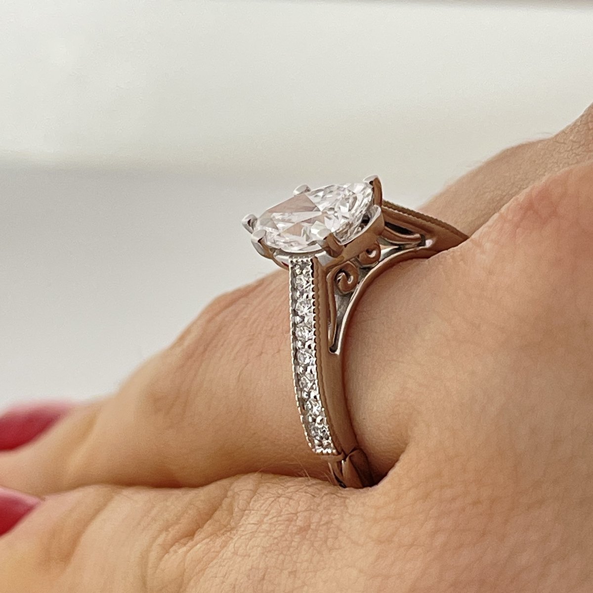 This pear shaped, diamond. The sparkle is captivating. Milgrain accents on the shank highlight the channel set diamonds.
