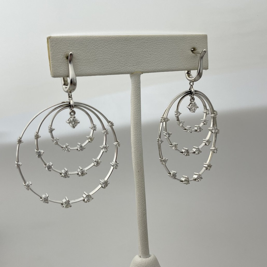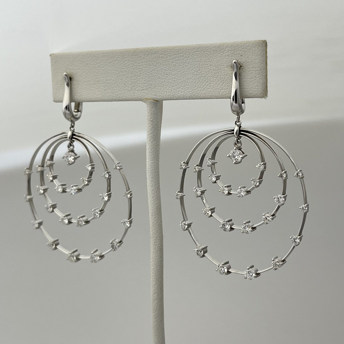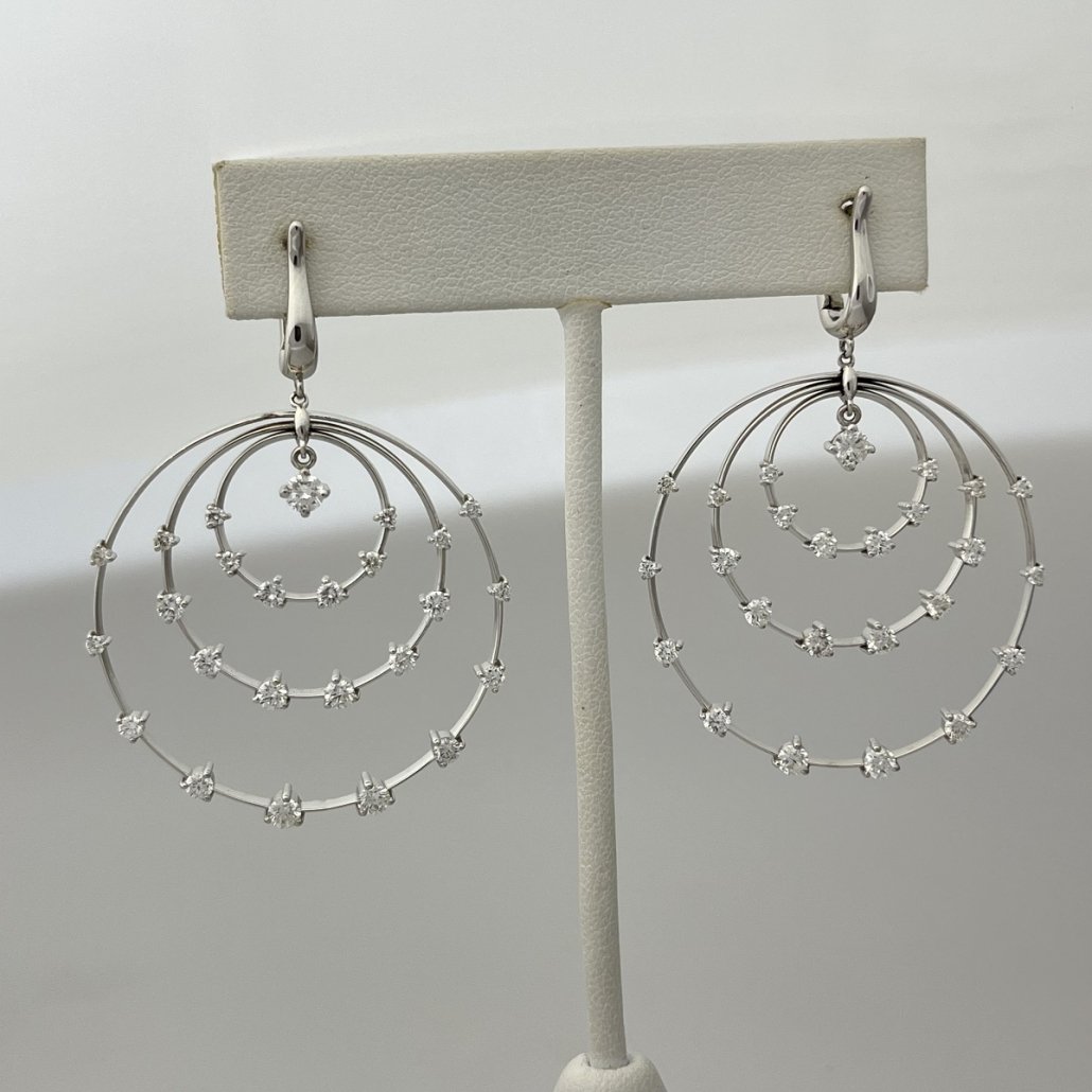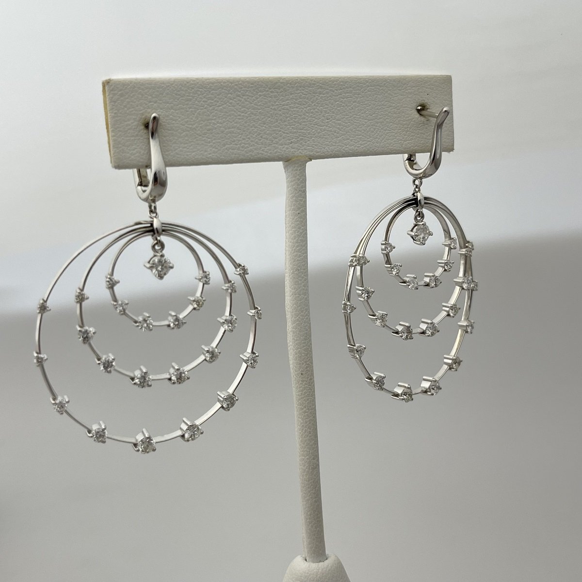 14k White Gold Earrings feature 3 concentric diamond circles with dangling diamonds.