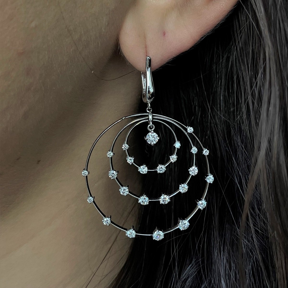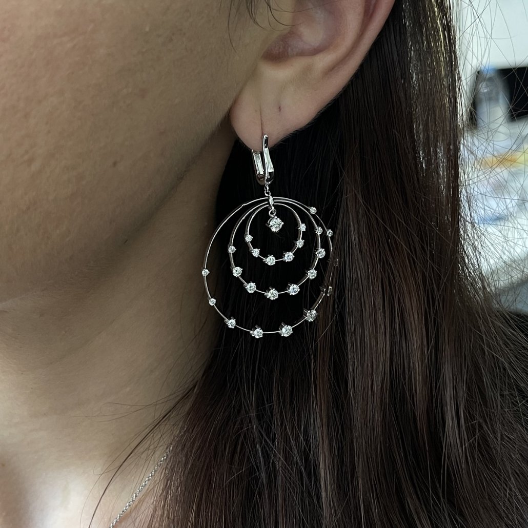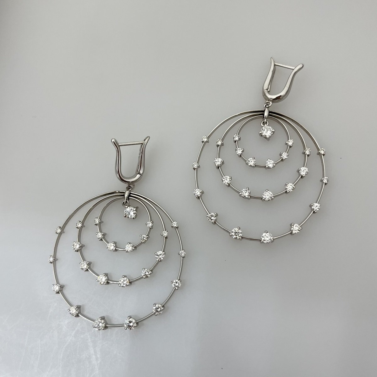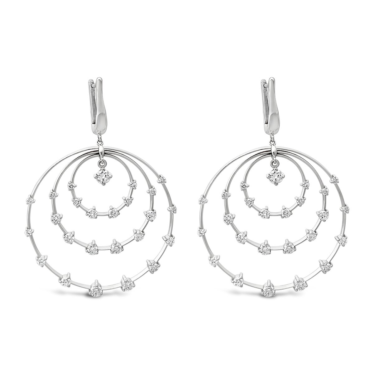 14k White Gold Earrings feature 3 concentric diamond circles with dangling diamonds.