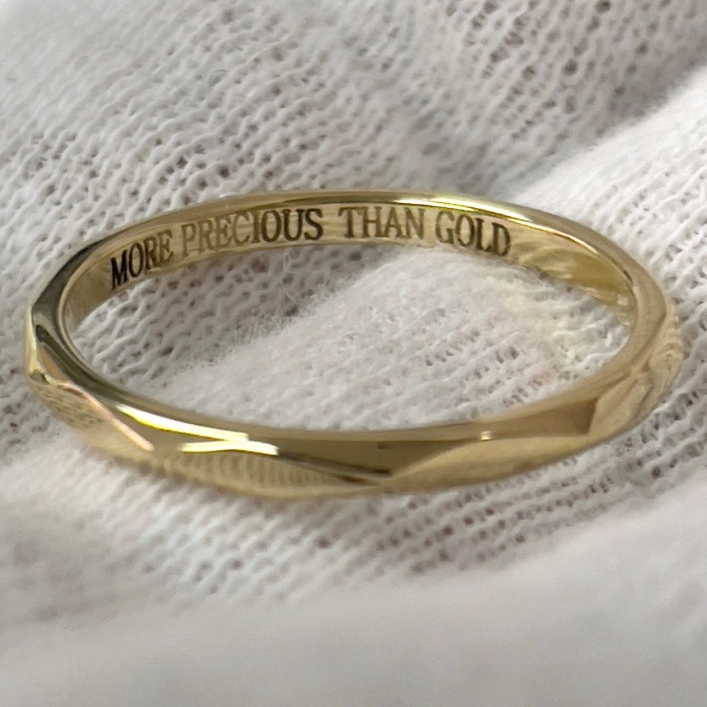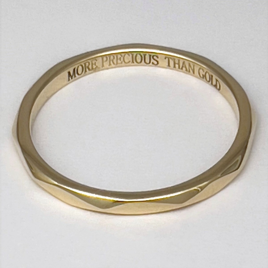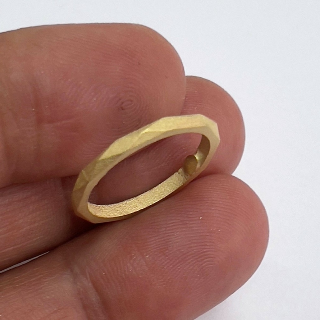 This 14k yellow gold ring is designed to have geometrical edges on the edge to create a modern twist to a classical wedding band.