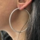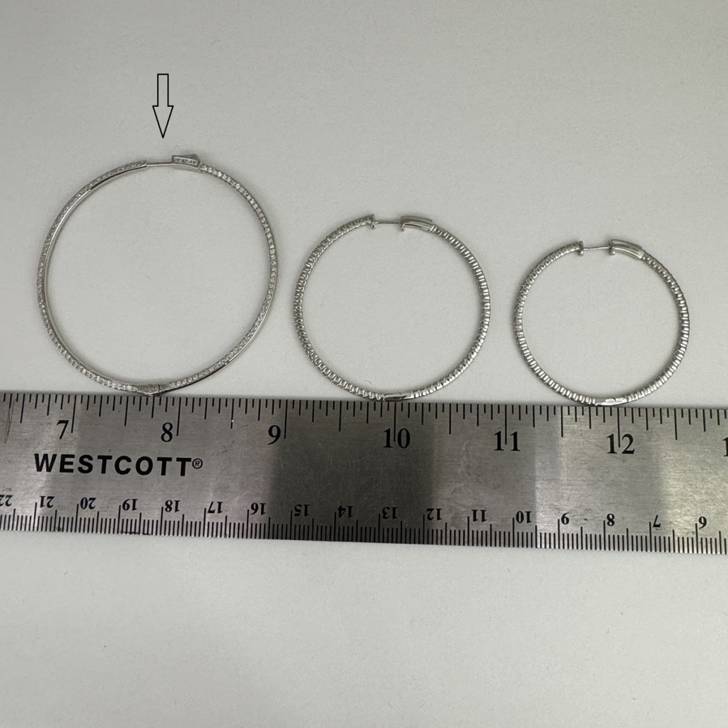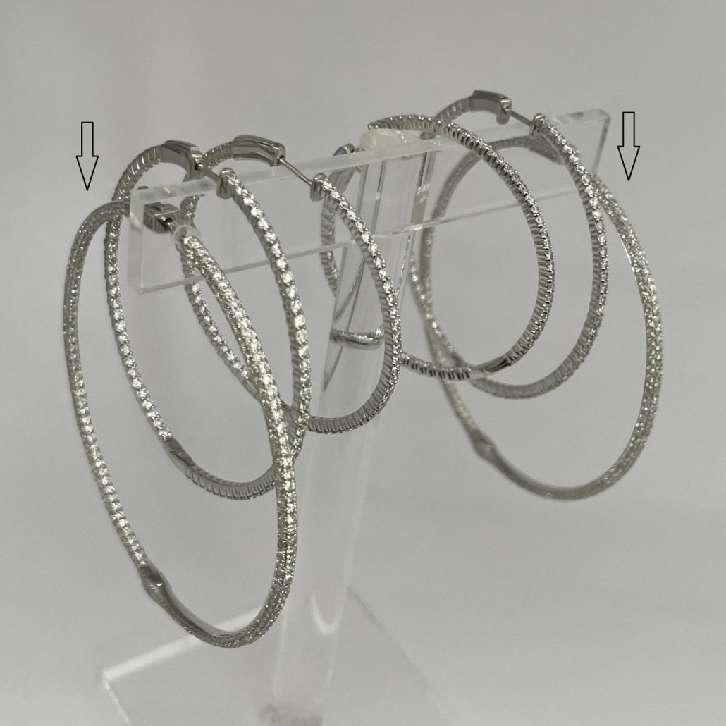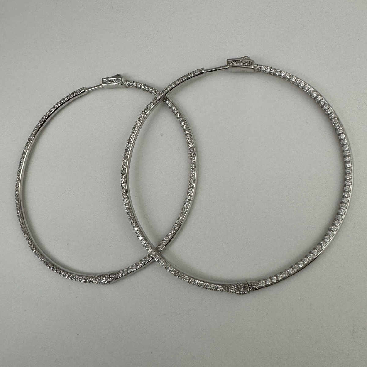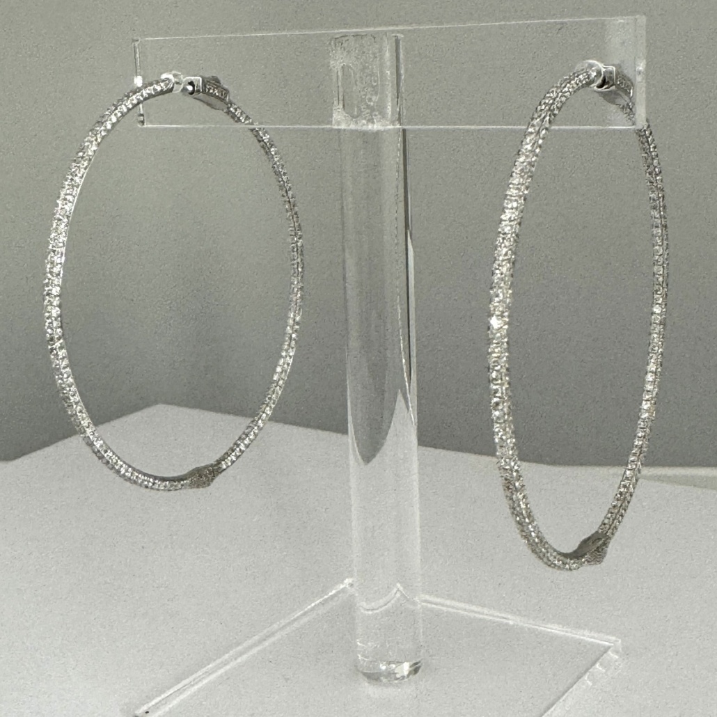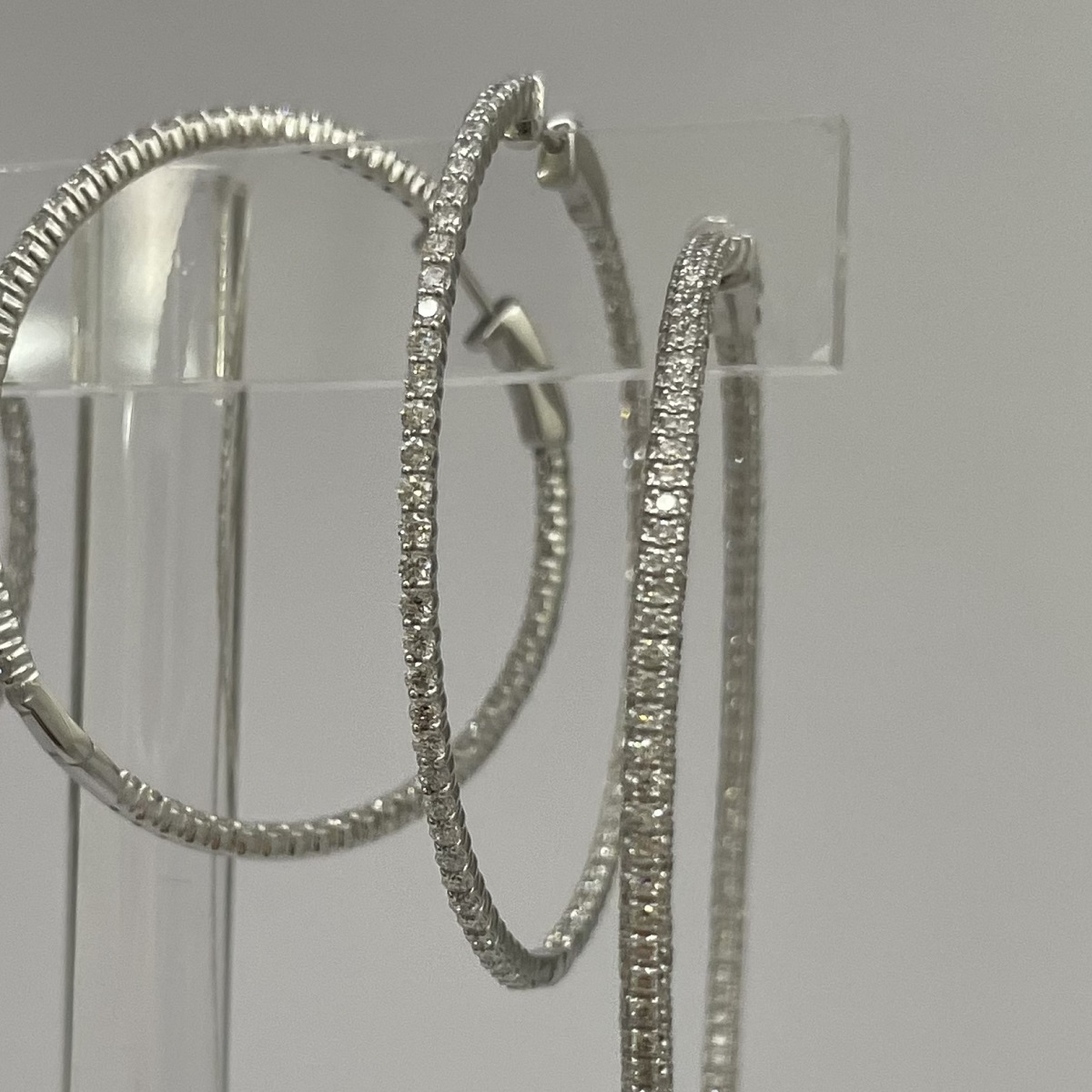 This pair of beautiful diamond hoops earrings are made with 14k white gold. The diamonds are prong set on the sides and the fronts of these hoop earrings.
