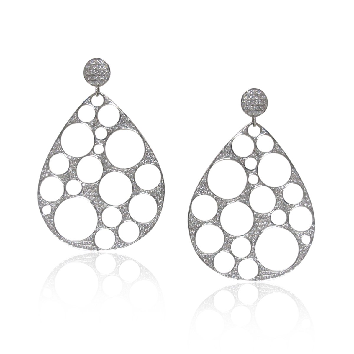 Diamond teardrop shaped earrings with punched holes hang from diamond buttons. The punched holes almost bubbles, for a fun, airy look.