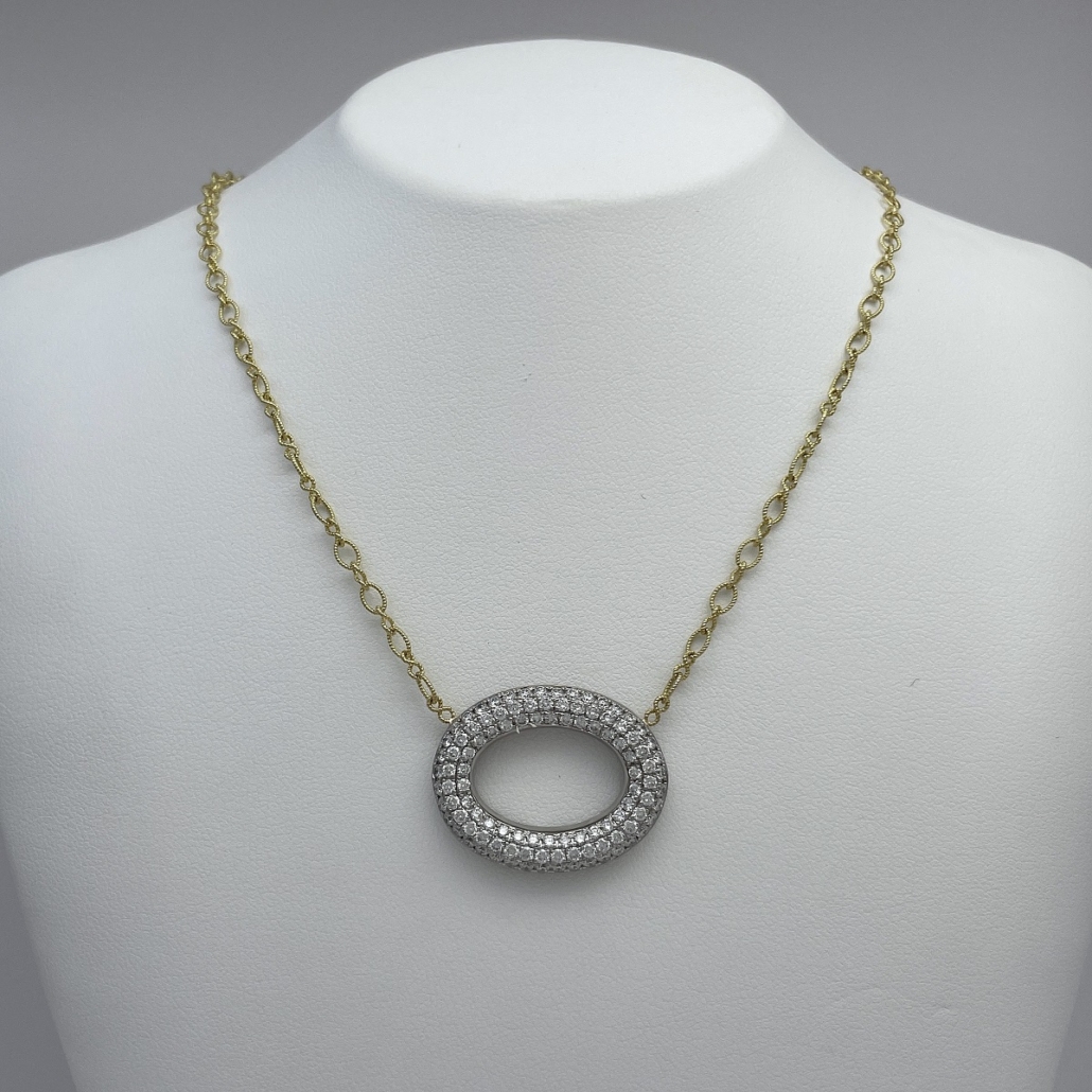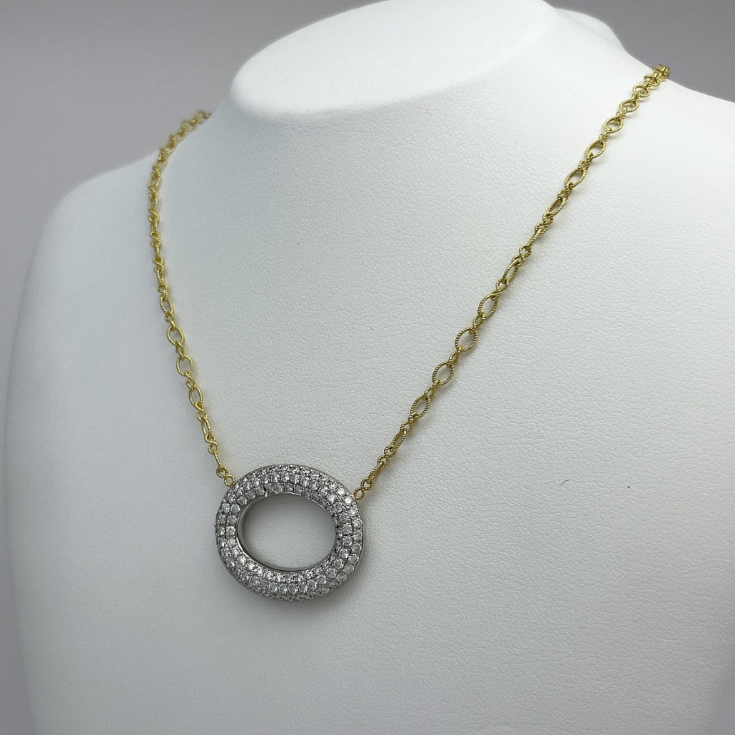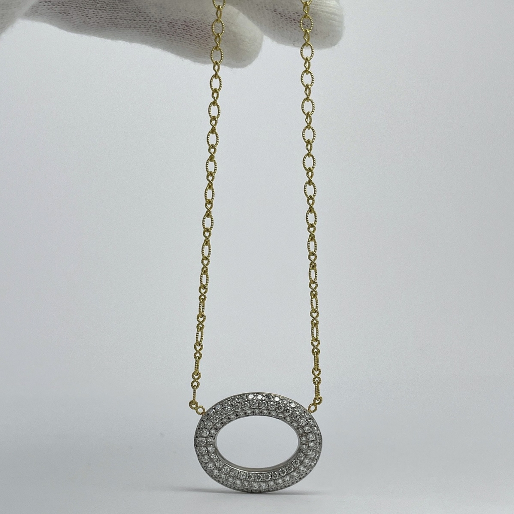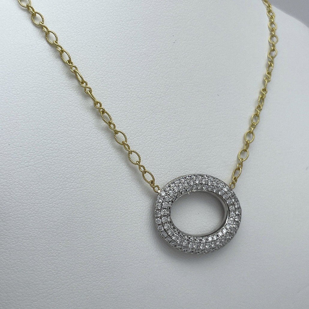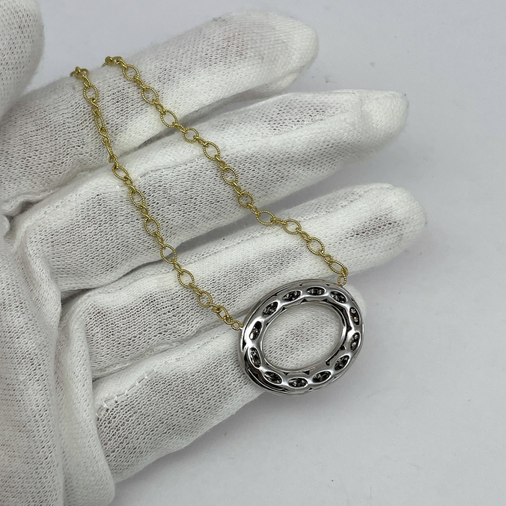 Tags 18k White, 18k Yellow, Circle, Cluster, Desire, Elegant, Fancy, Necklace, Pave Set, Pendant, Shared Prongs, Two Tone
