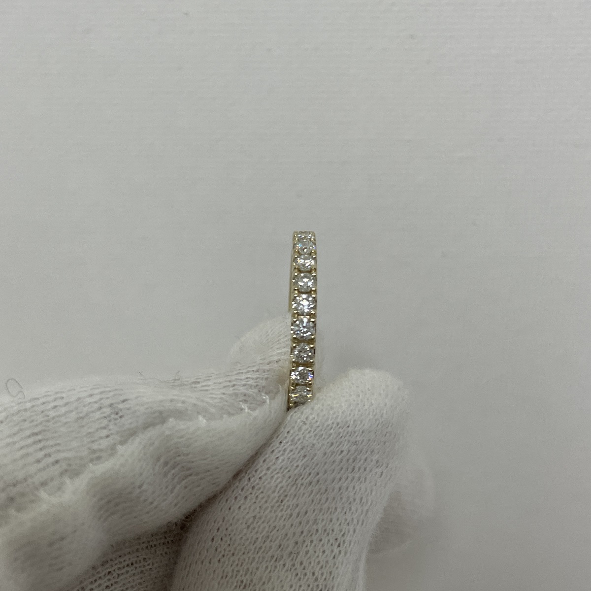 A timeless diamond band featuring a row of perfectly matched round brilliant diamonds set in warm 14k yellow gold.