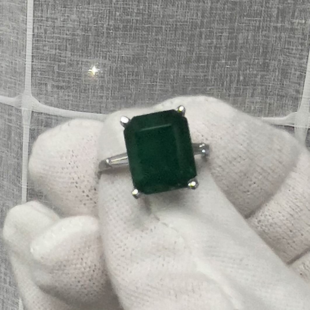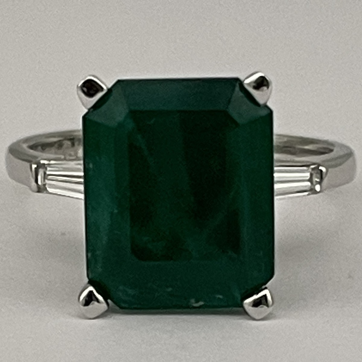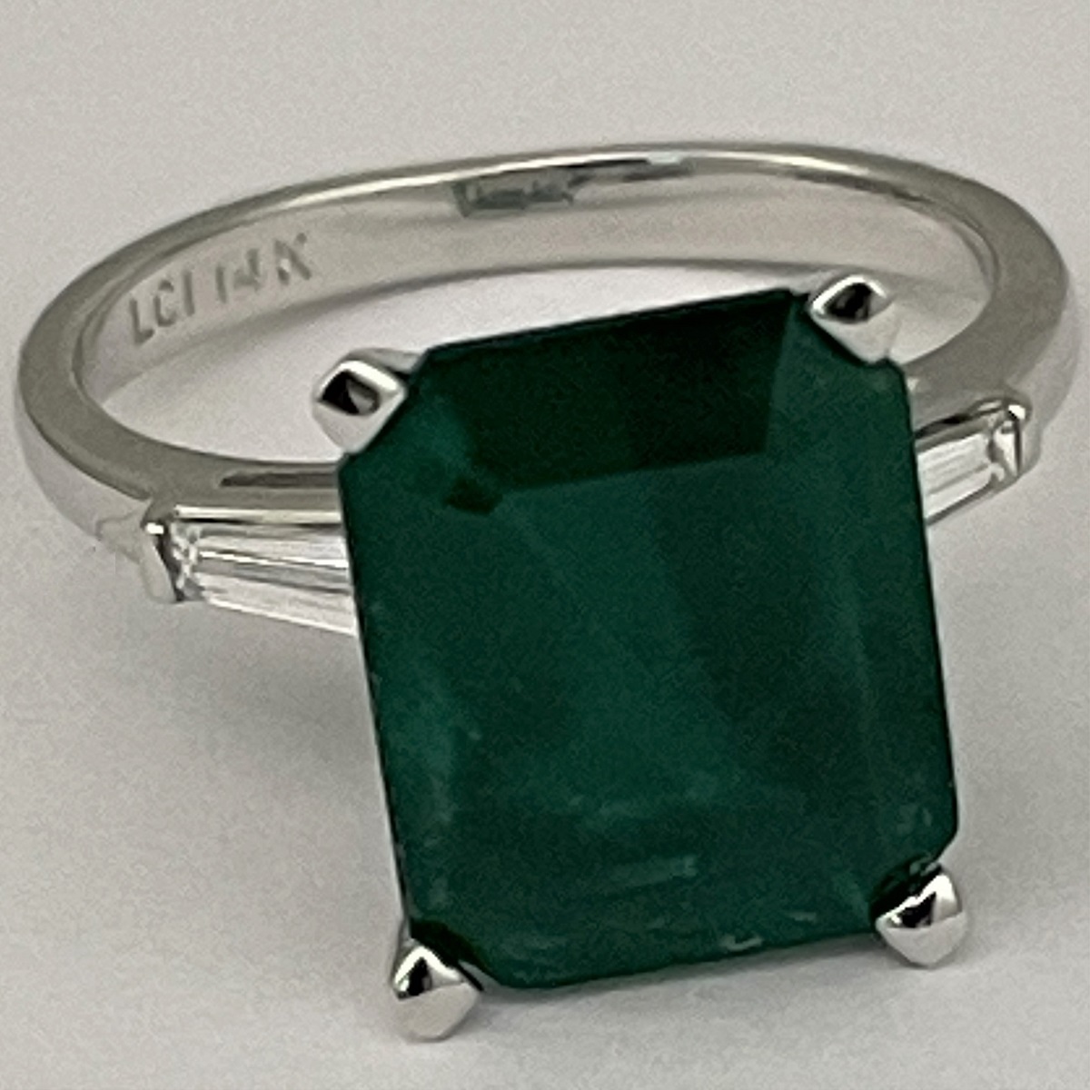14k White Gold Ring With Large 5.02 Carats Natural Emerald. Accompanied By Two Diamond Baguettes Bezel Set On The Shank.