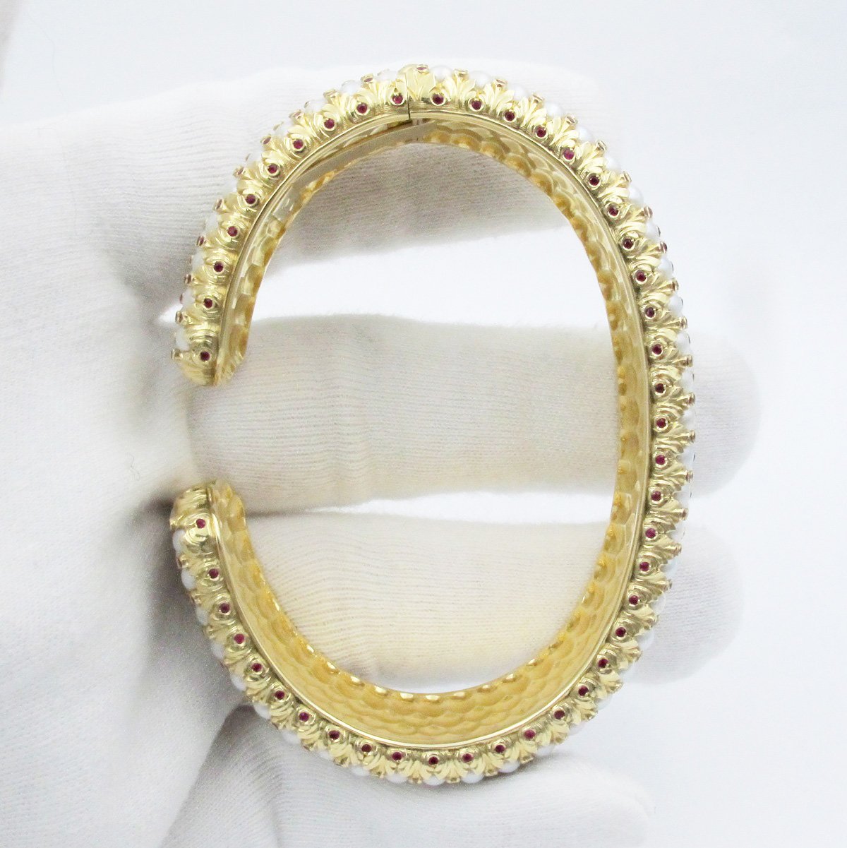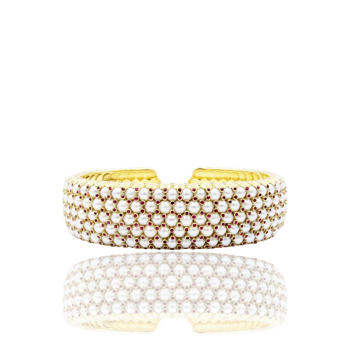 This incredible 18k yellow gold cuff was handcrafted – Every pearl and every ruby was set by hand, one at a time.  A true masterpiece.