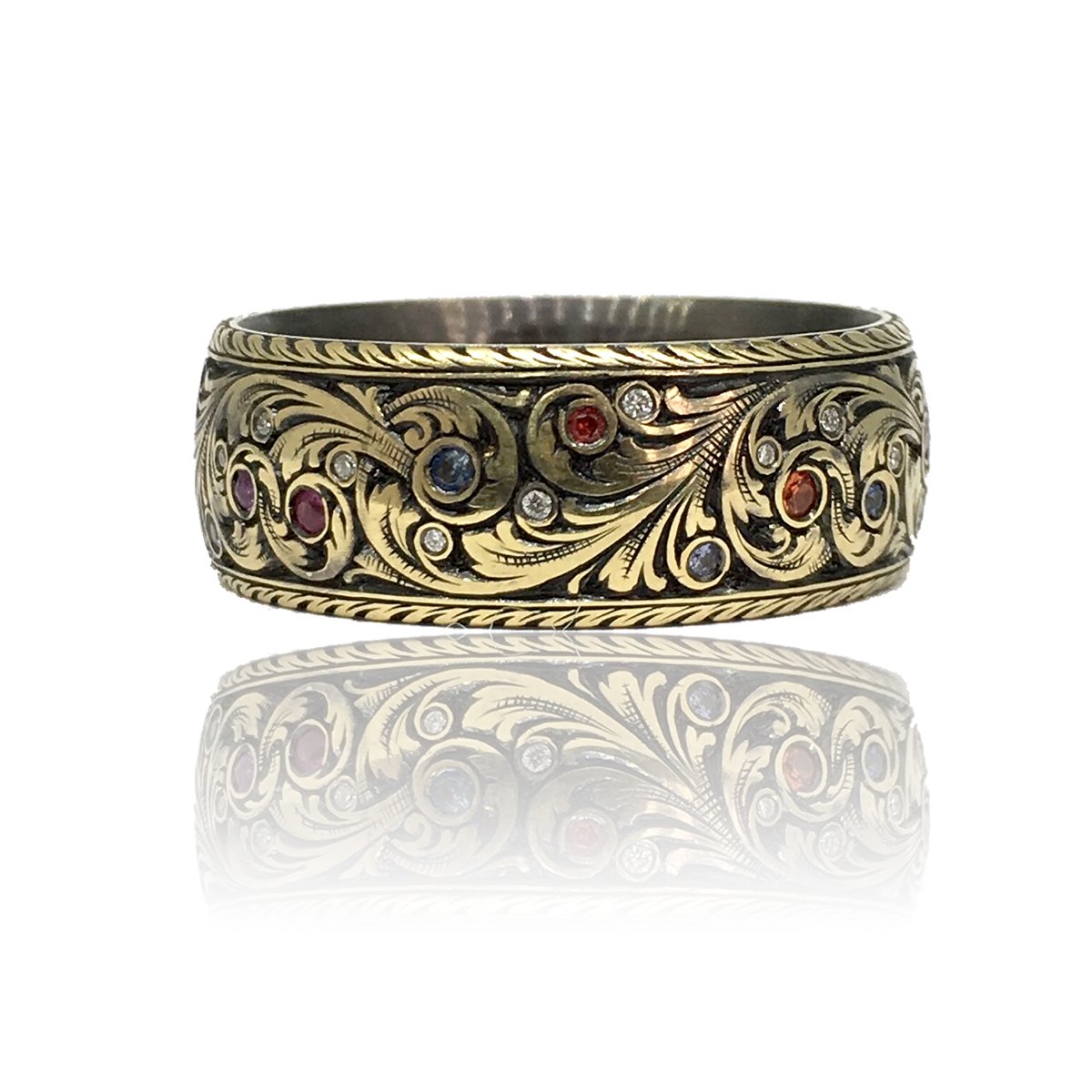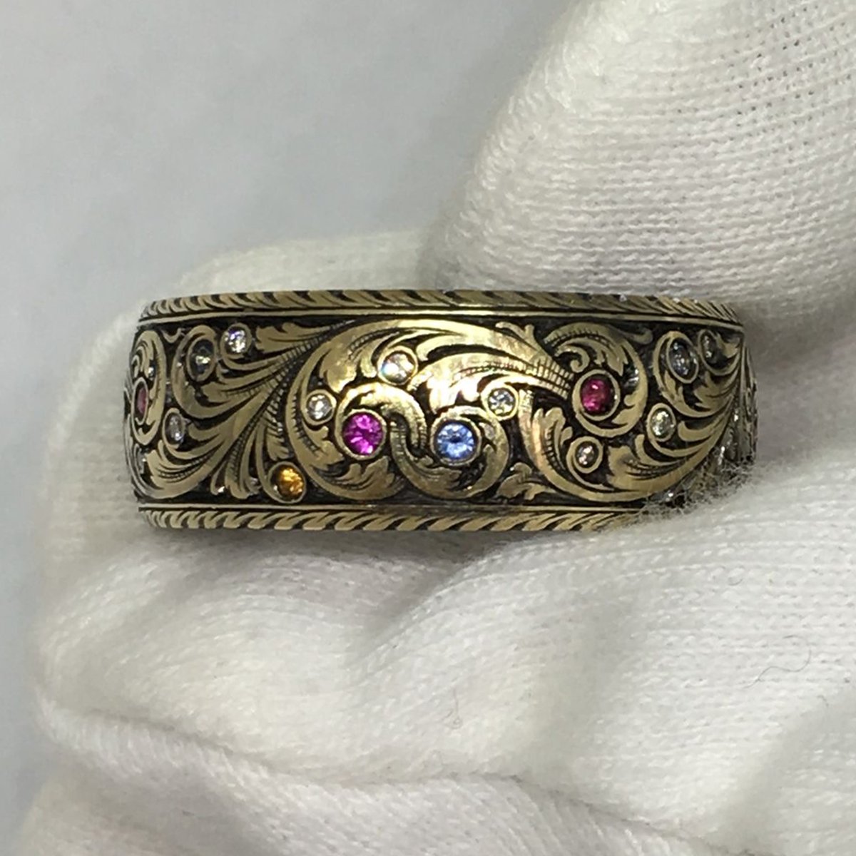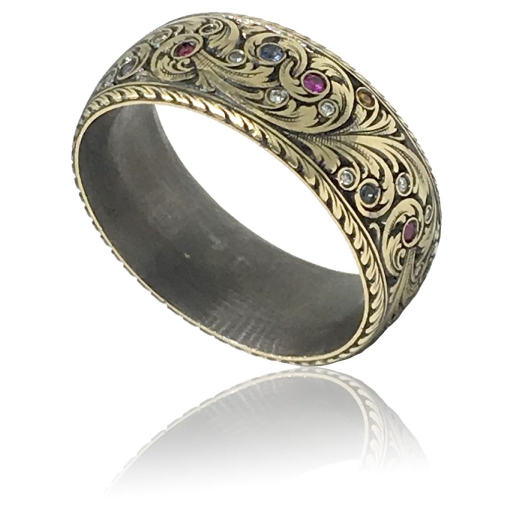 This custom ring is ornately engraved with a feather pattern design. The hand engraved detail goes all the way around the ring and the outer edges are finely milgrained.