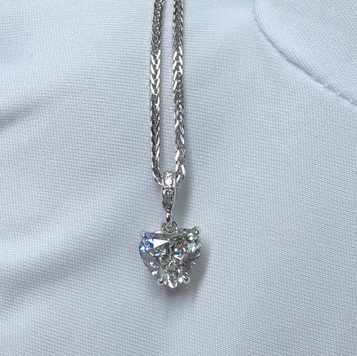 14k white gold diamond pendant necklace made with natural heart shape cut diamond set in five prong basket setting. And a custom made bail with five natural round brilliant diamonds attached to 14k white gold eleven inch wheat chain.