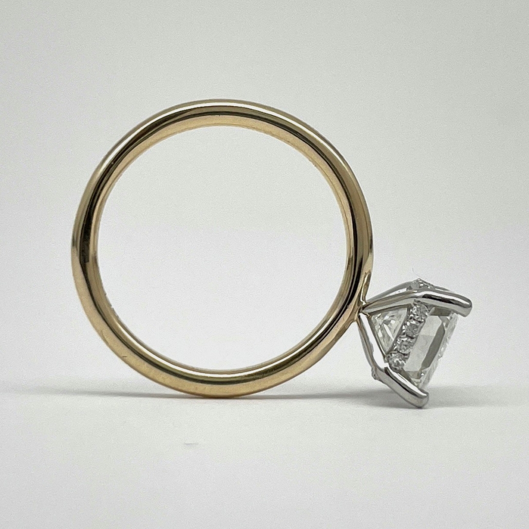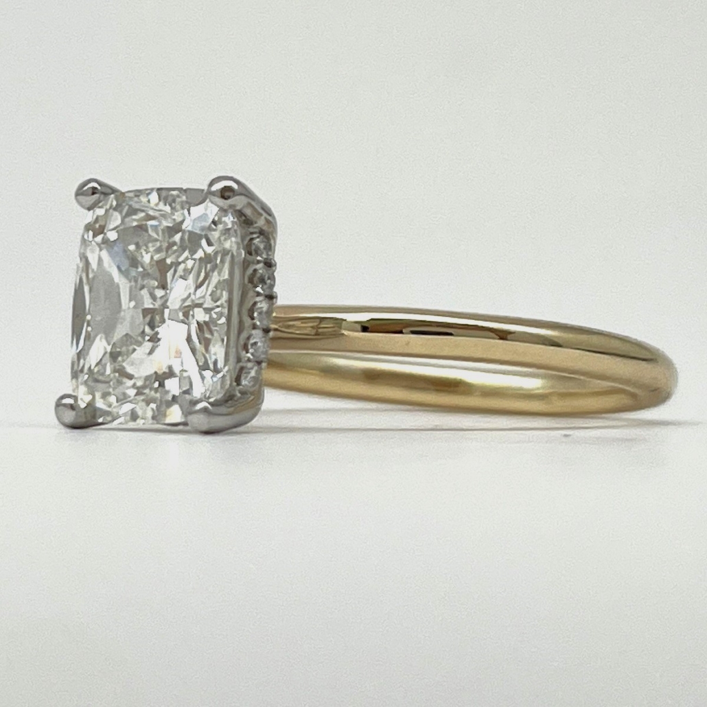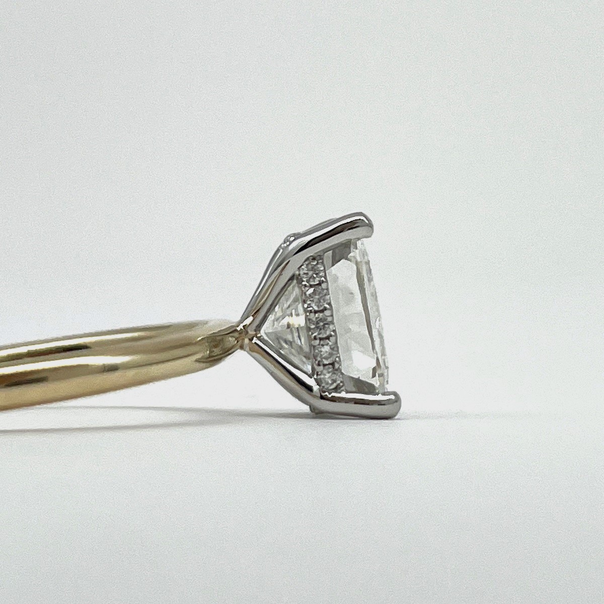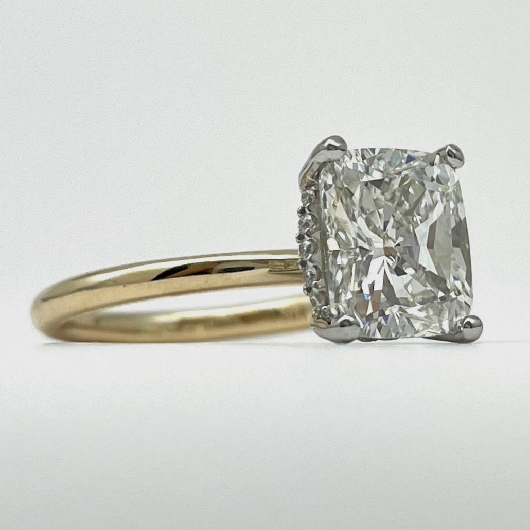 A stunning cushion-cut diamond floats in a white gold setting atop a sleek yellow gold band. With hidden pavé diamonds underneath, this ring is all about quiet luxury and radiant love.