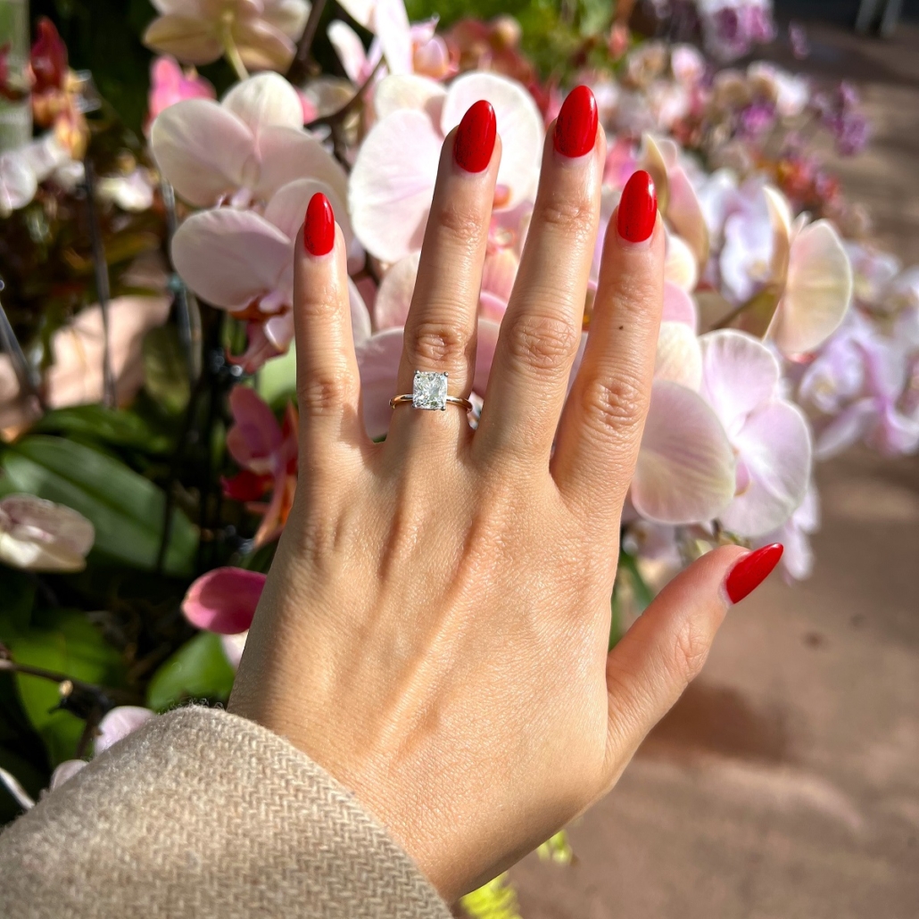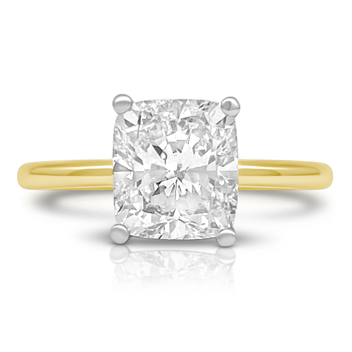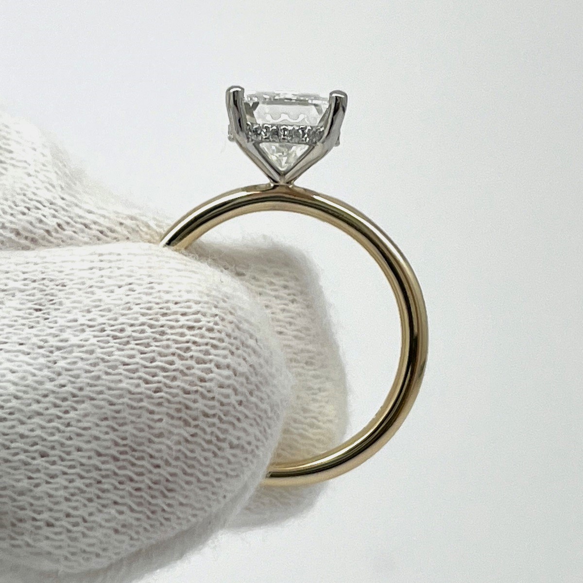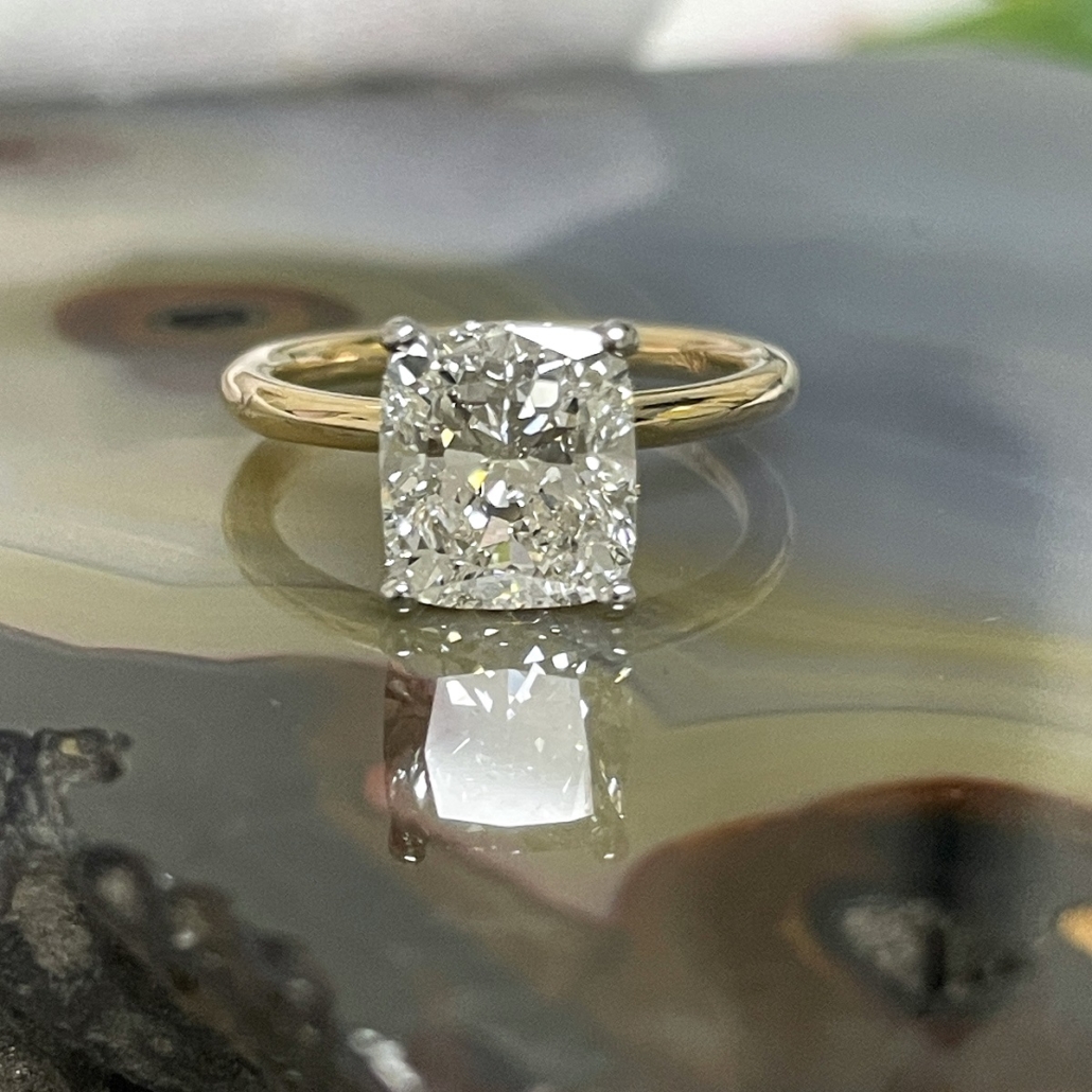A stunning cushion-cut diamond floats in a white gold setting atop a sleek yellow gold band. With hidden pavé diamonds underneath, this ring is all about quiet luxury and radiant love.