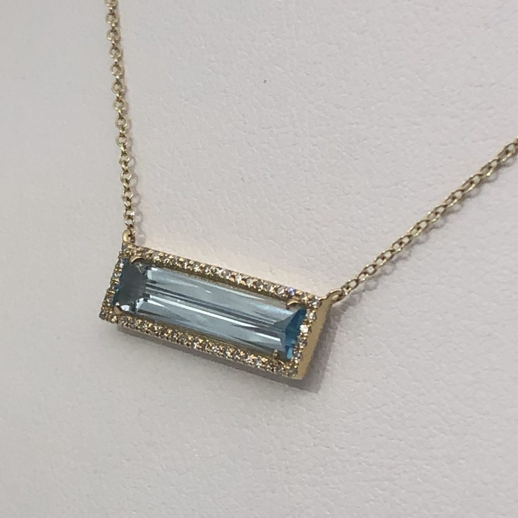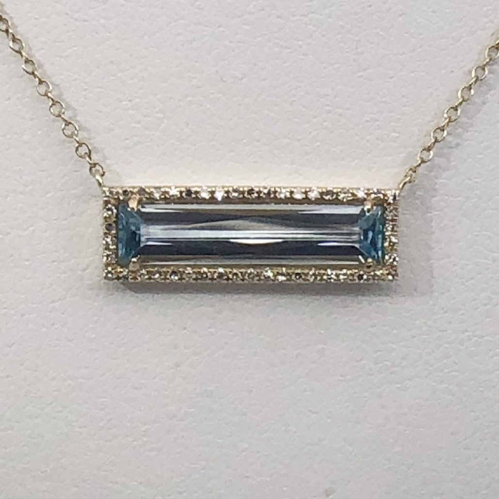 This elegant topaz bar is a unique statement of style. Surrounded by a halo diamonds for a bit of extra sparkle.
