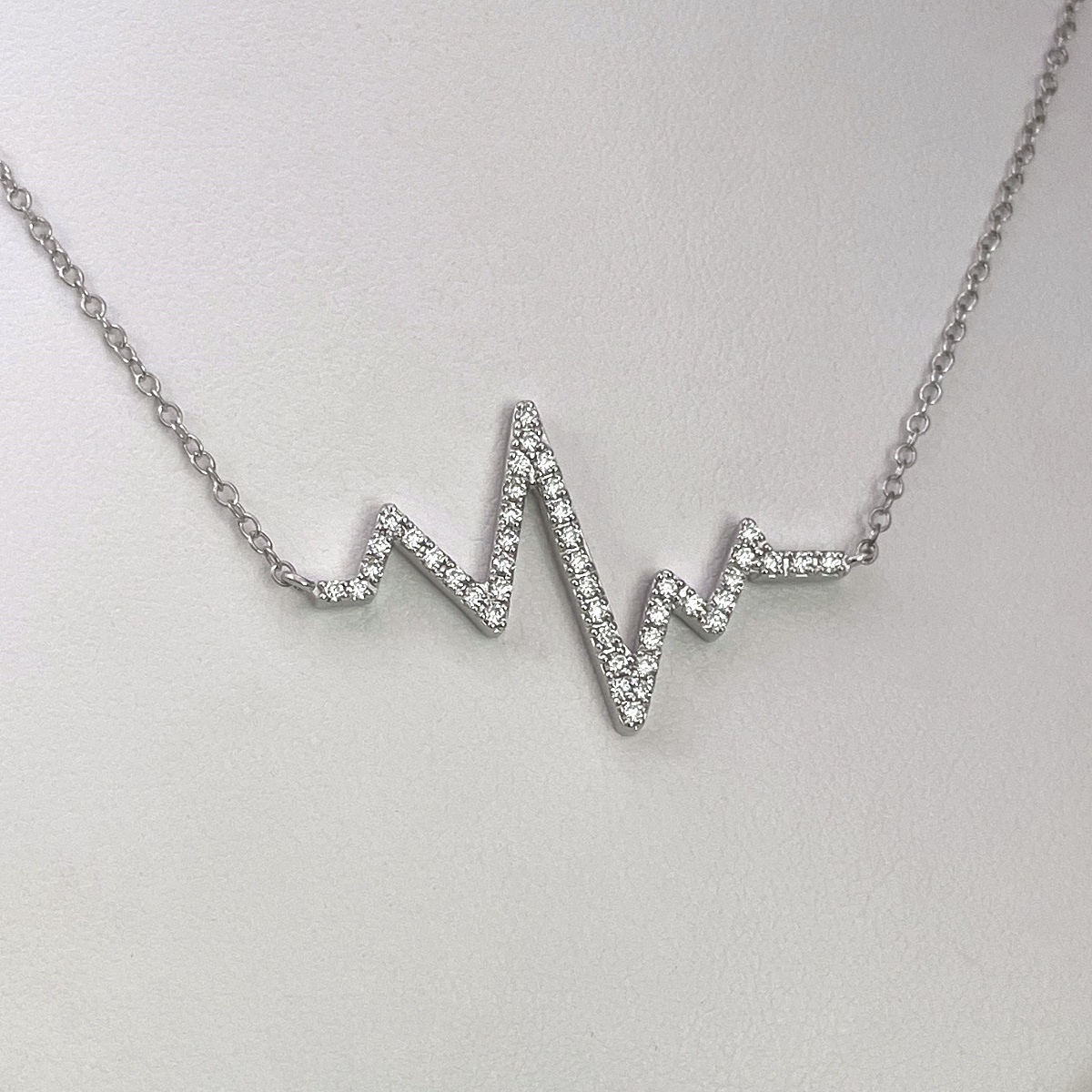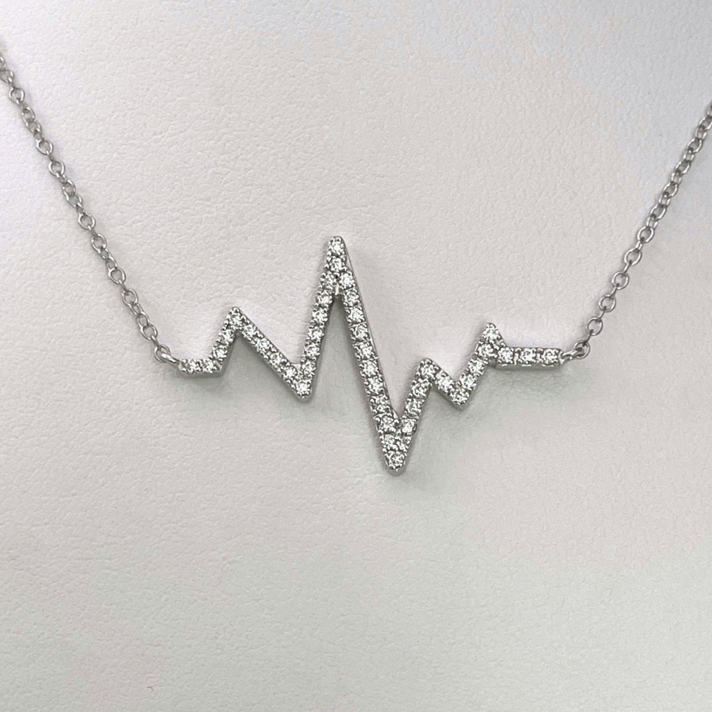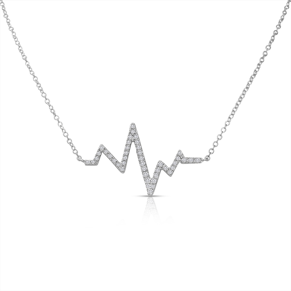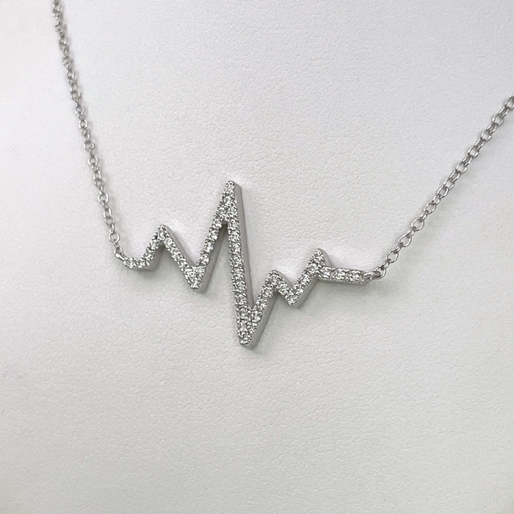 This heartbeat necklace is made with 14k white gold and four prong set with diamonds.