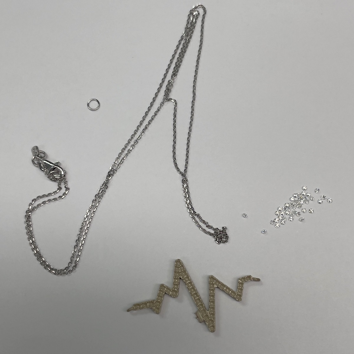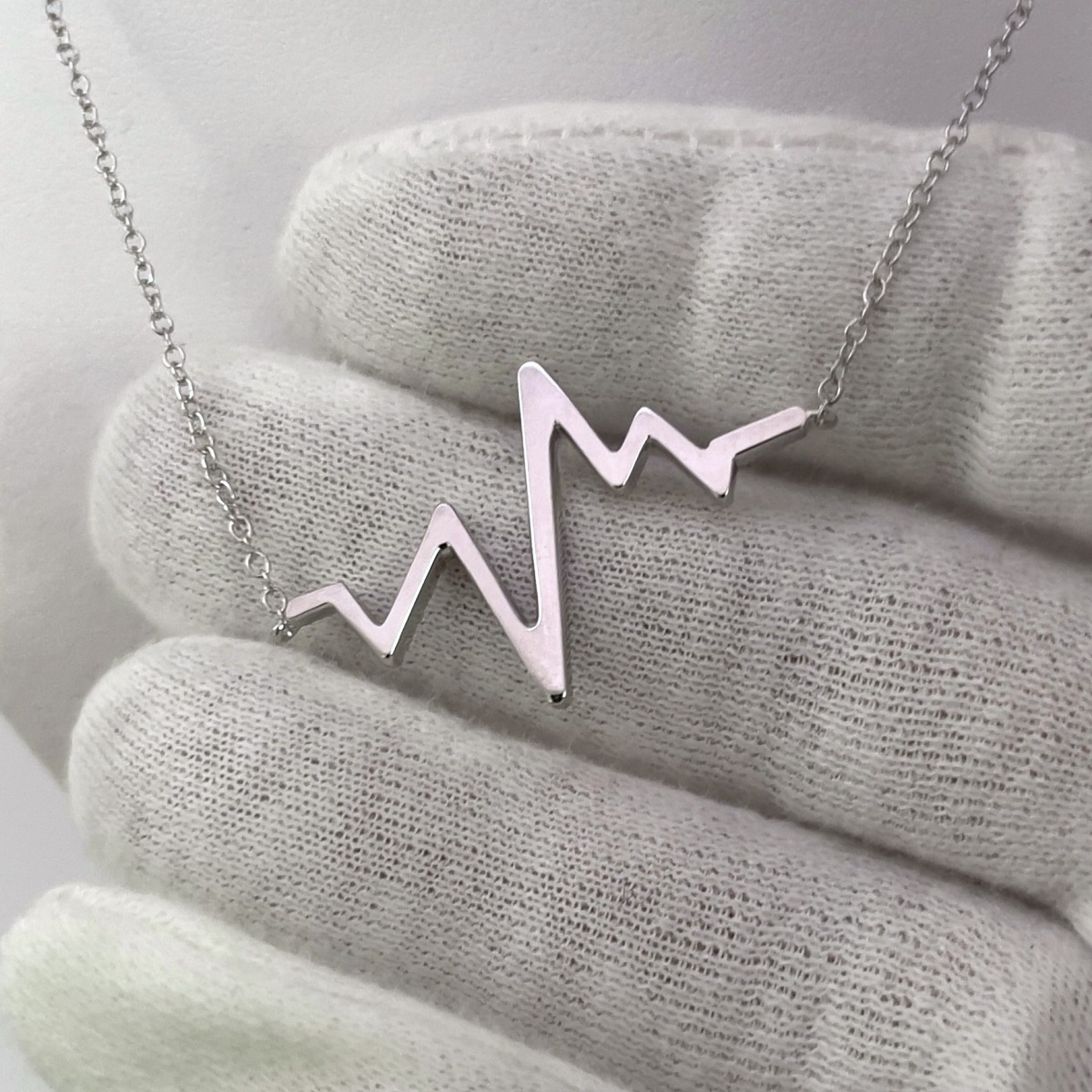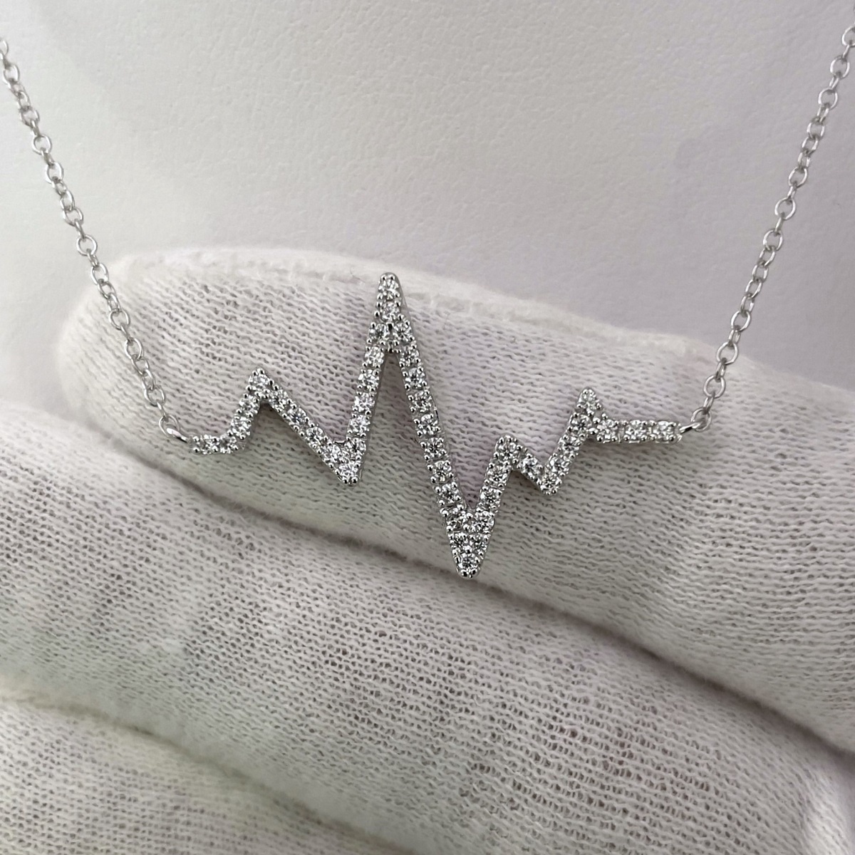 This heartbeat necklace is made with 14k white gold and four prong set with diamonds.