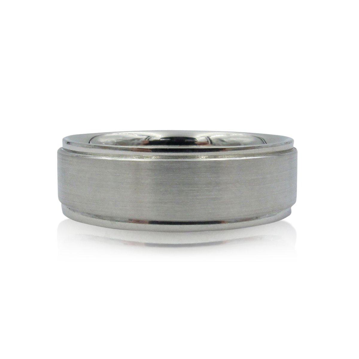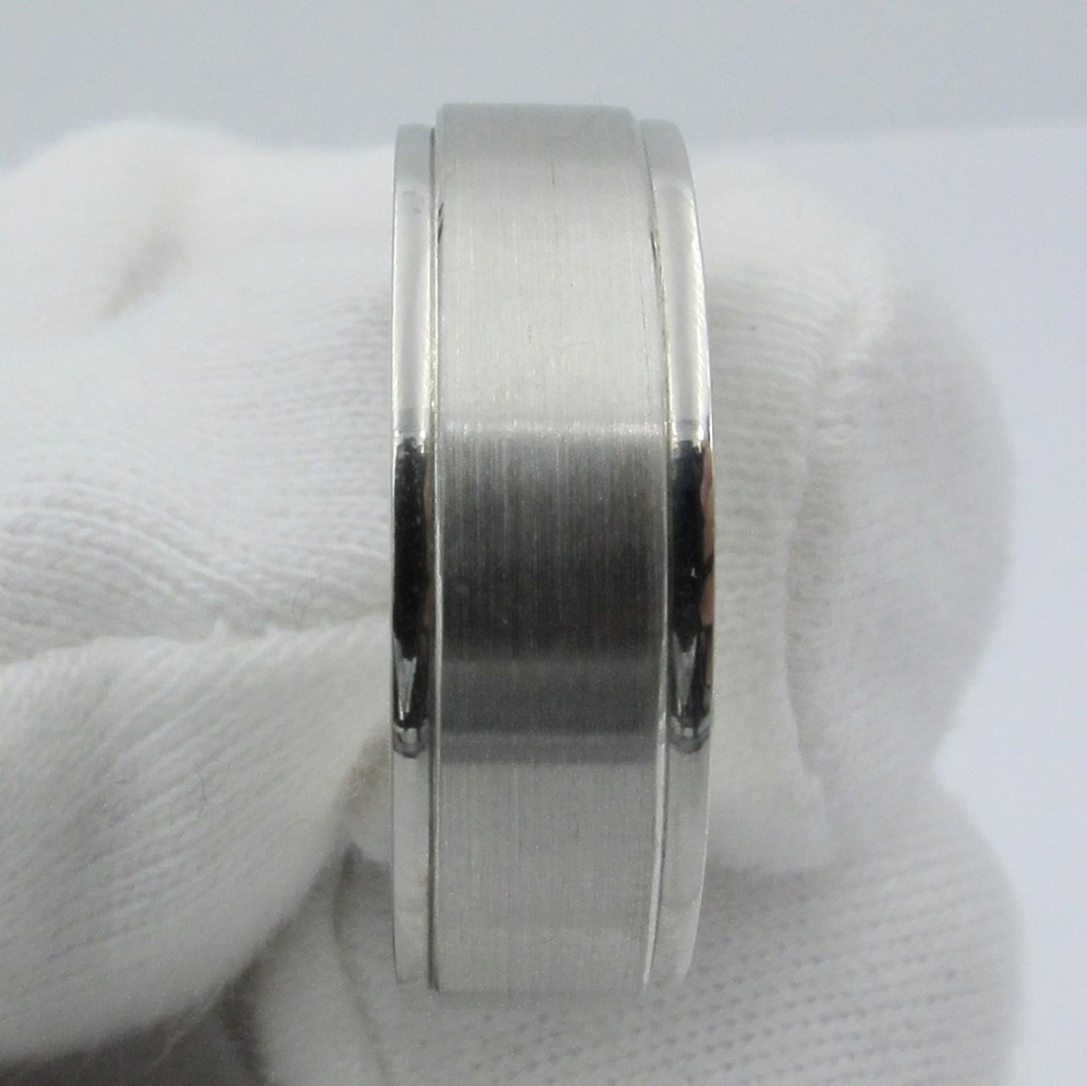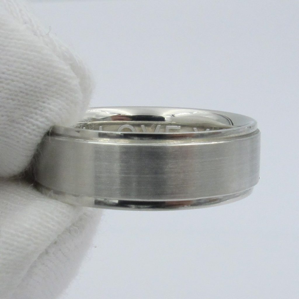 The gentleman’s wedding band is 95% pure platinum and 5% iridium. The center of the band has a satin finish. The rim is indented and has a high polish. Inside the ring is engraved to give a nod to his favorite movie.
