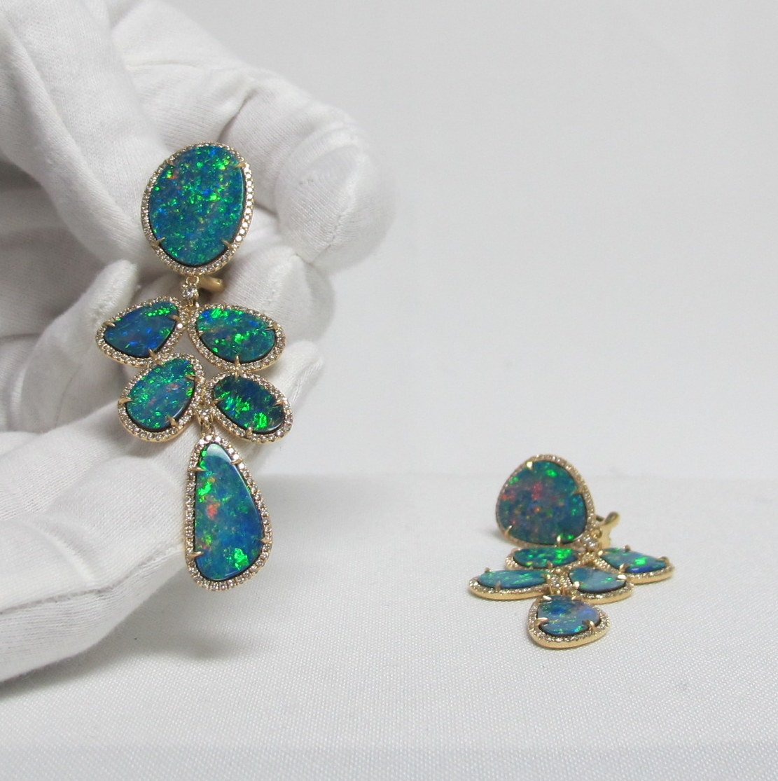 Twelve Matching Boulder Opals surrounded by diamonds set in pink gold. Elegantly designed to flow naturally down the neck..