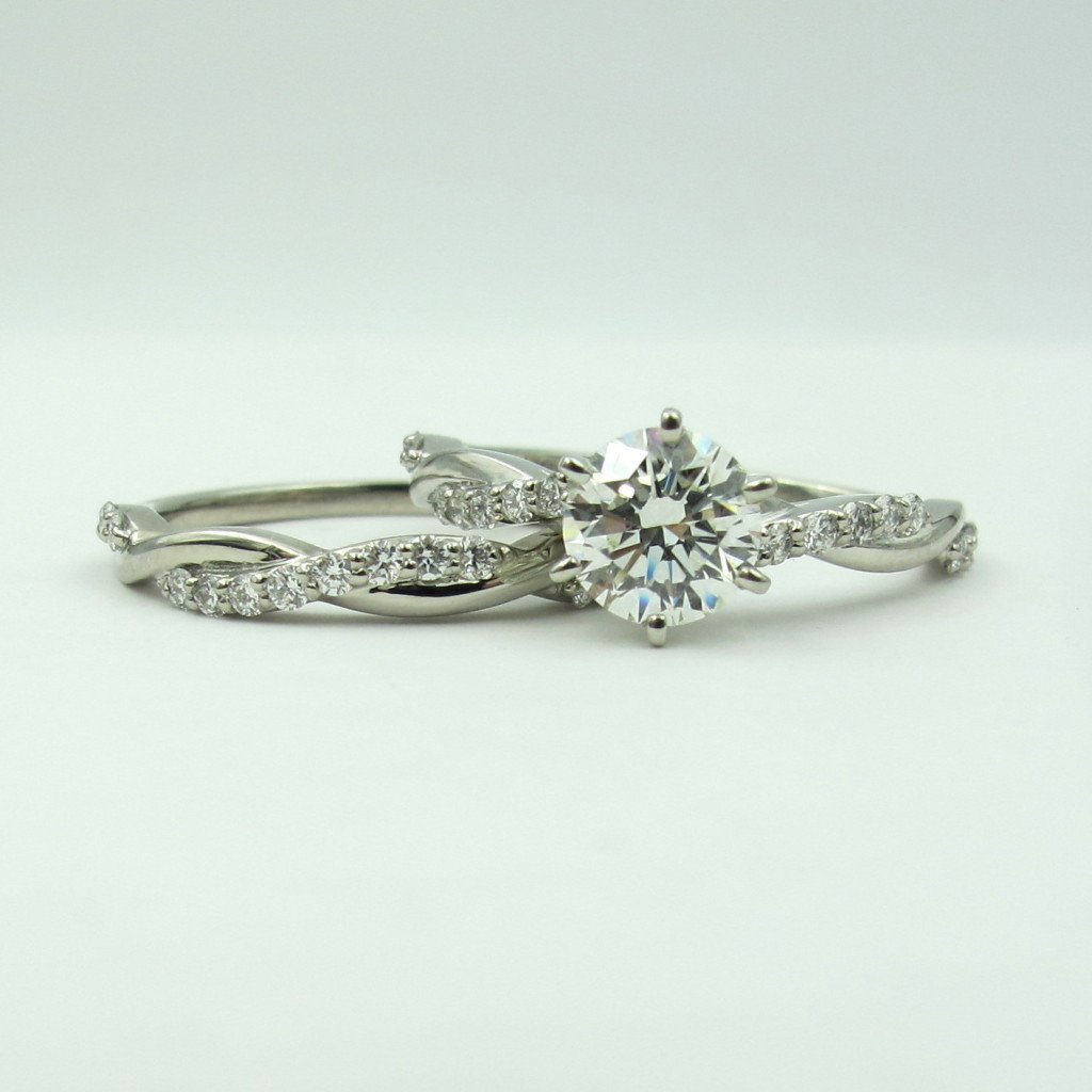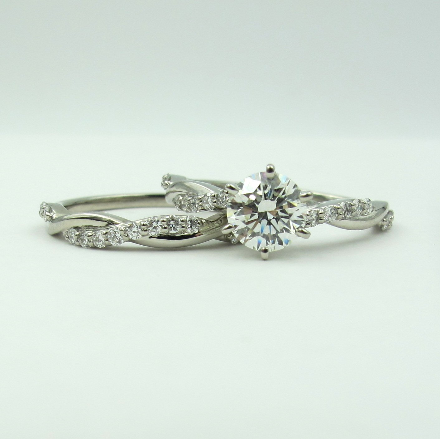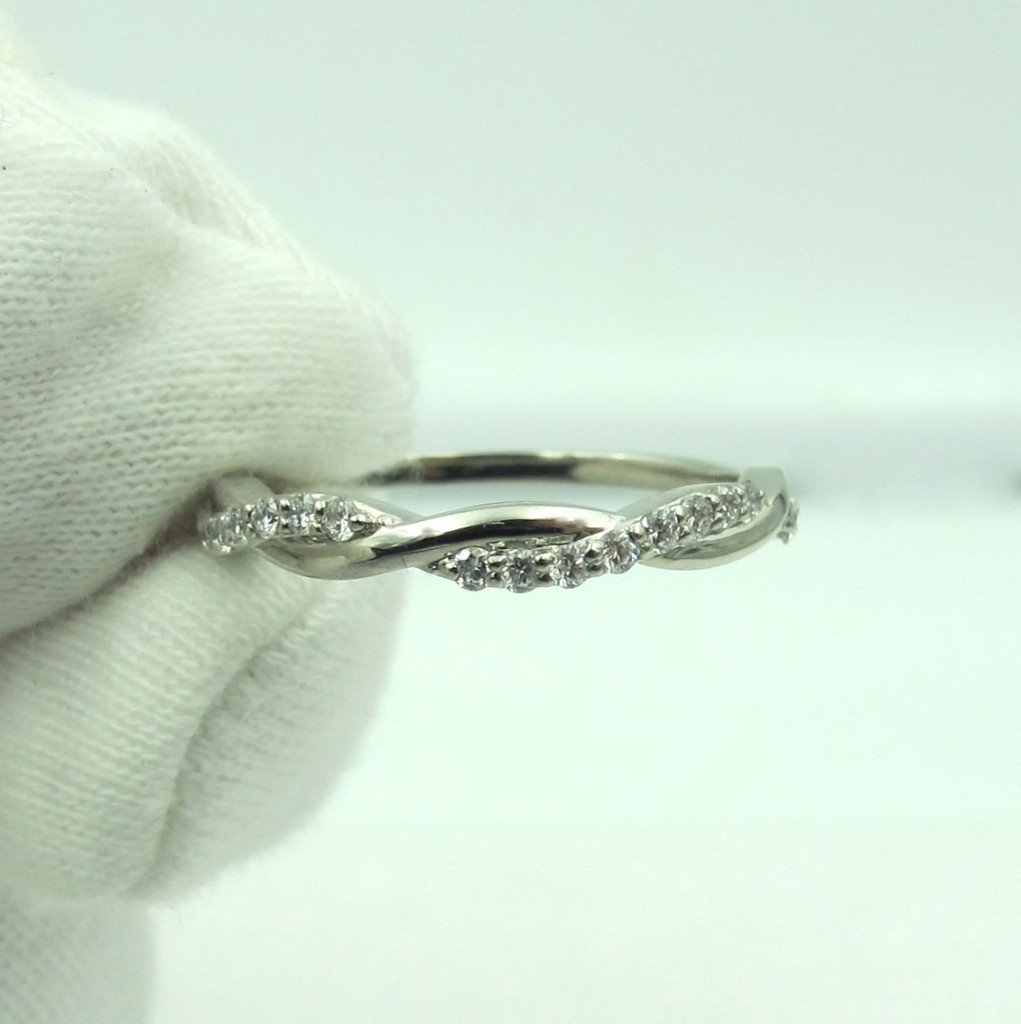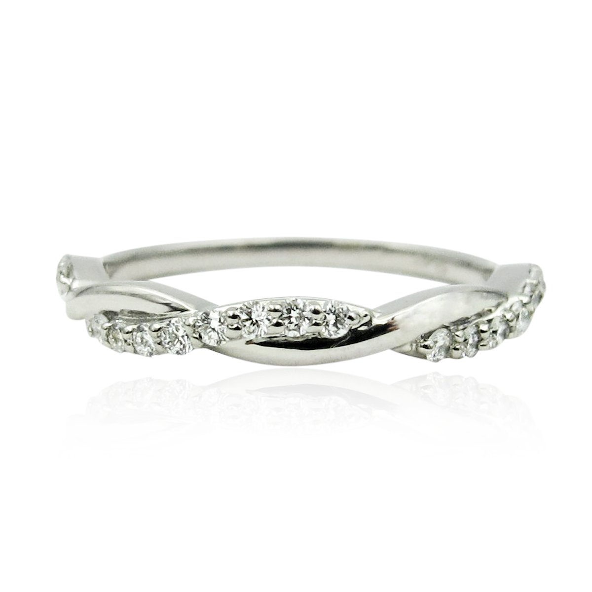 This diamond and platinum wedding band is part of a custom set, and his band matches too! They are all set to appear as if the bands twist around one another.