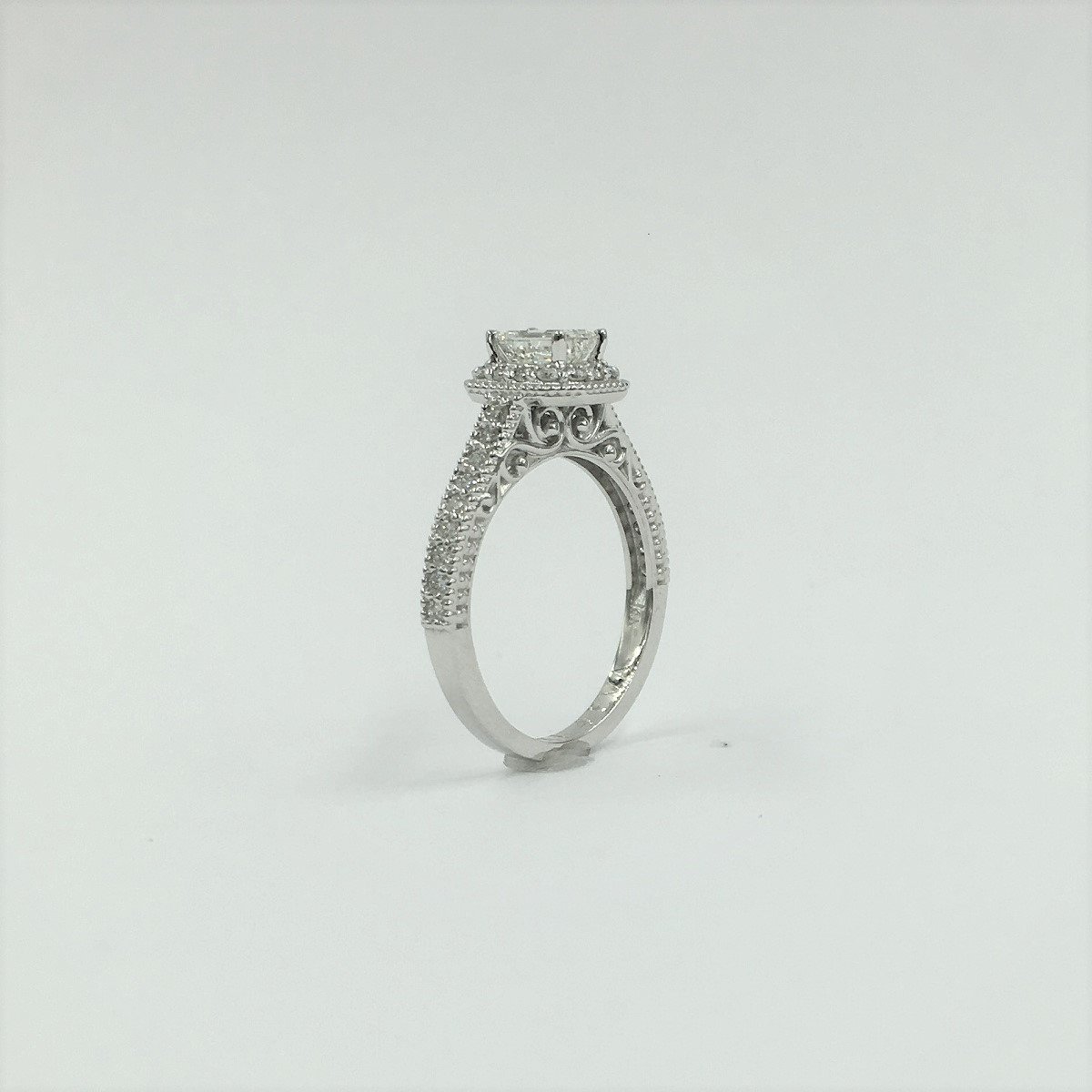 A Vintage Style, 14K White Gold Engagement Ring.  The halo setting features ornate scroll and beadwork.
