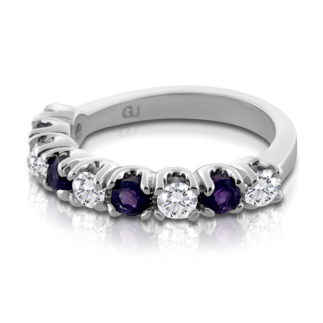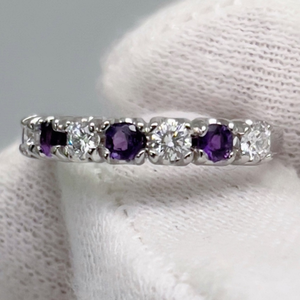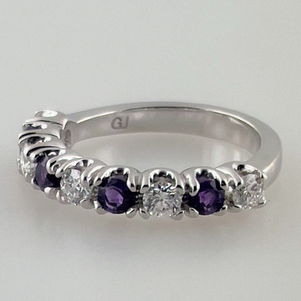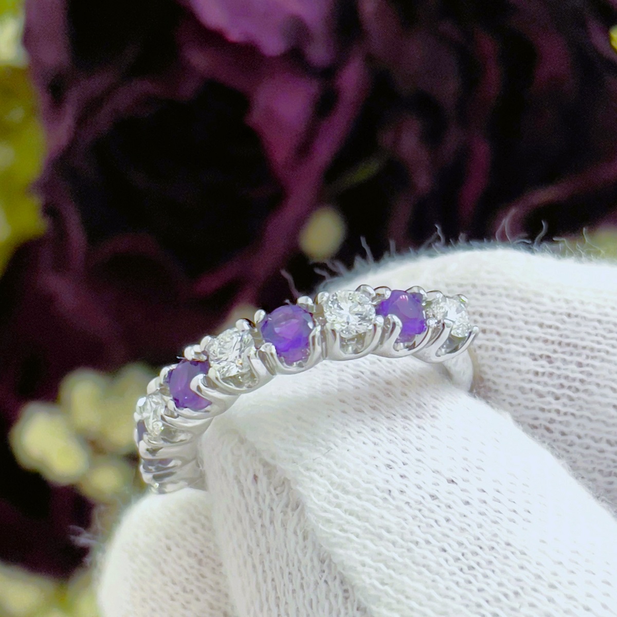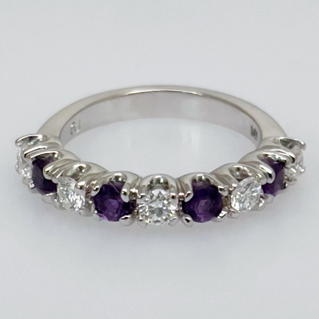 This Beautiful Ring Is Made With 14k White Gold And Set With Diamond And Amethysts.