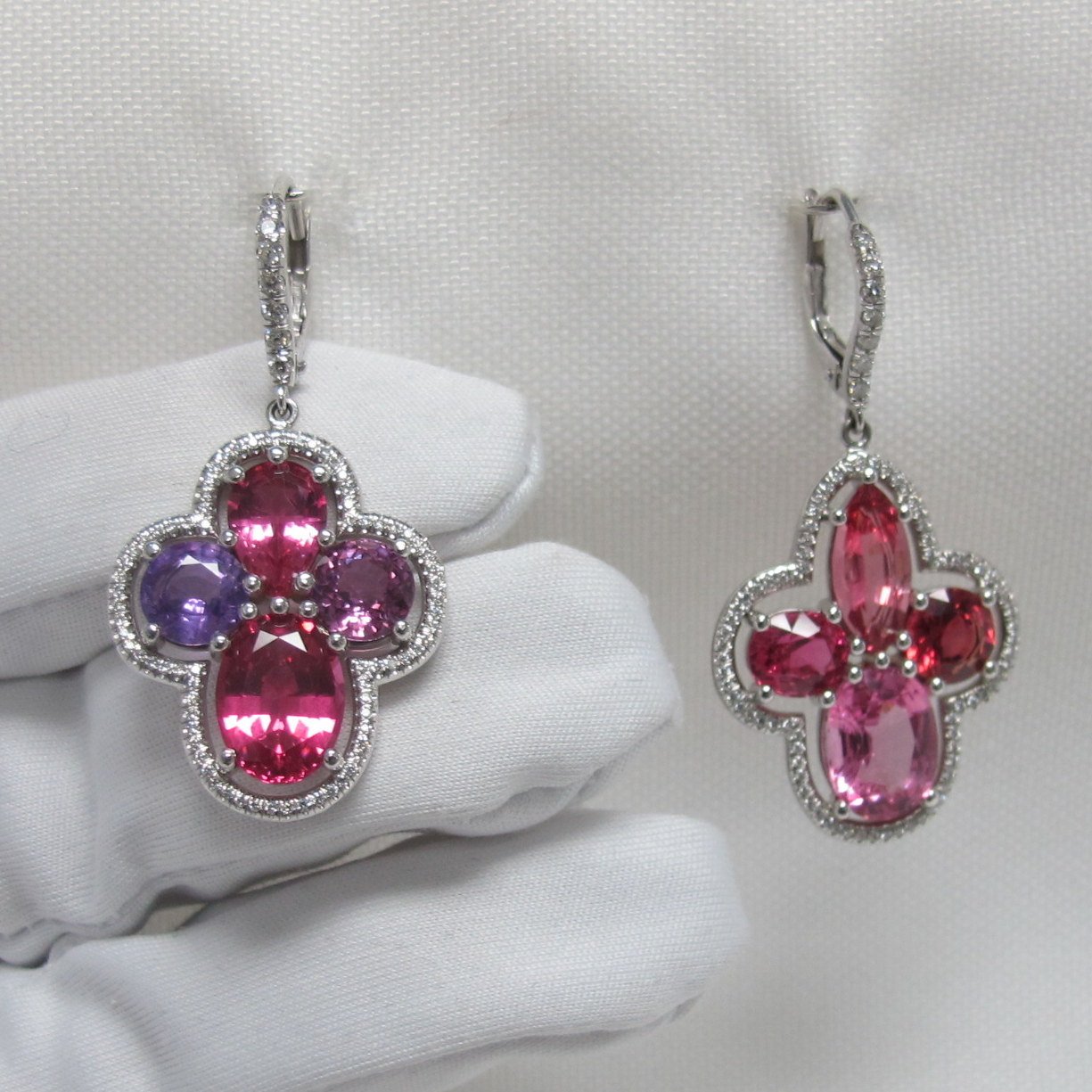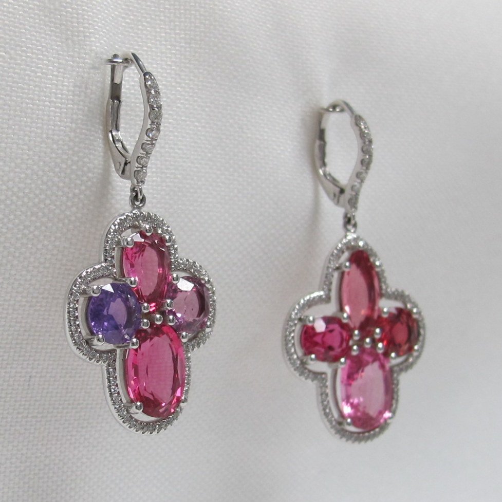 Natural Lavender Sapphires and multi shades of Pink Spinel make these drop earrings sing with color. Surrounded by small diamonds.