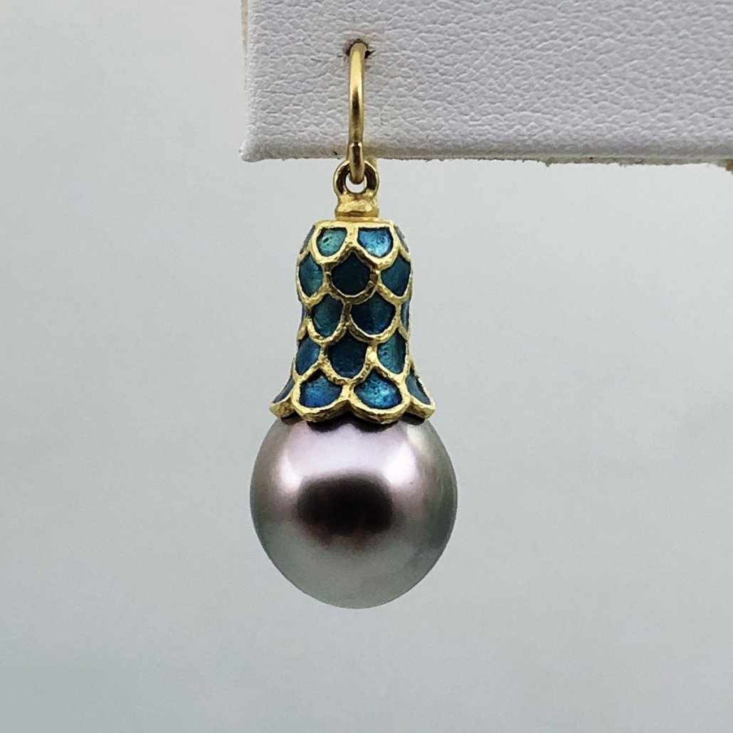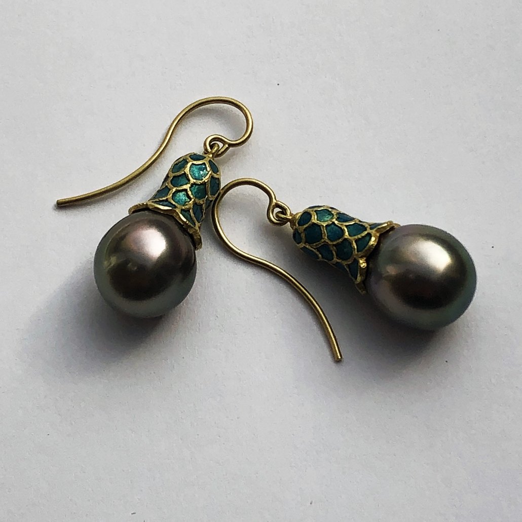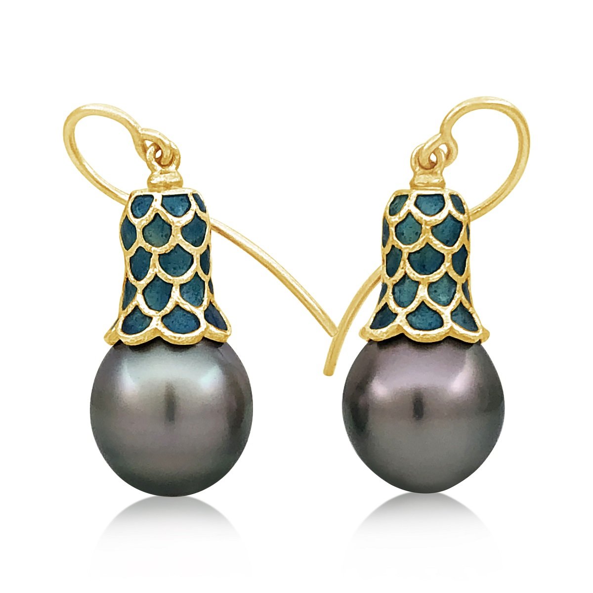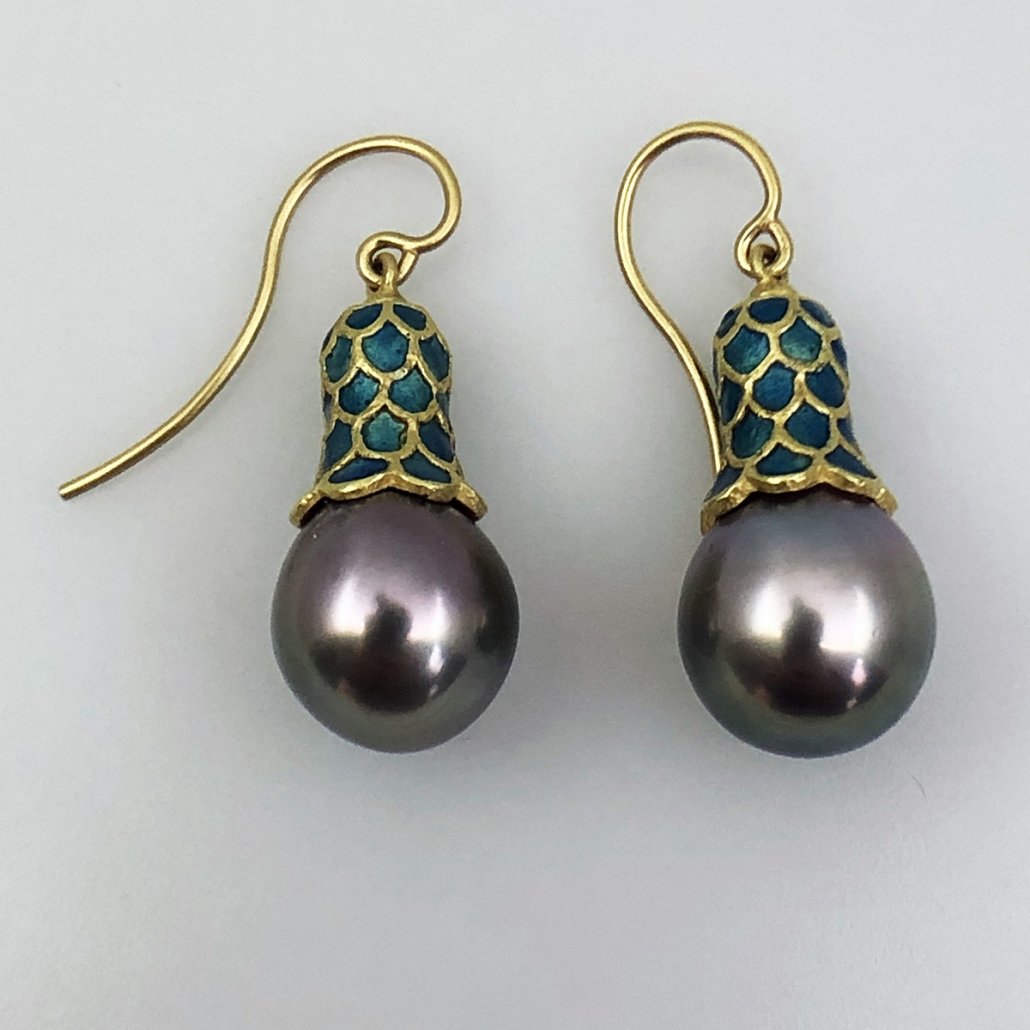 Feel like a princess in these Tahitian Pearl and Enamel Scale domed 18 K Yellow Gold dangling earrings .