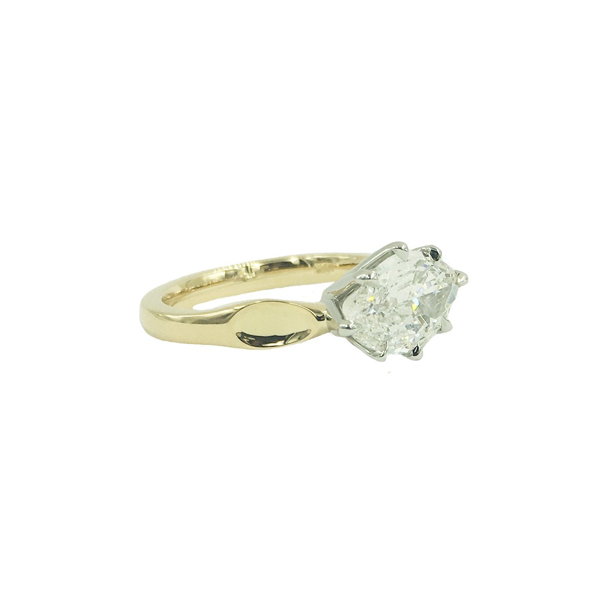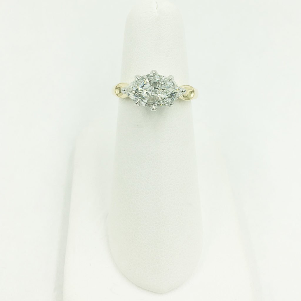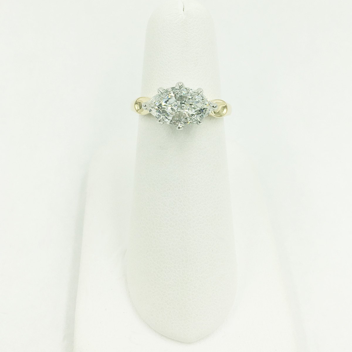 This is truly a one of a kind – an 18K Yellow Gold Shank with a petal design and Platinum Head and Mounting meet together perfectly at the top of the ring, with a stunning marquise cut diamond.