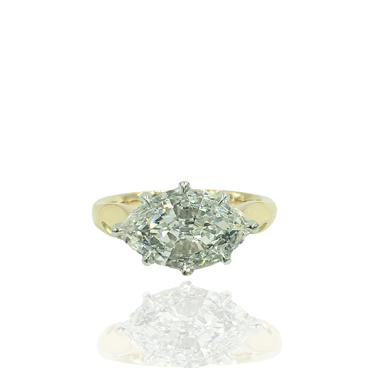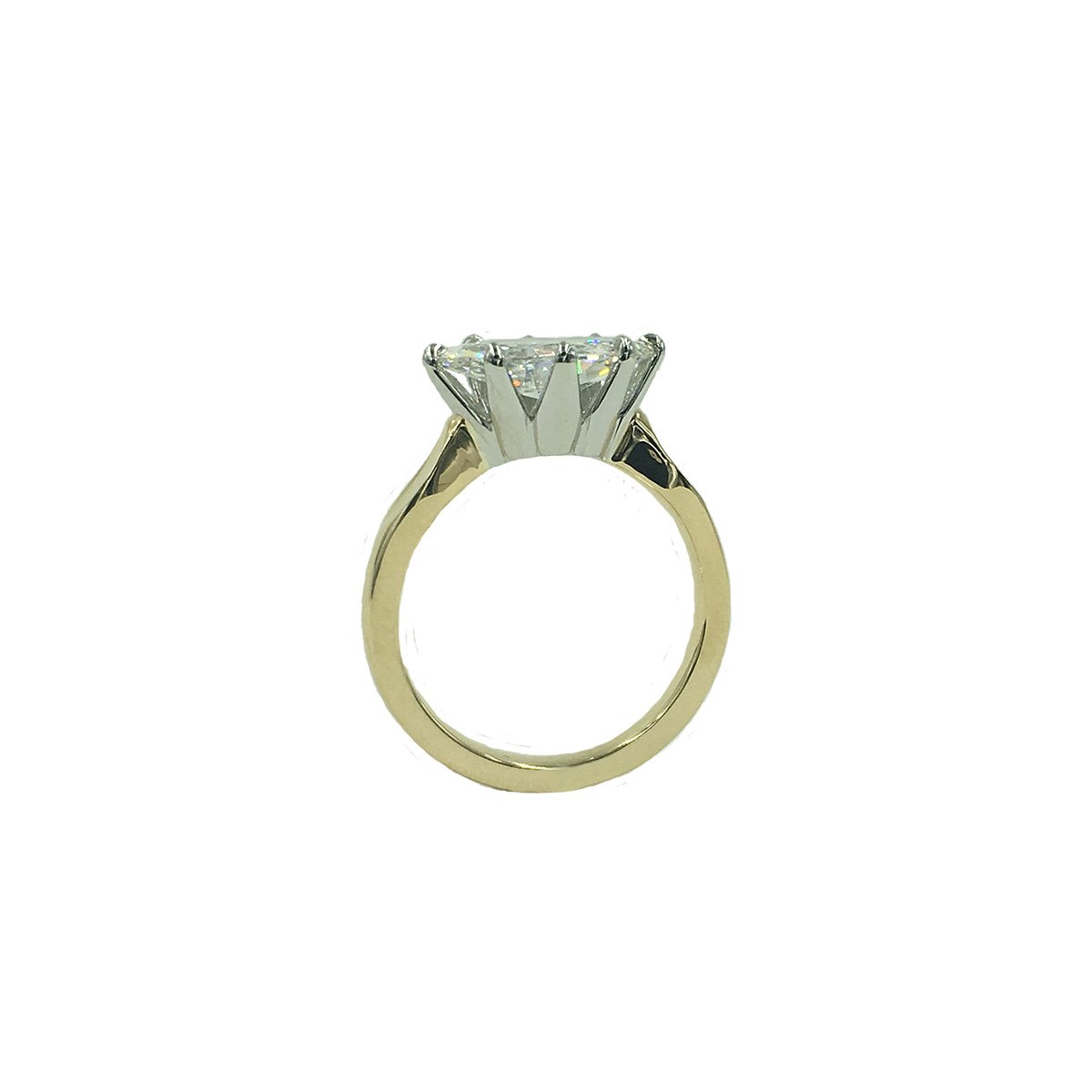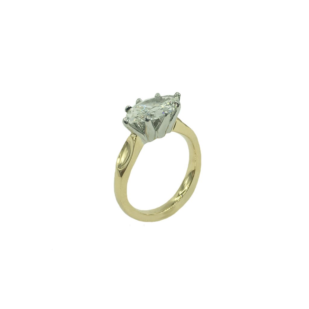 This is truly a one of a kind – an 18K Yellow Gold Shank with a petal design and Platinum Head and Mounting meet together perfectly at the top of the ring, with a stunning marquise cut diamond.