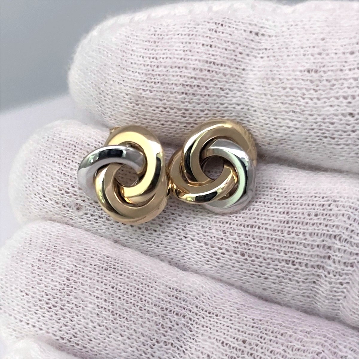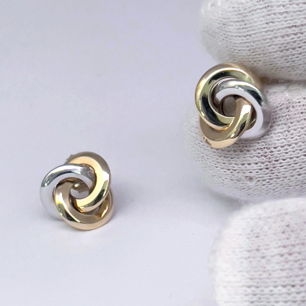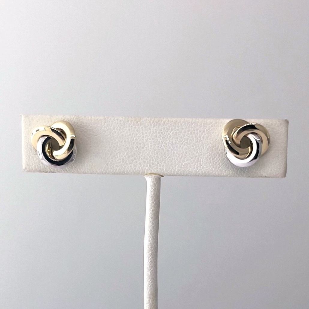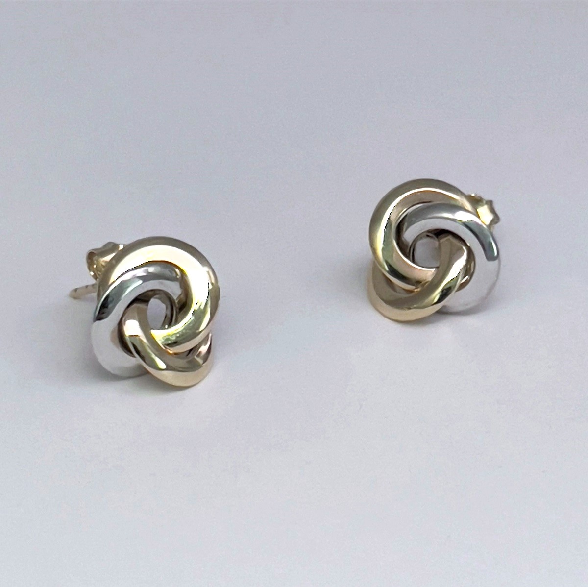This two tone stud earrings are made with 14k yellow and white gold. These yellow and white gold knots are often used to symbolize unity.