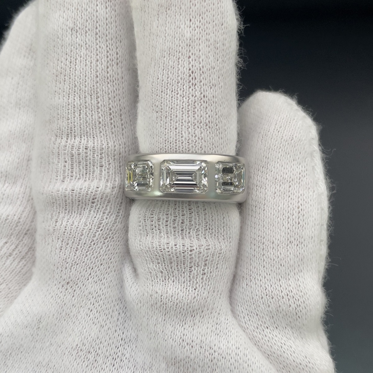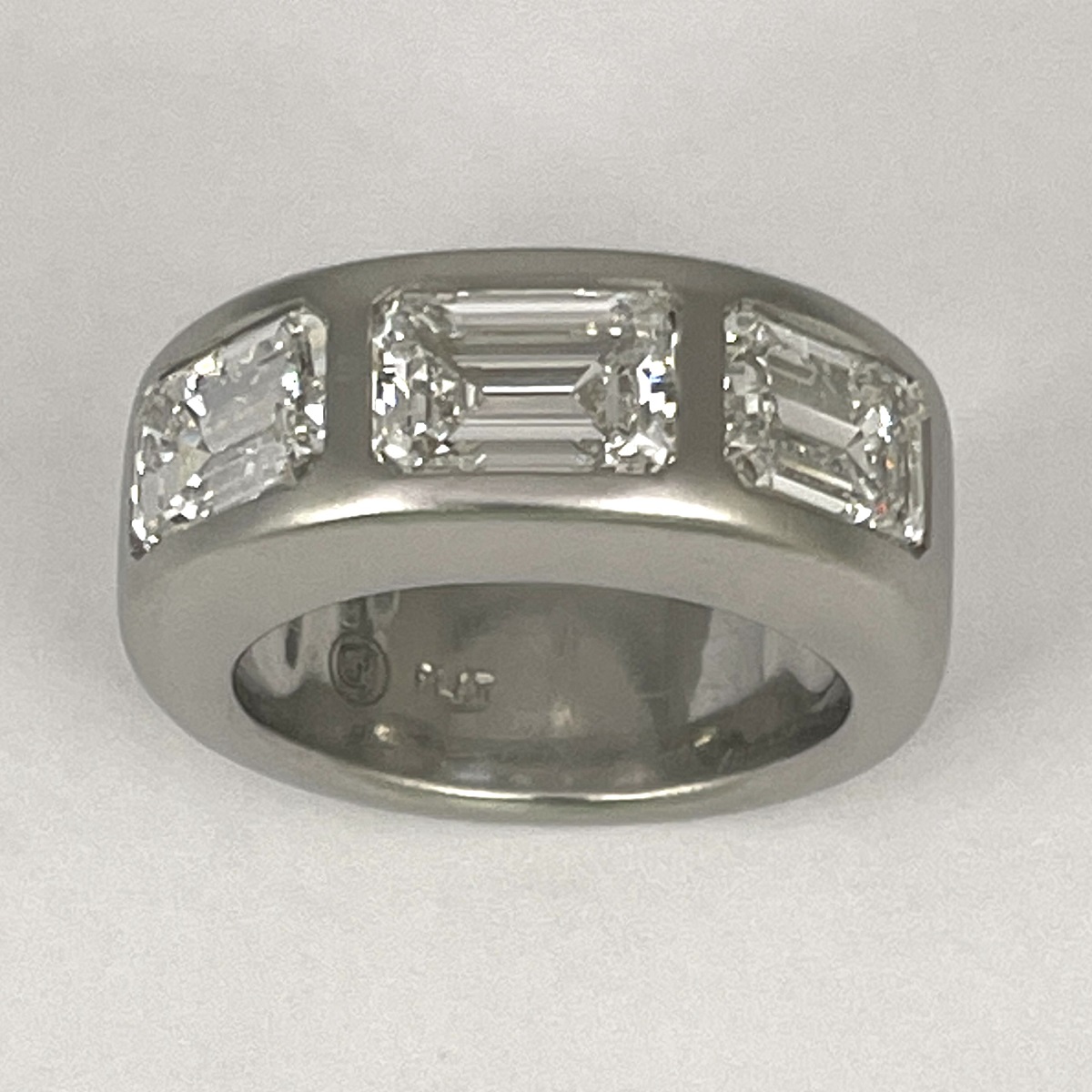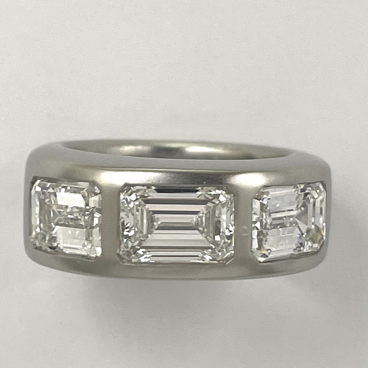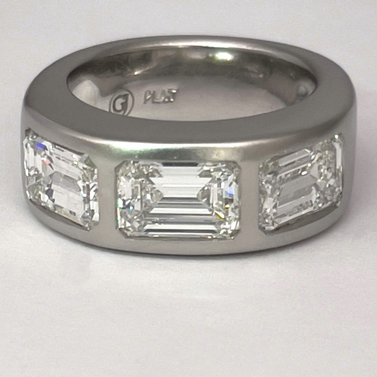 This striking custom made diamond platinum ring is made with three appreciable emerald cut natural diamonds, burnished set into the ring’s shank.