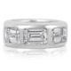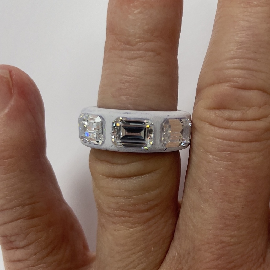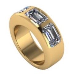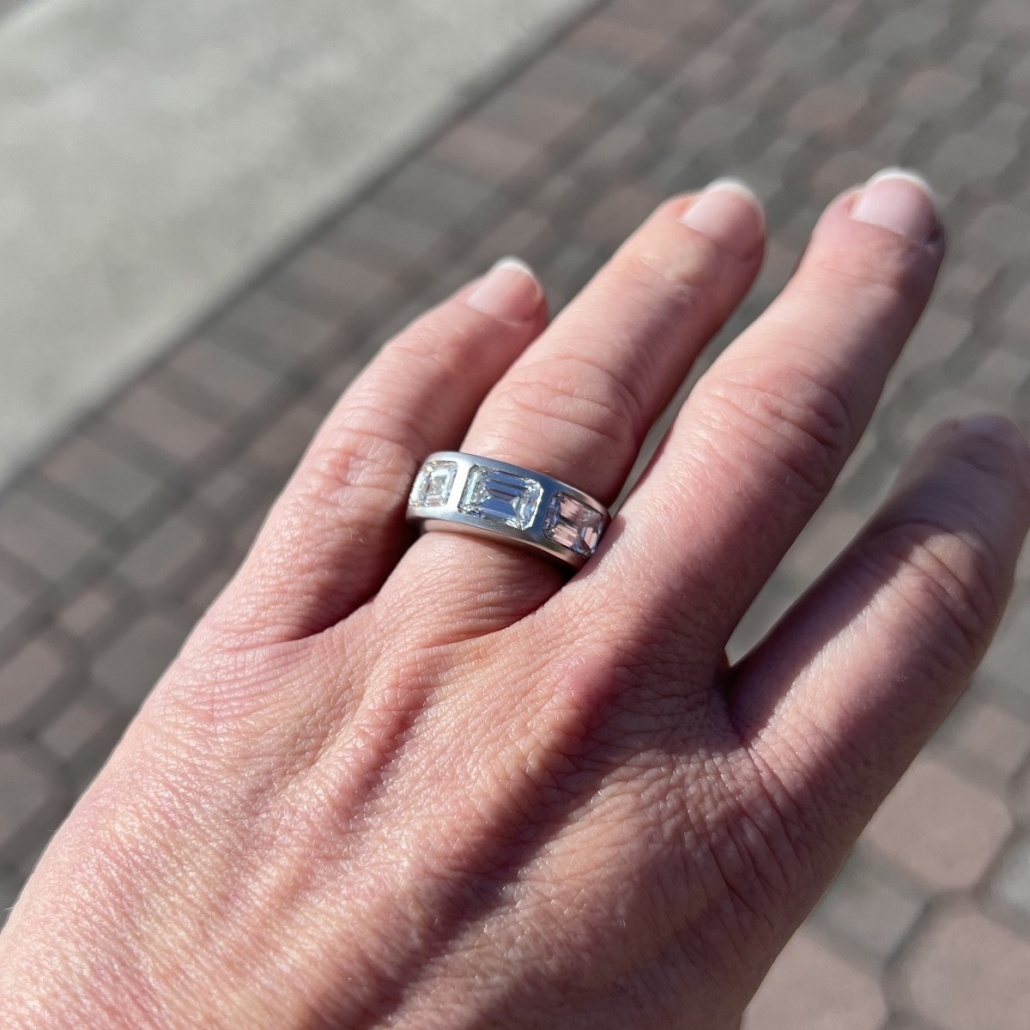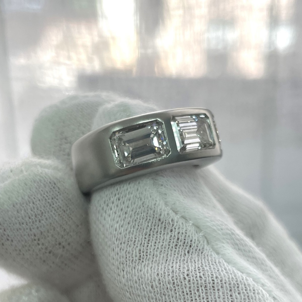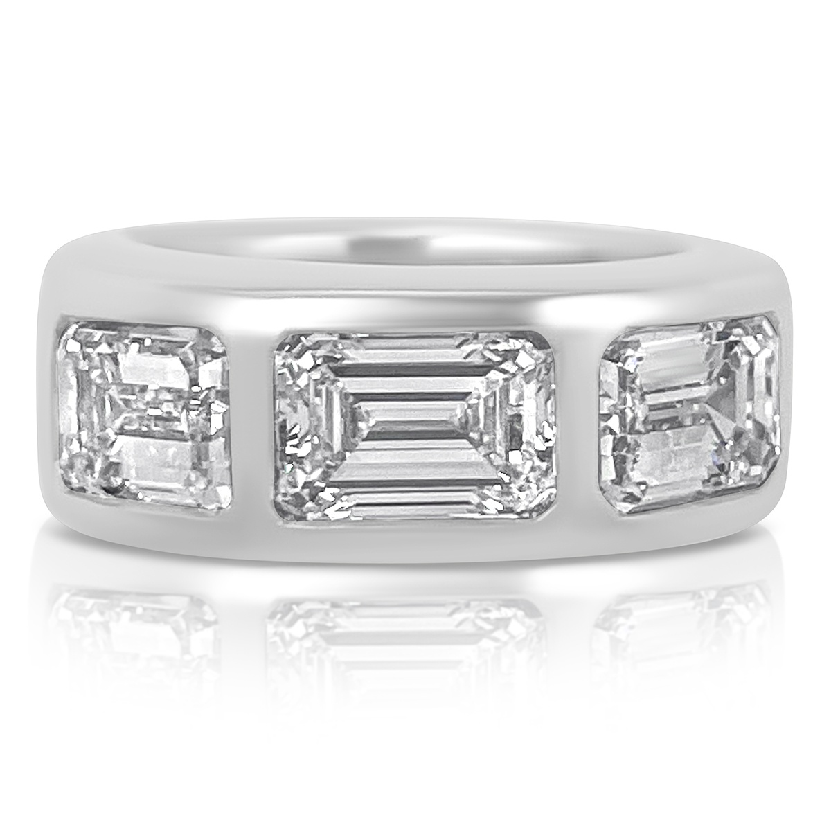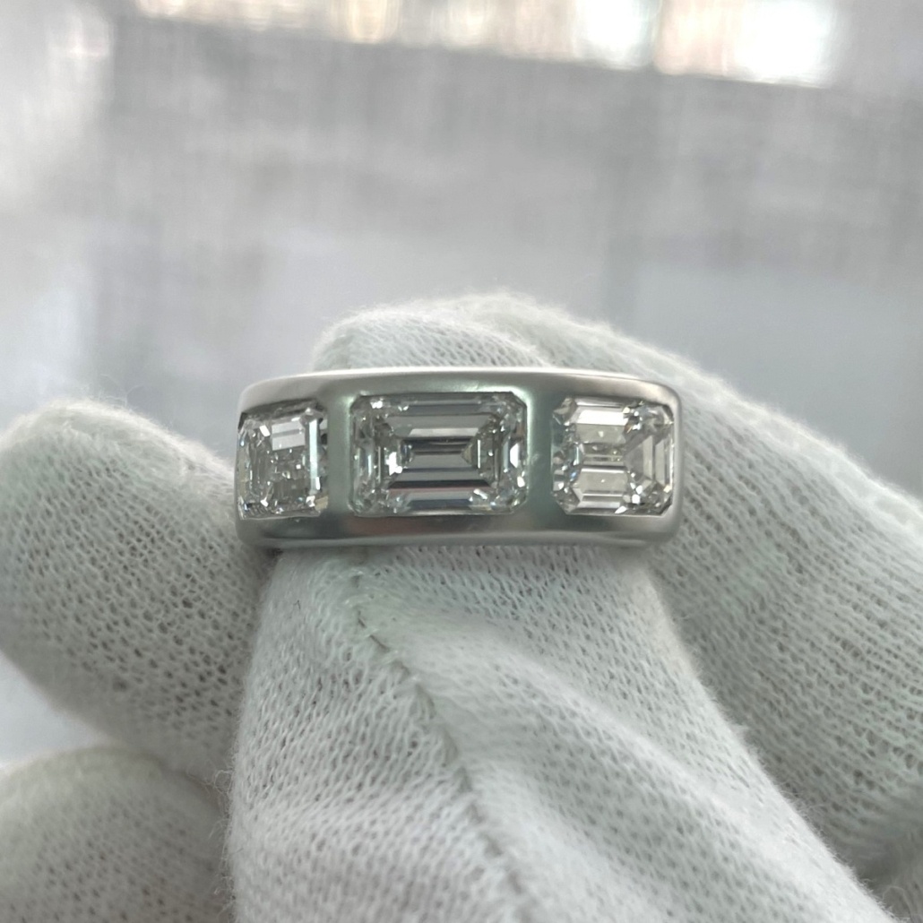 This striking custom made diamond platinum ring is made with three appreciable emerald cut natural diamonds, burnished set into the ring’s shank.