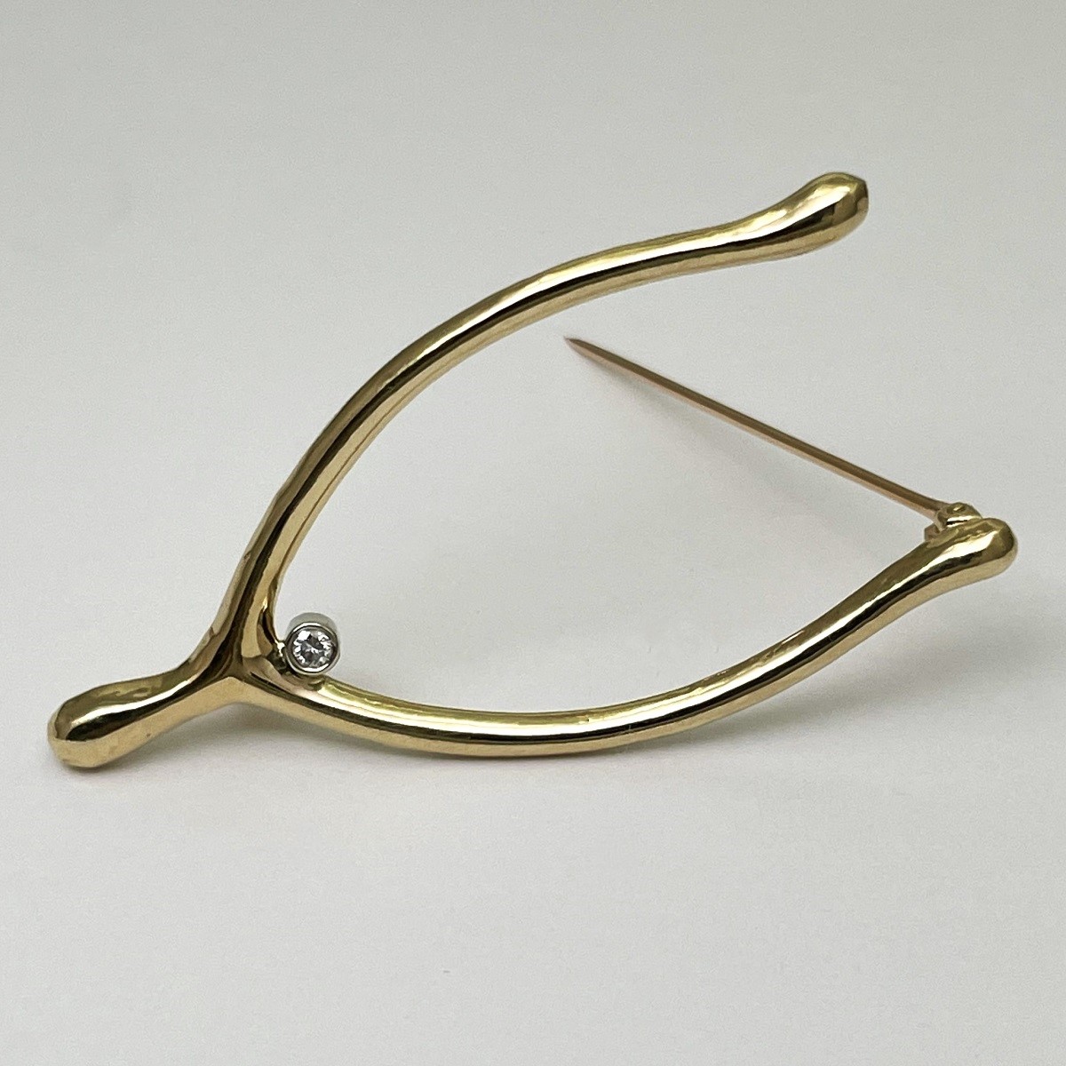 This brooch is made with 14k yellow gold and a round brilliant diamond.
