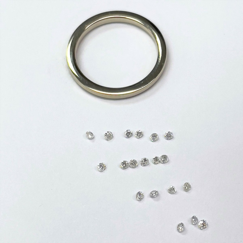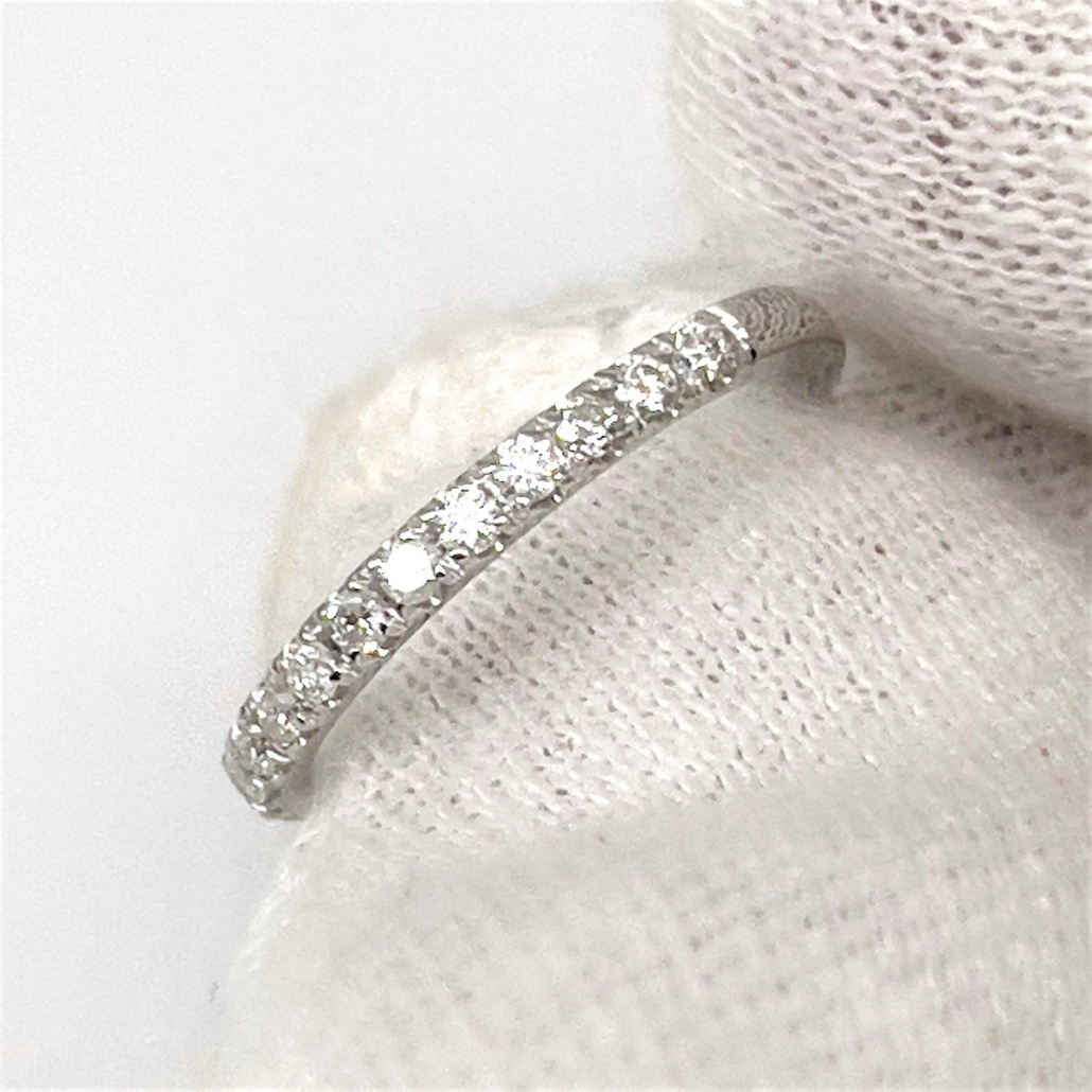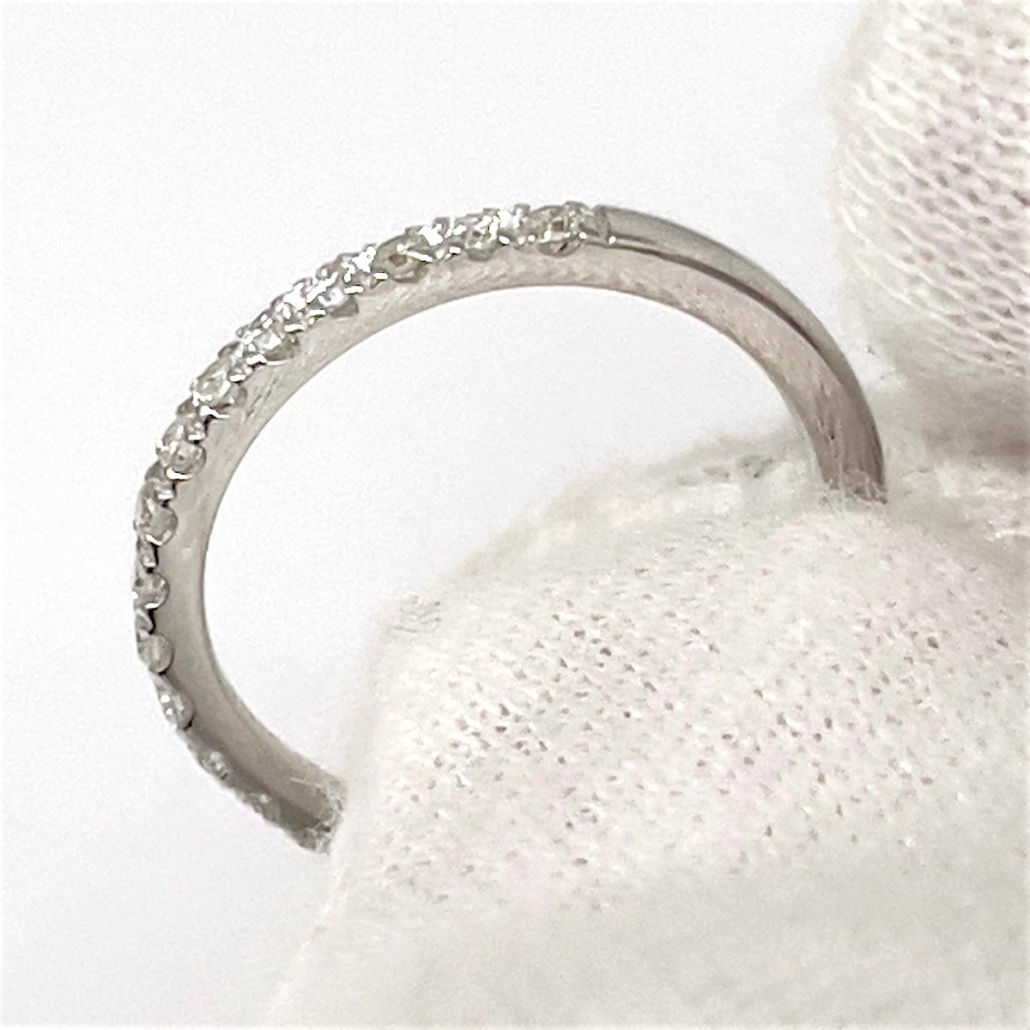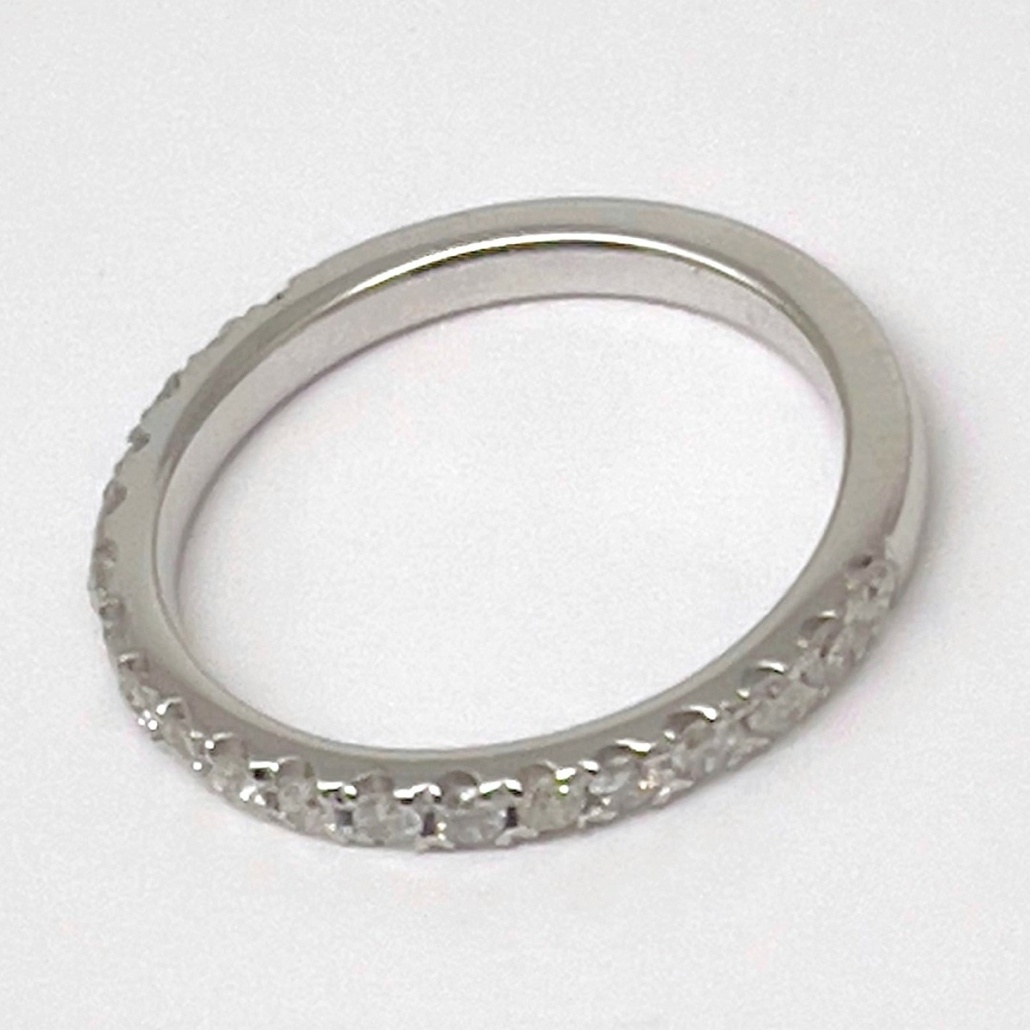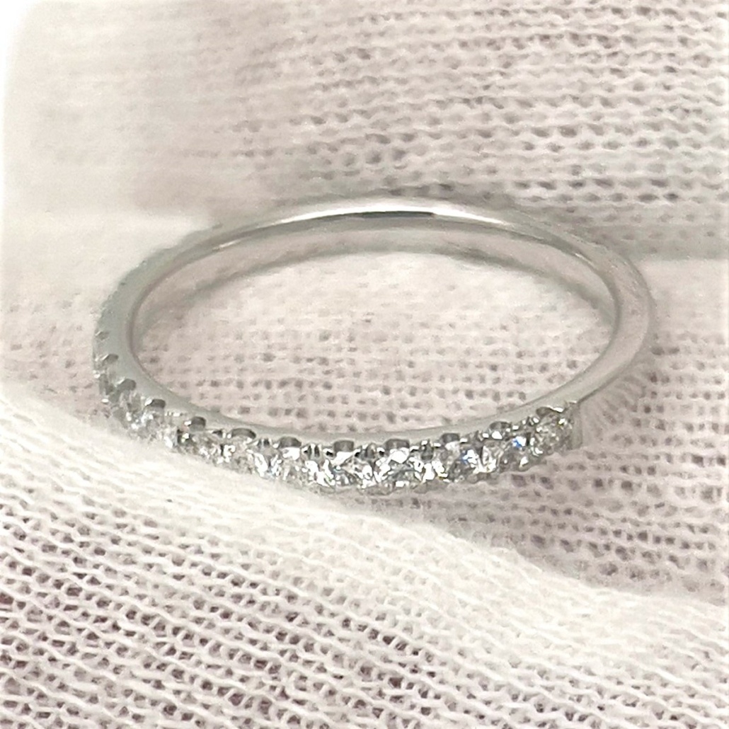 This ring is made with 14k white gold, set with diamonds on the shank.