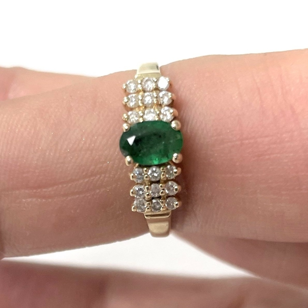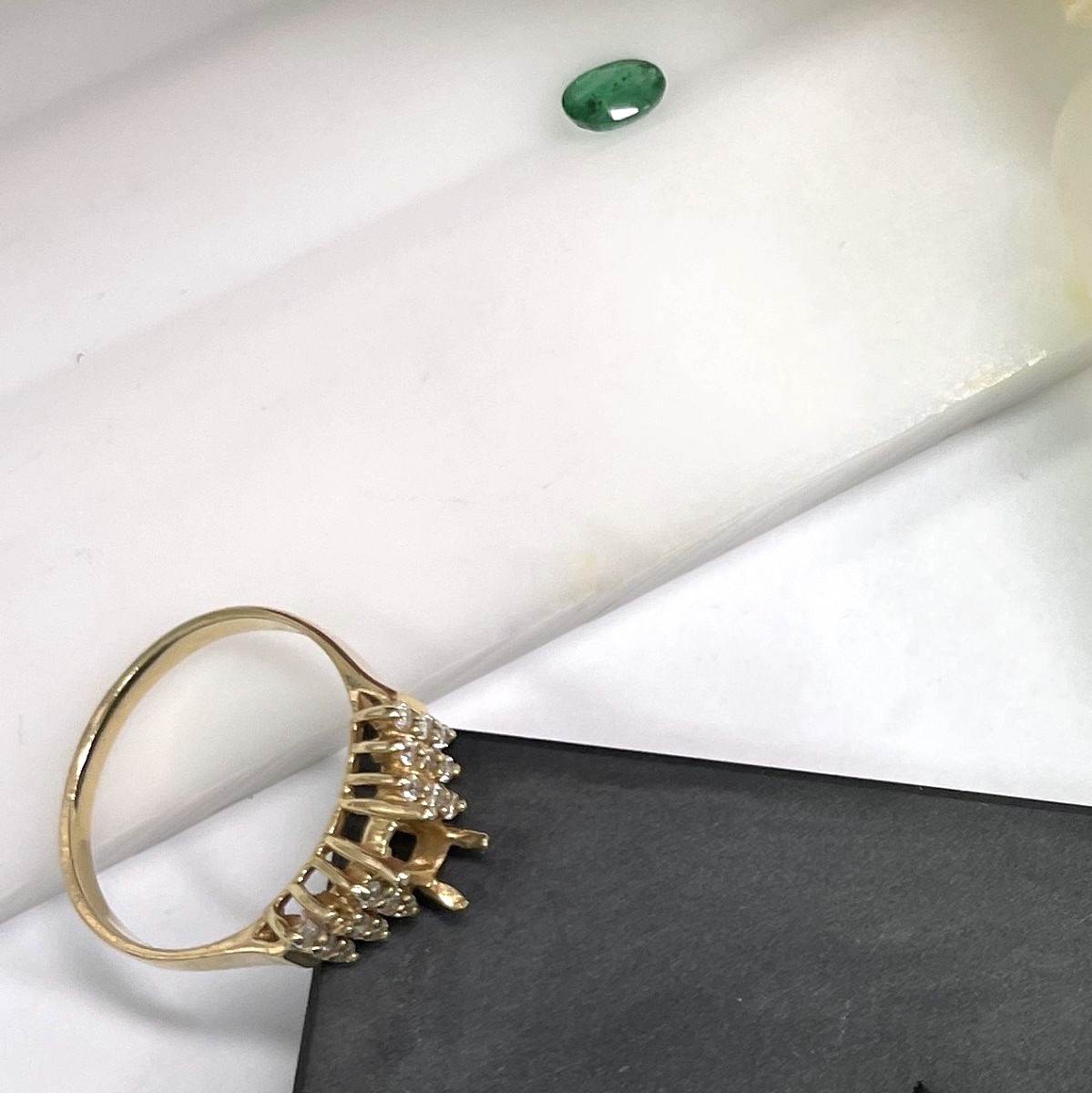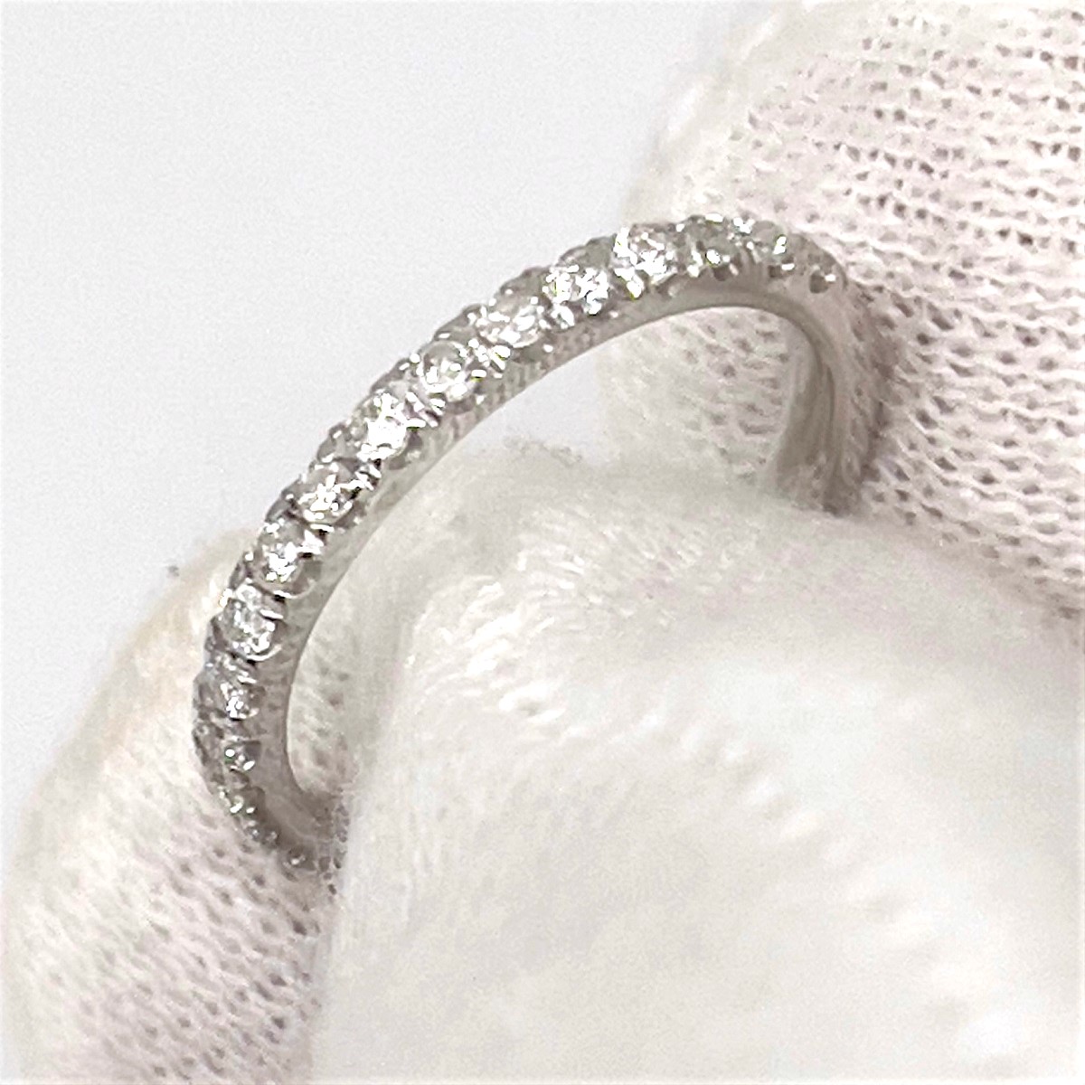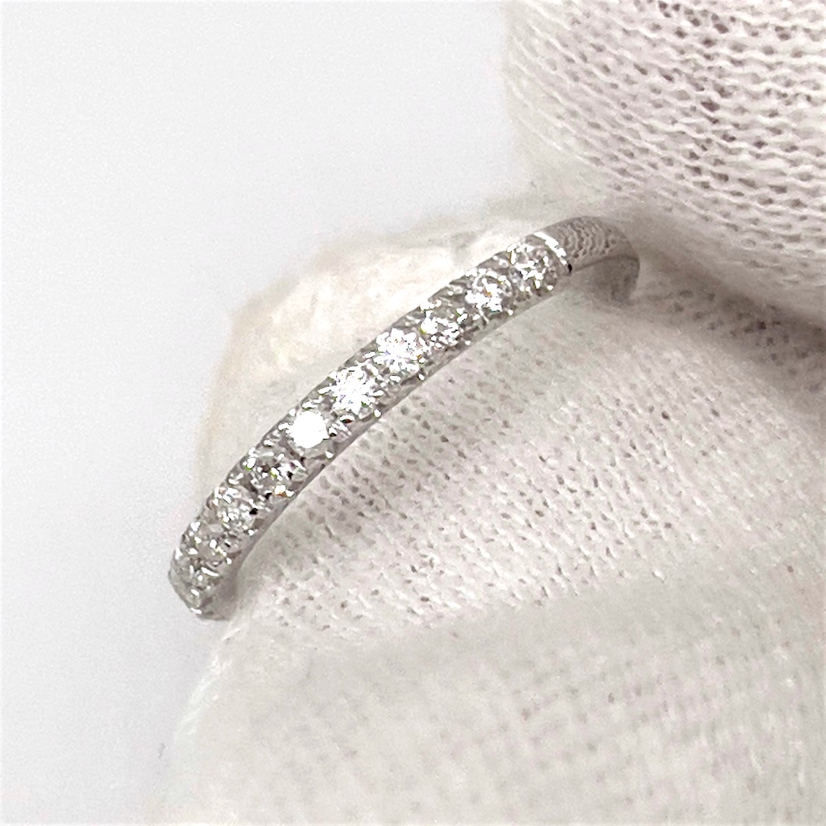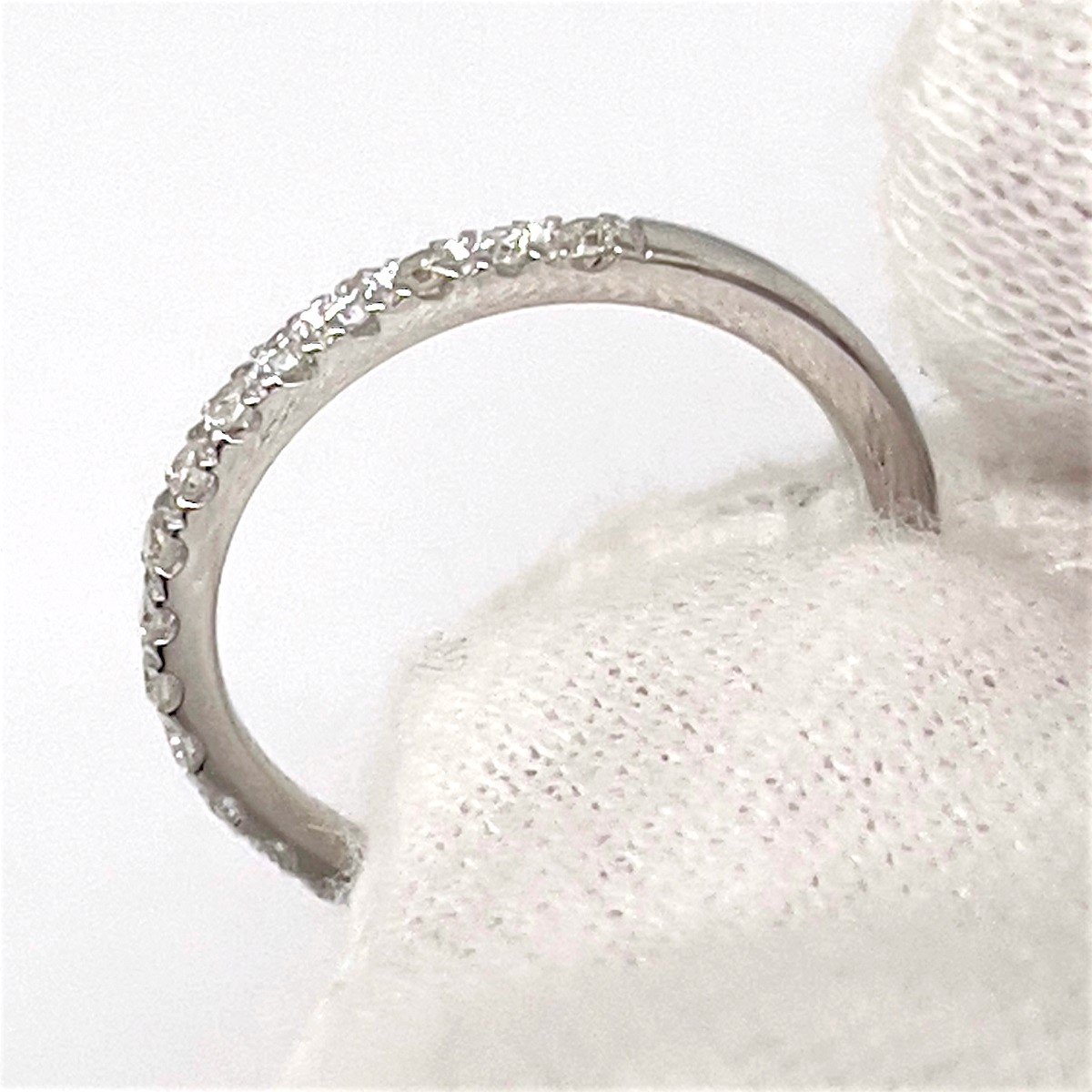 This ring is made with 14k white gold, set with diamonds on the shank.