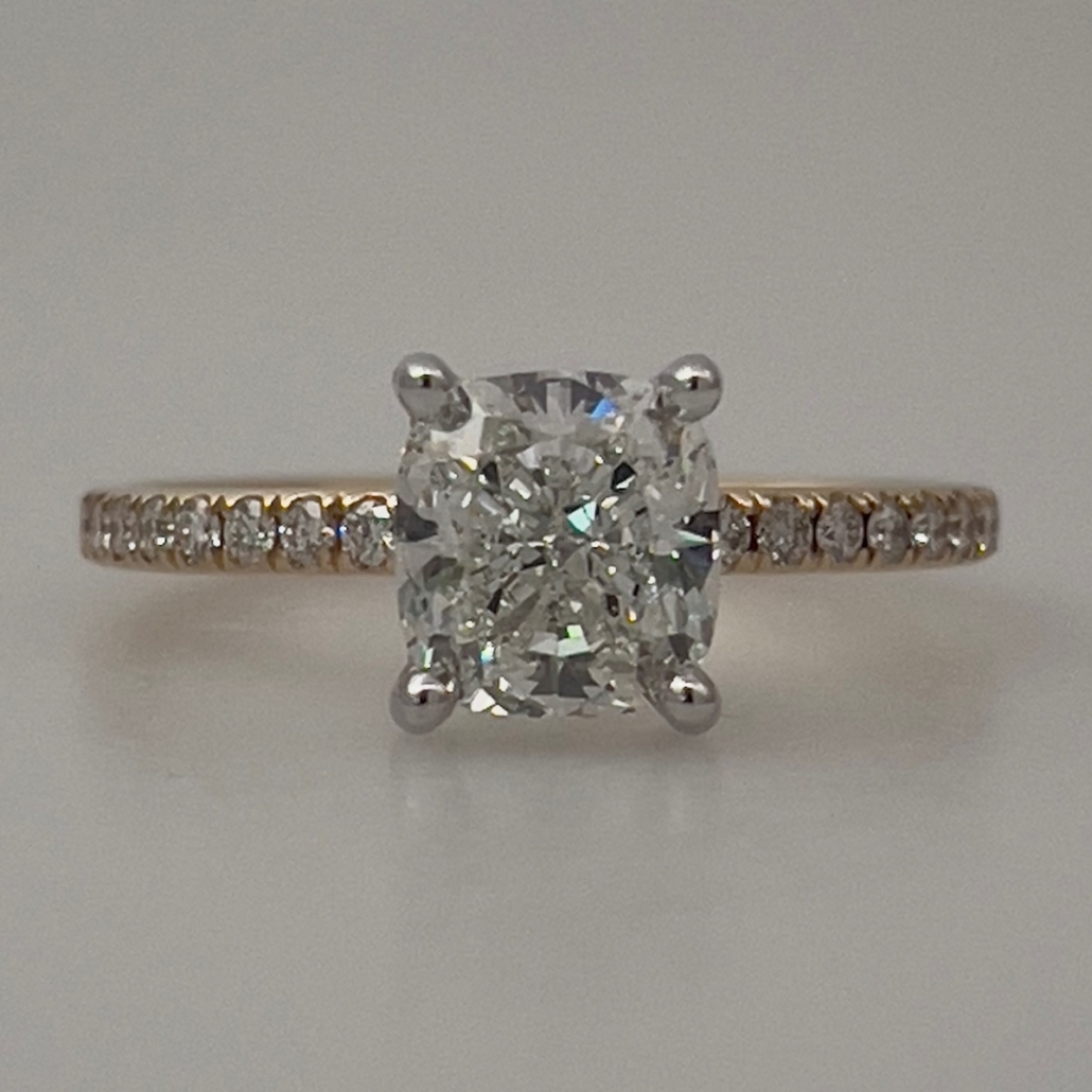 Gorgeous cushion cut halo, with diamonds on the shank.