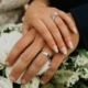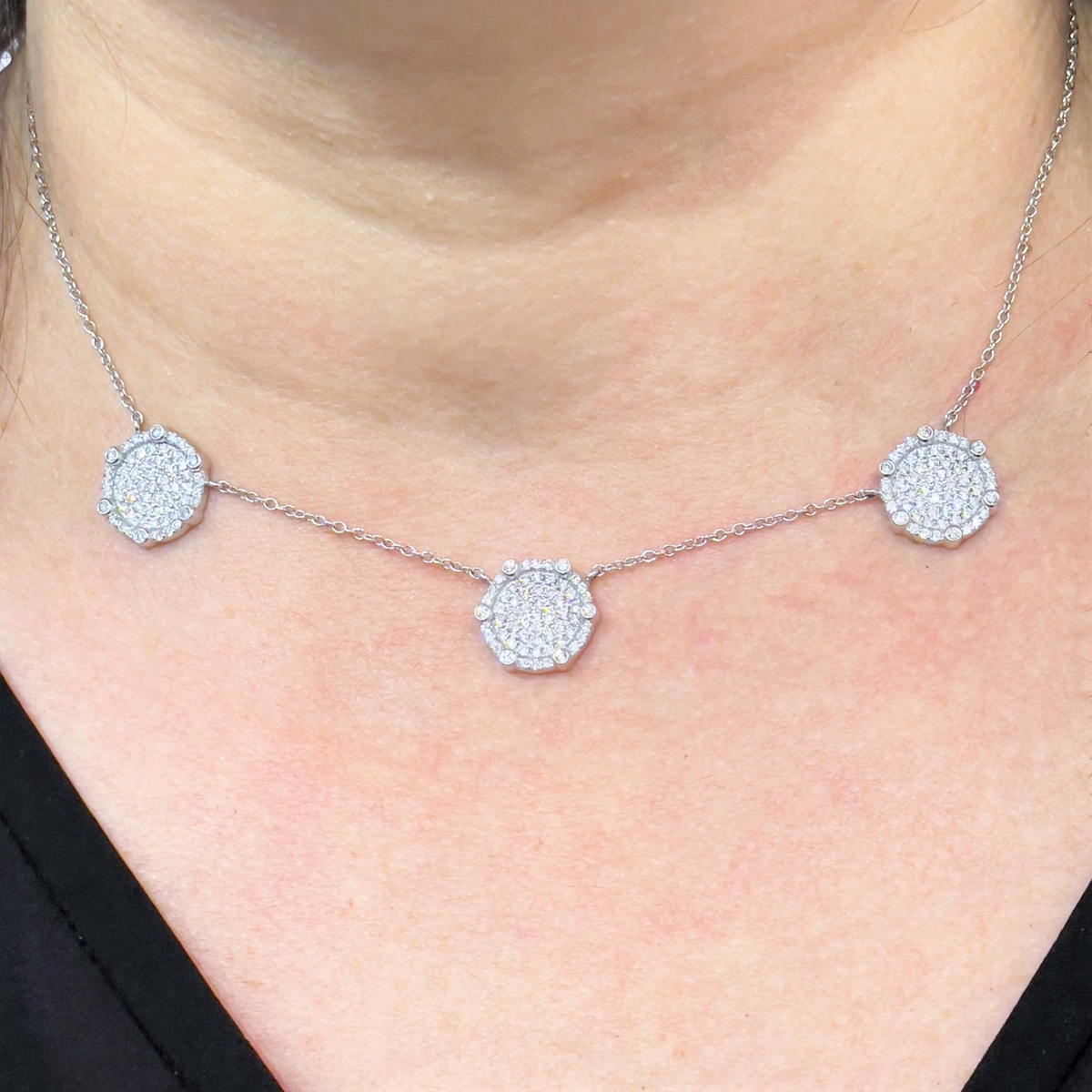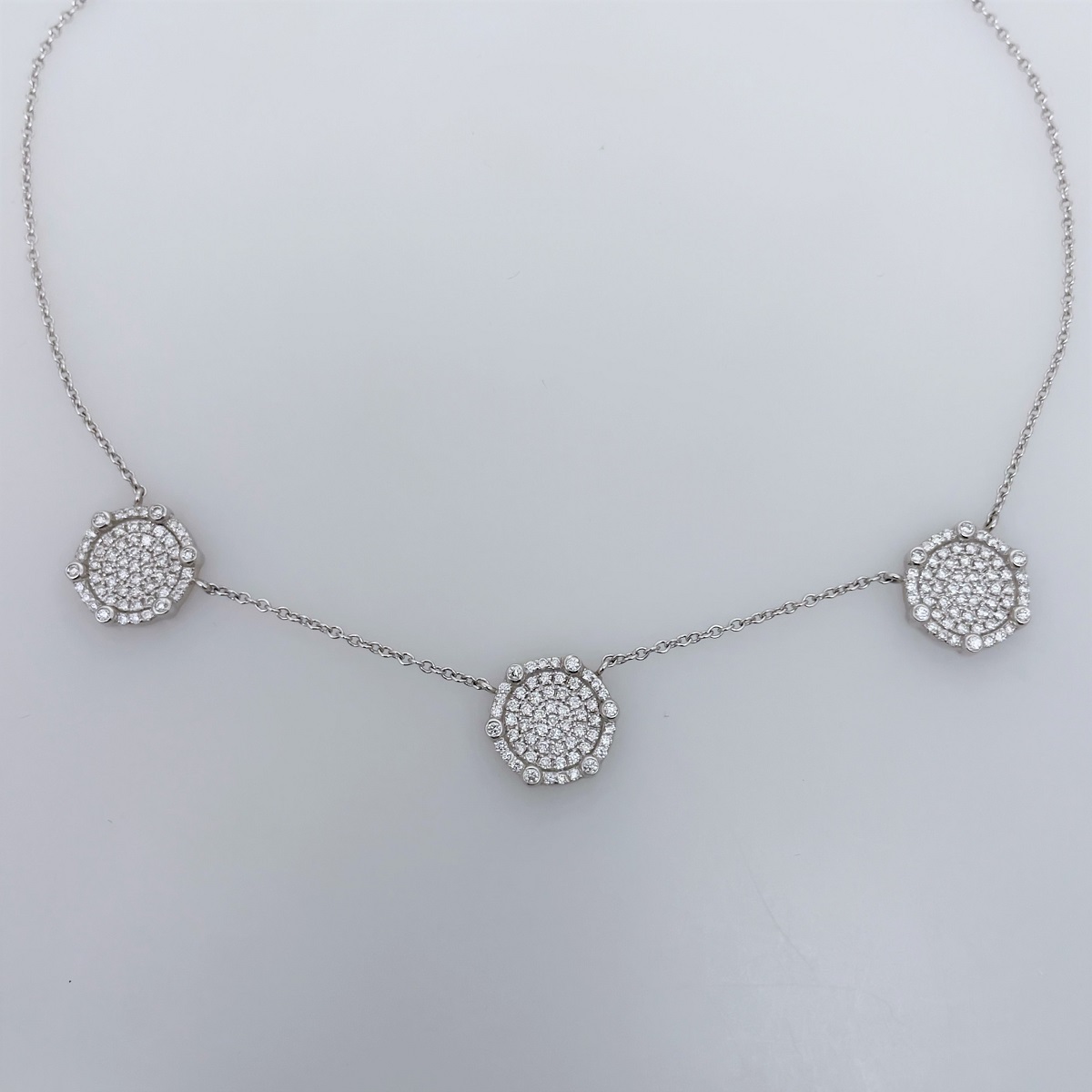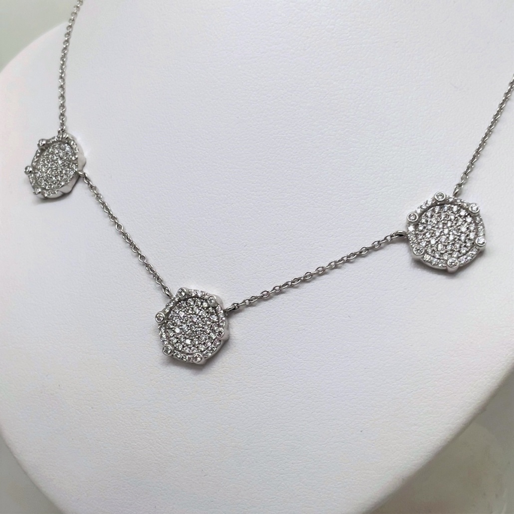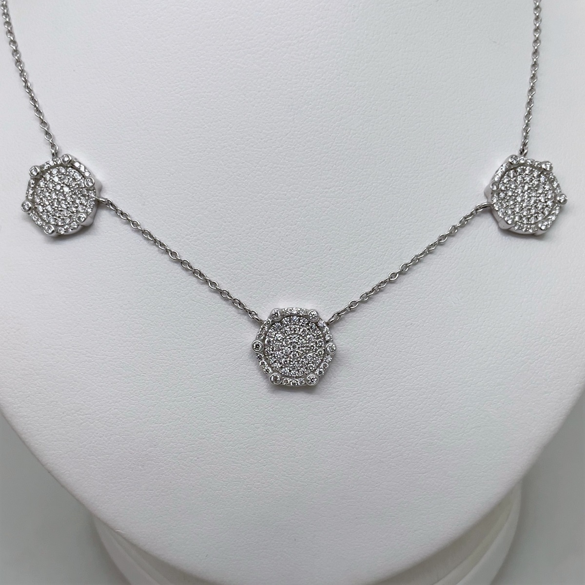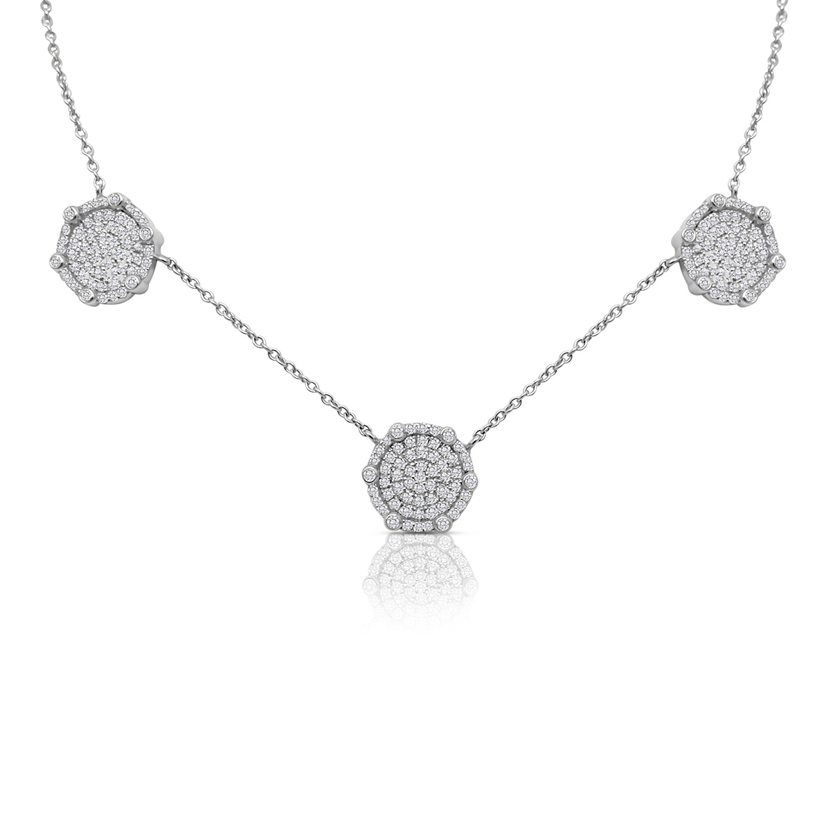 14k White Gold Necklace With Three Round Diamond Clusters, each in a White Gold Hexagon Frame