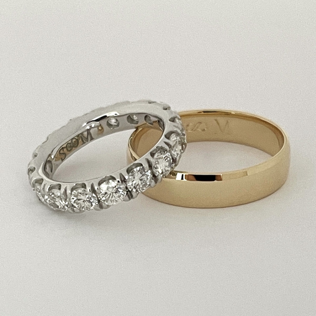 Traditional wedding band with beveled edge. Made with 18k yellow gold and the two soulmates initials engraved with eternity symbol.
