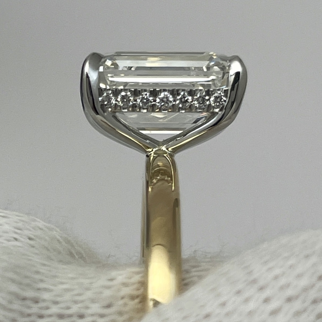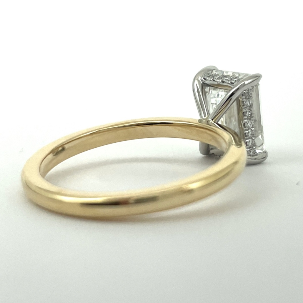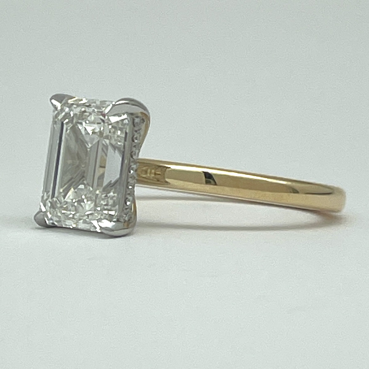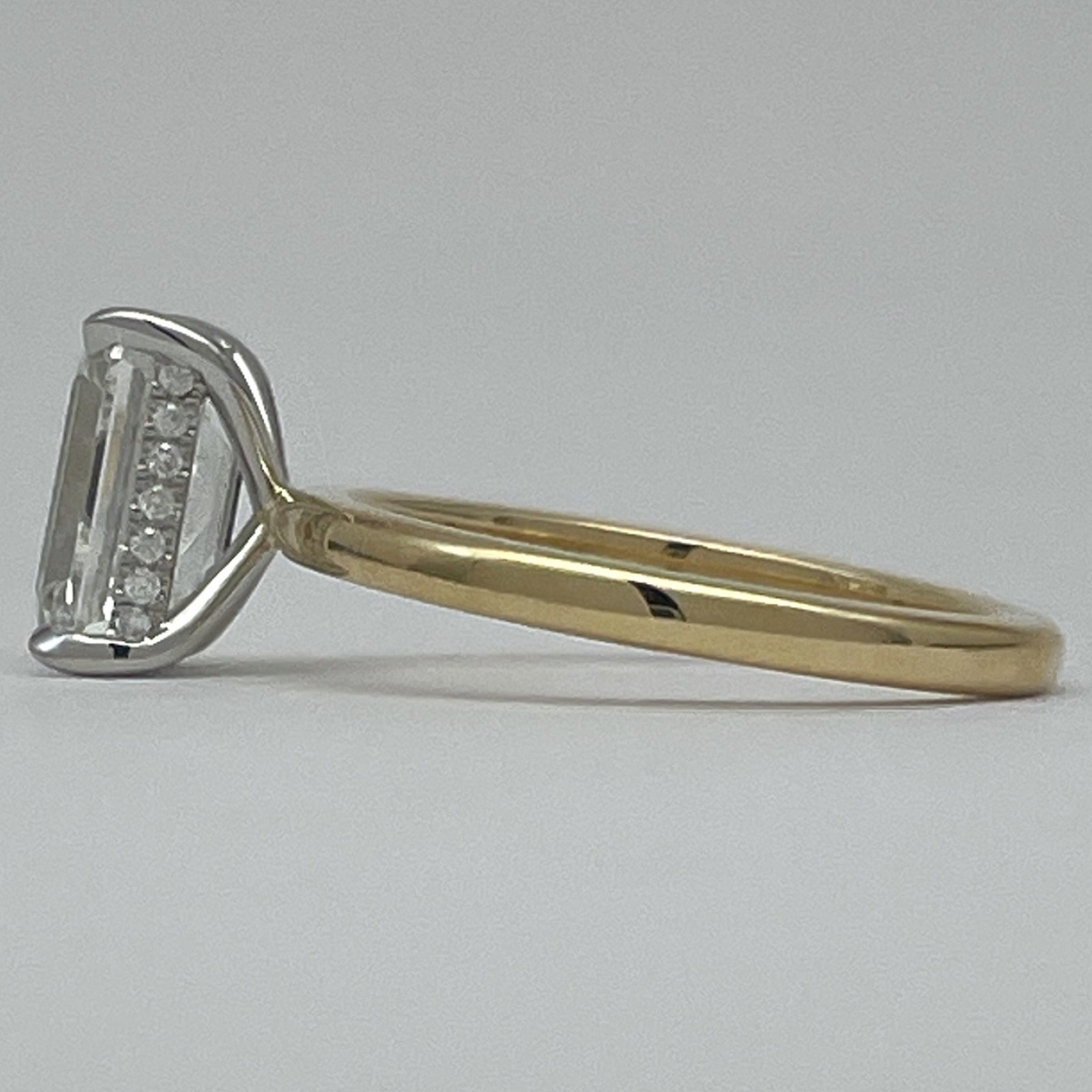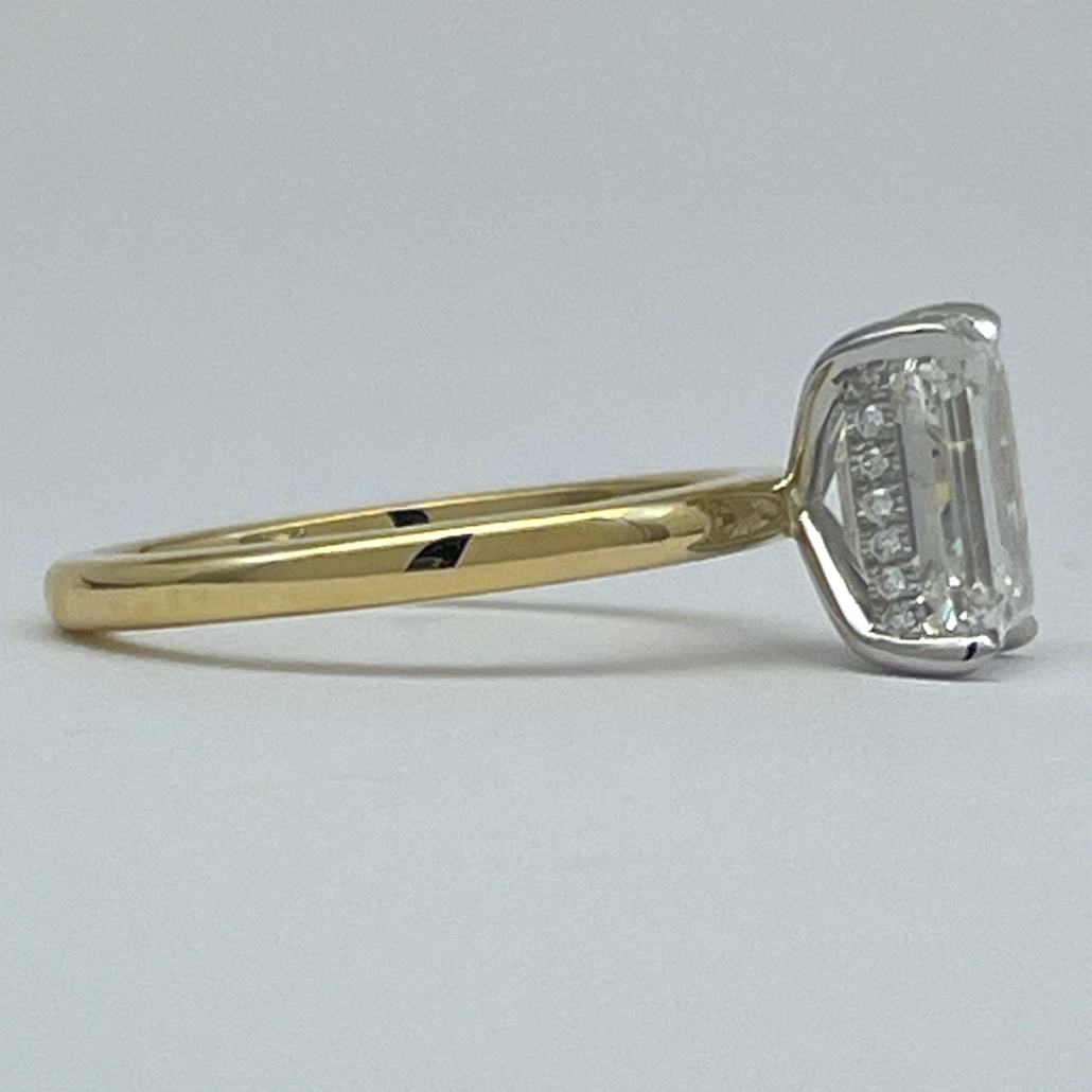A future heirloom with a minimalist heart. The emerald-cut diamond floats above a polished yellow gold band, held aloft by a white gold setting that hides a line of dazzling accent stones just beneath the surface.