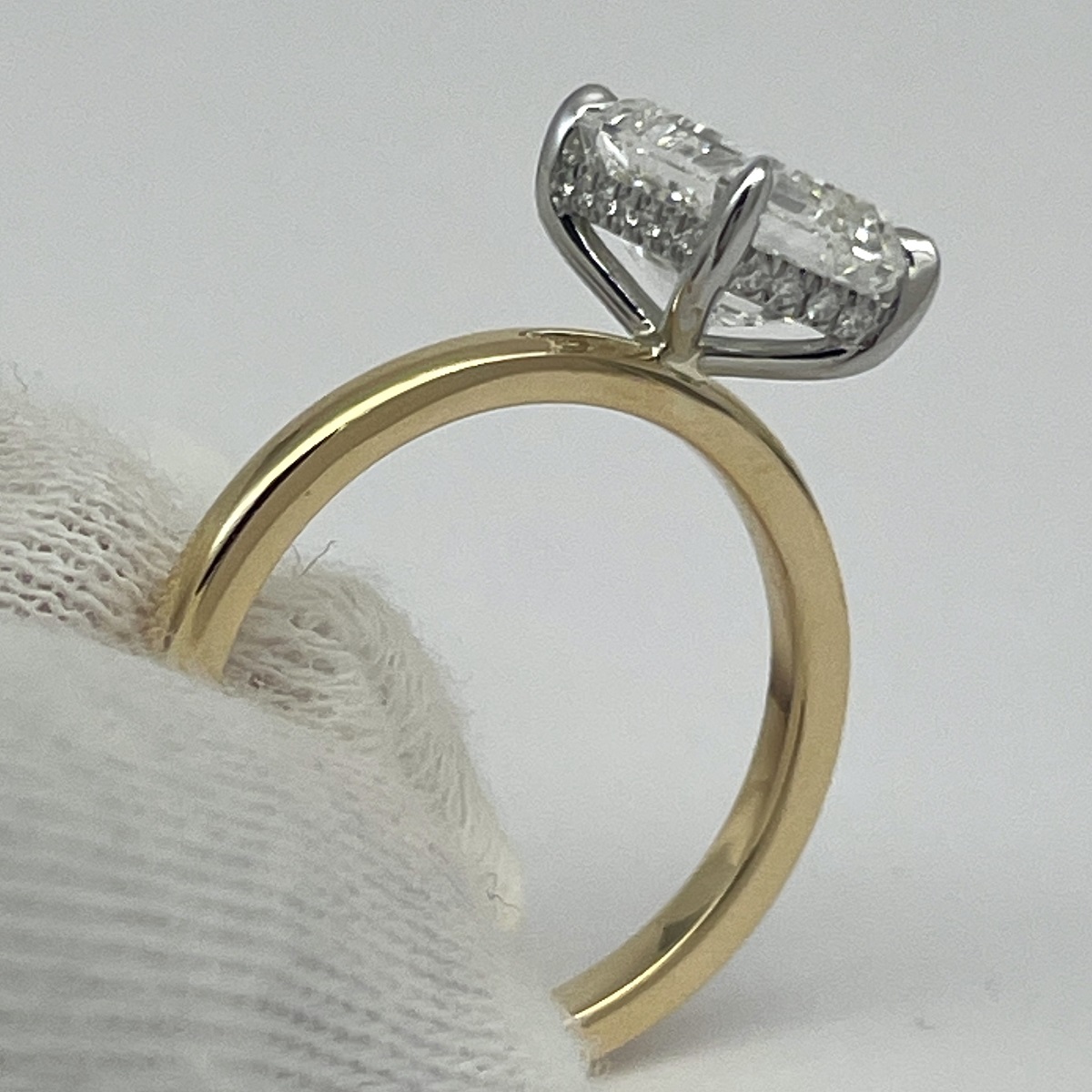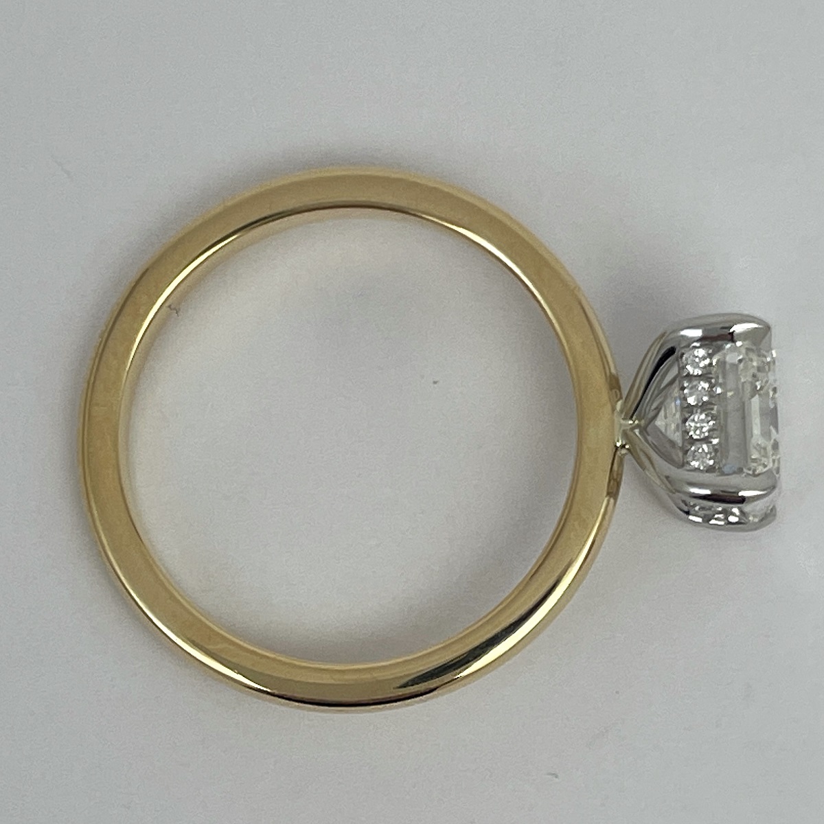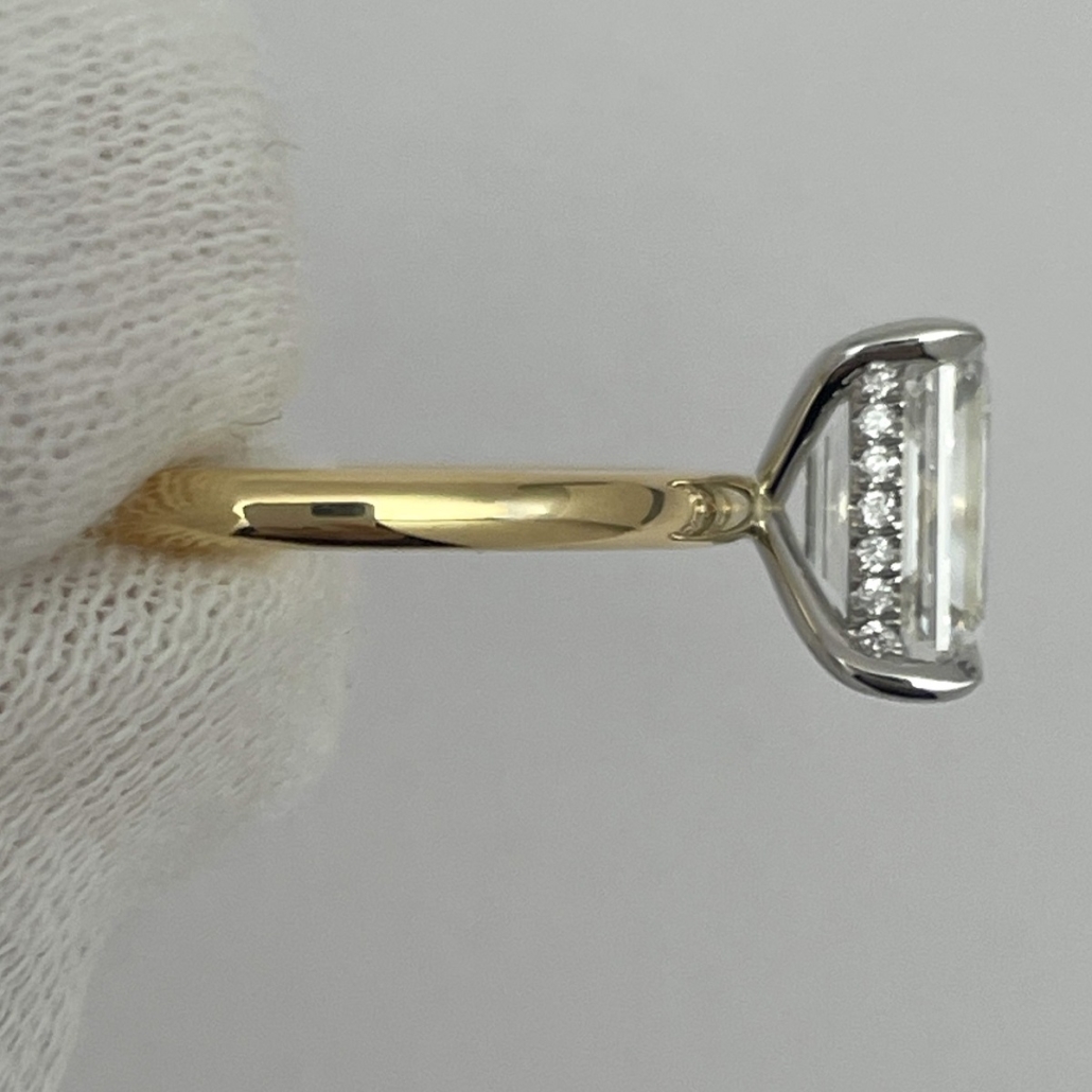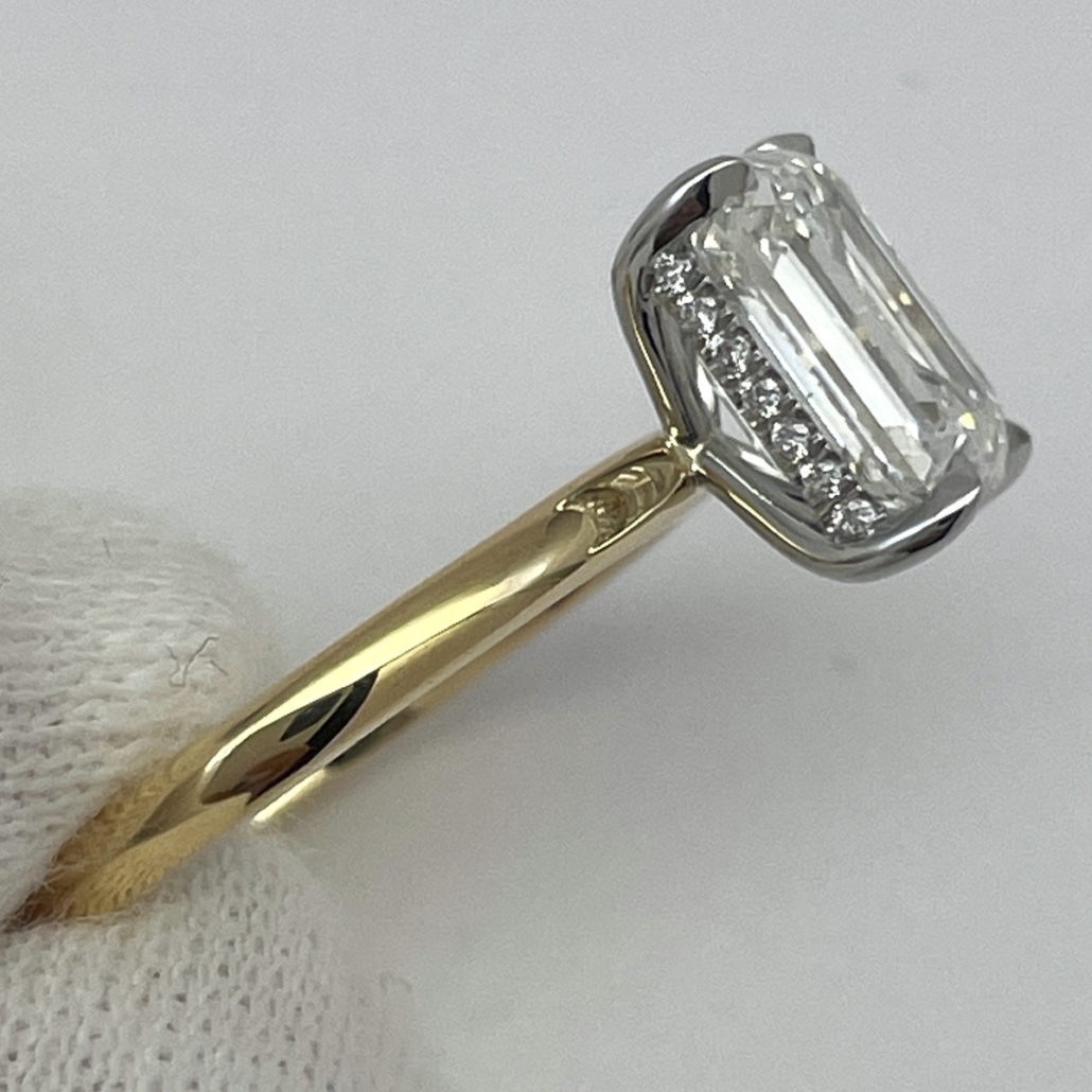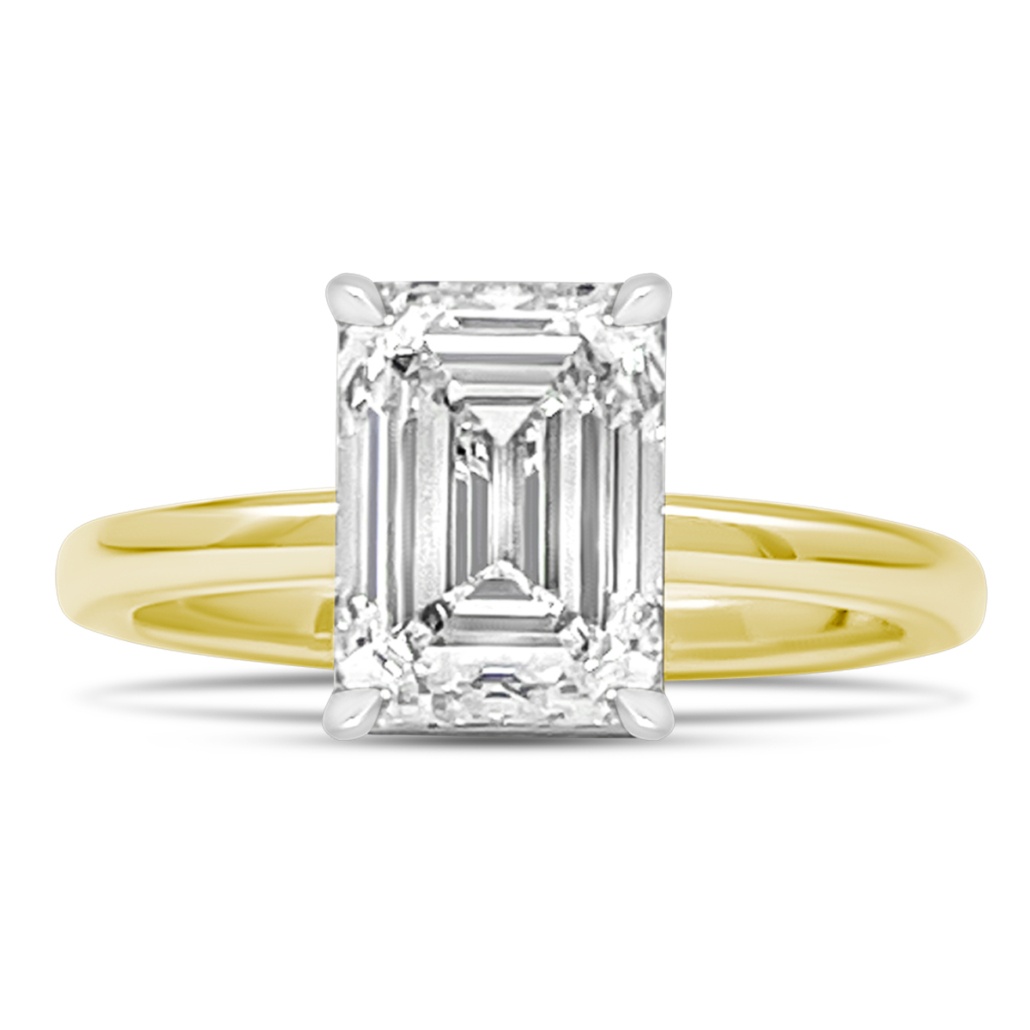 A future heirloom with a minimalist heart. The emerald-cut diamond floats above a polished yellow gold band, held aloft by a white gold setting that hides a line of dazzling accent stones just beneath the surface.