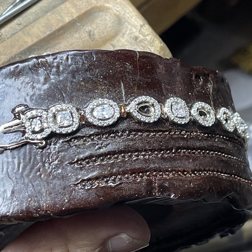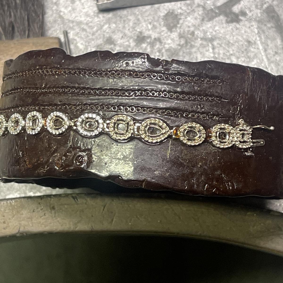 This bracelet is made with 14k white gold and prong set with diamonds.